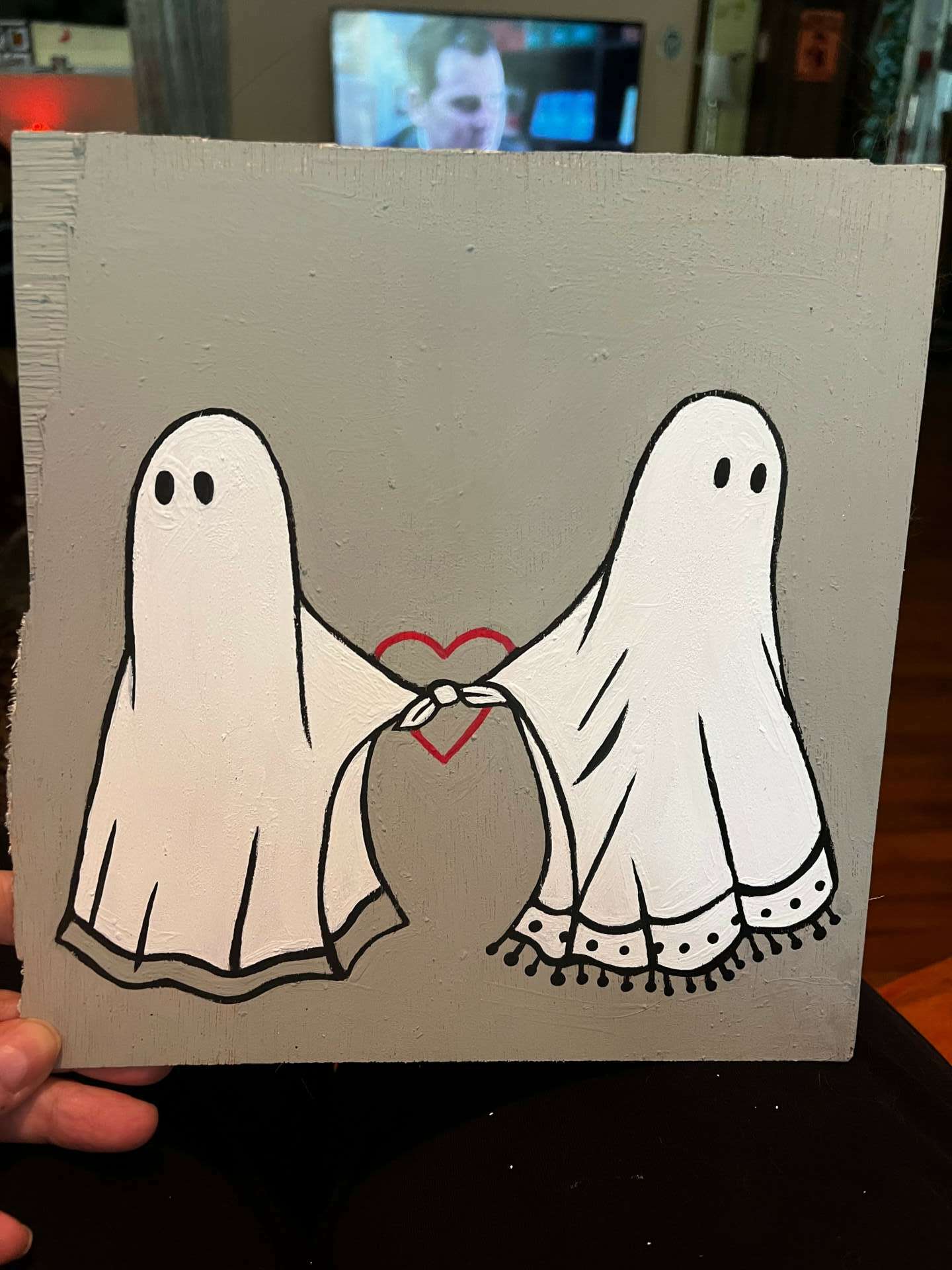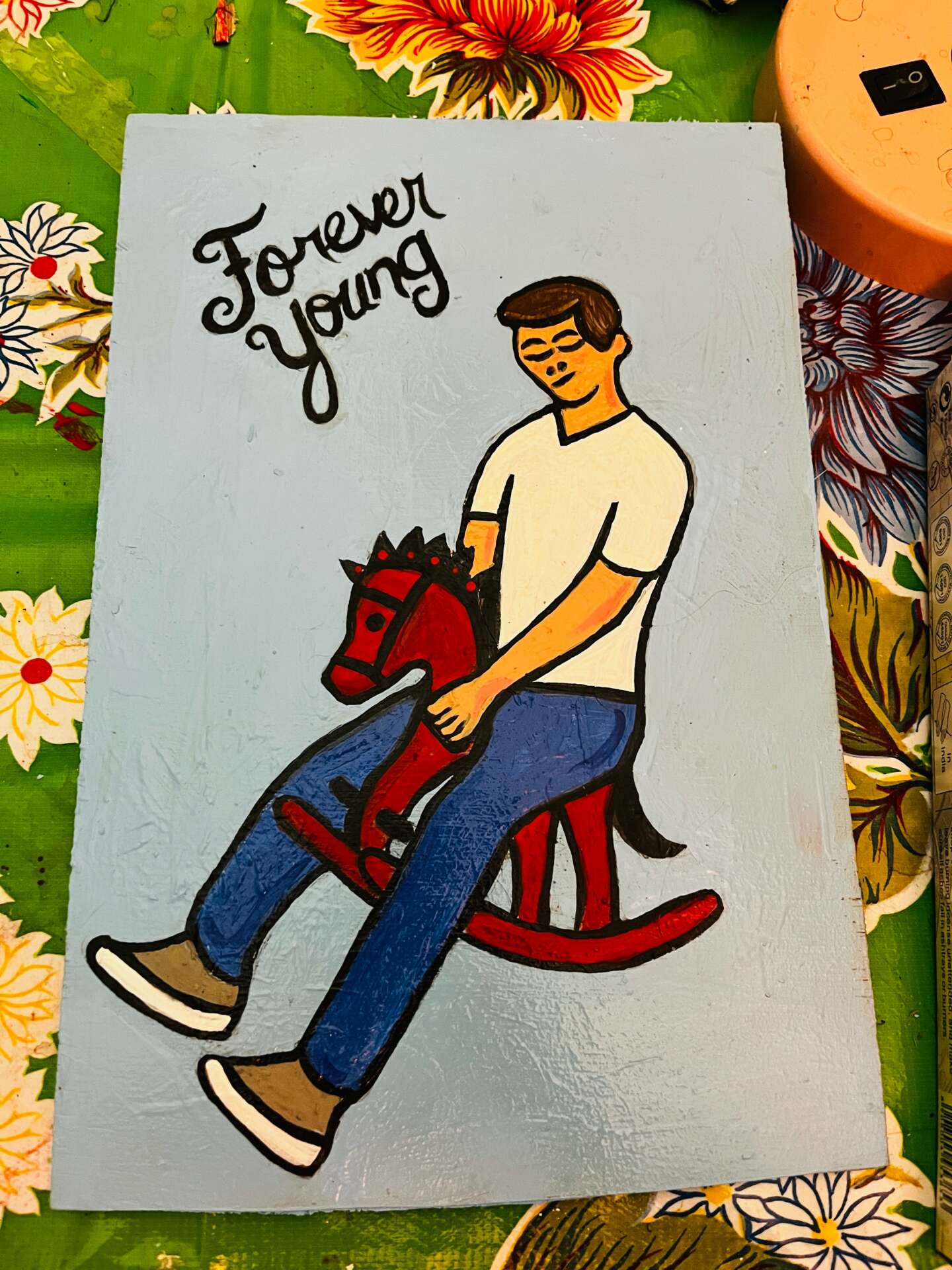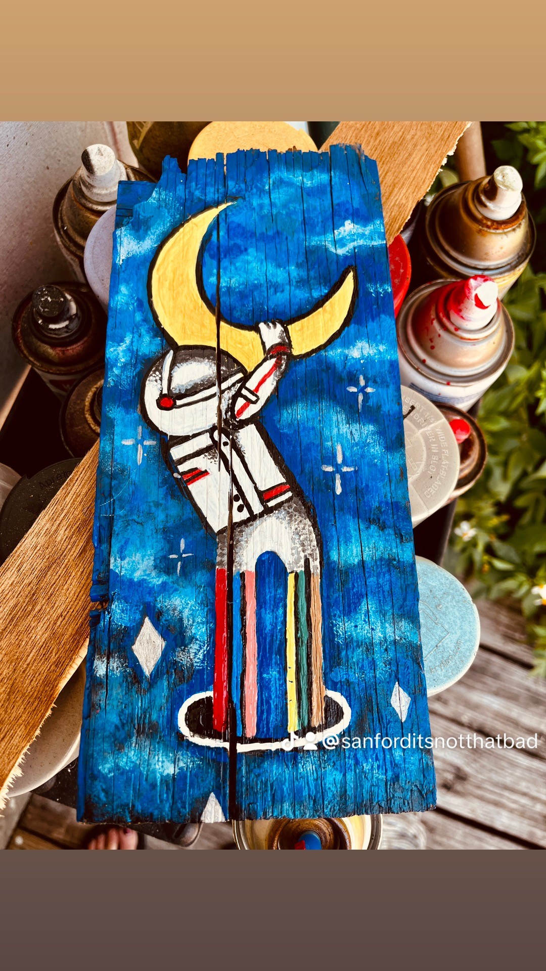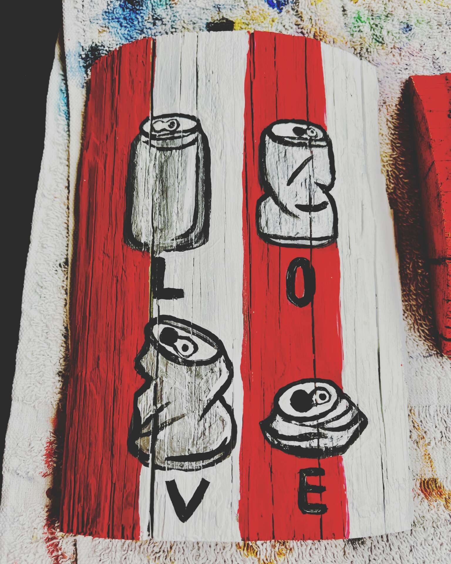 I’ve always been an artist. As a child, I had crayons and paints, that kept me busy. Mostly paint on metal and found wood but I do like weird stuff that’s not typically painted on like nails, lunchroom, trays, and making night lights out of spam cans.