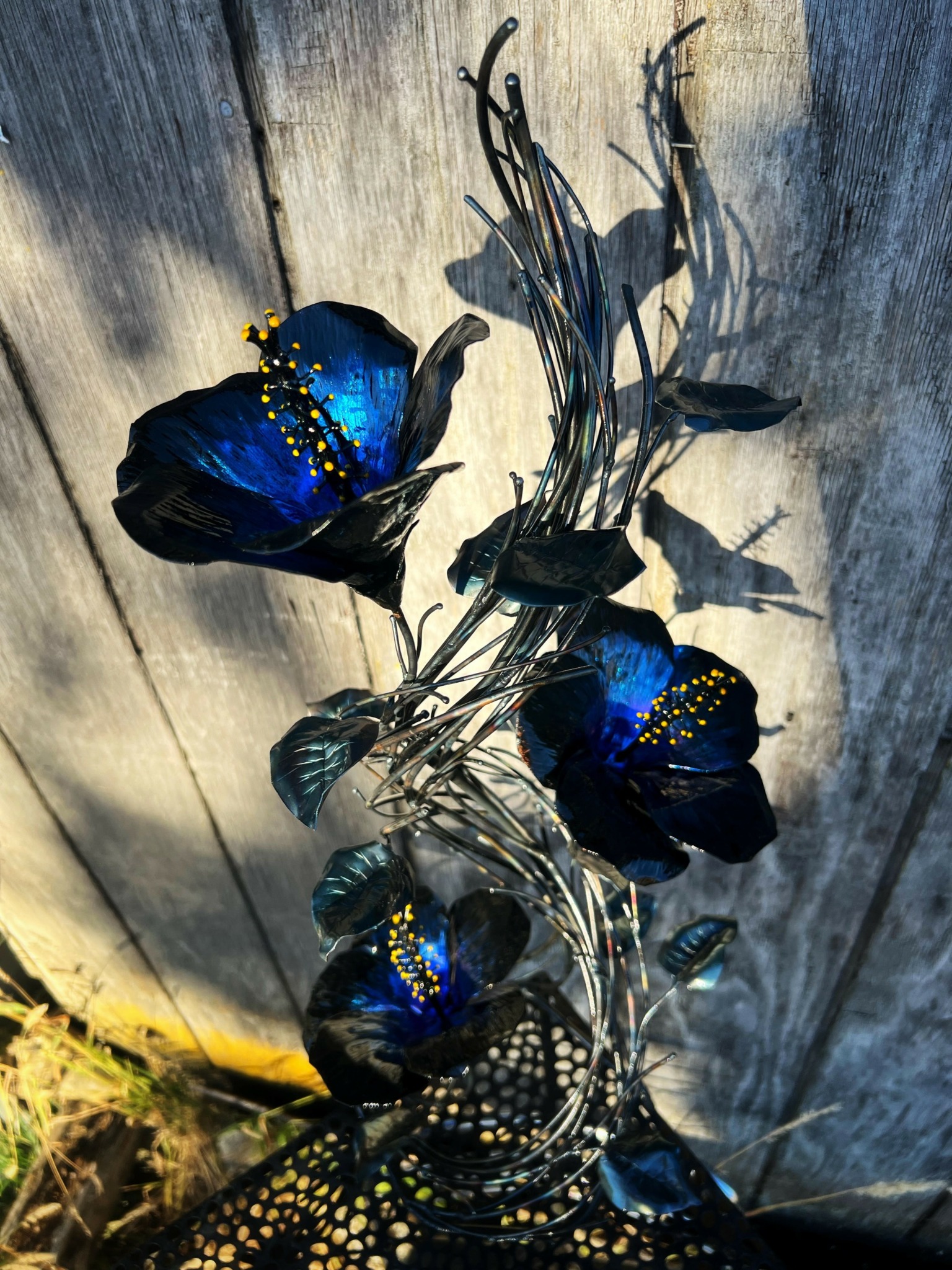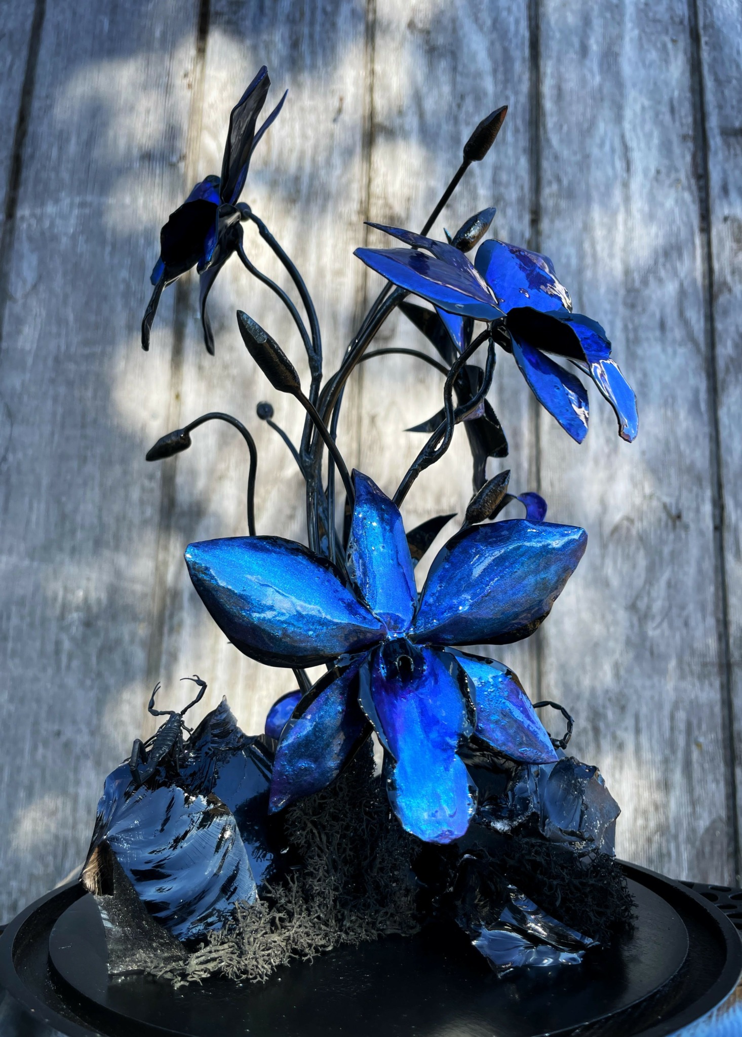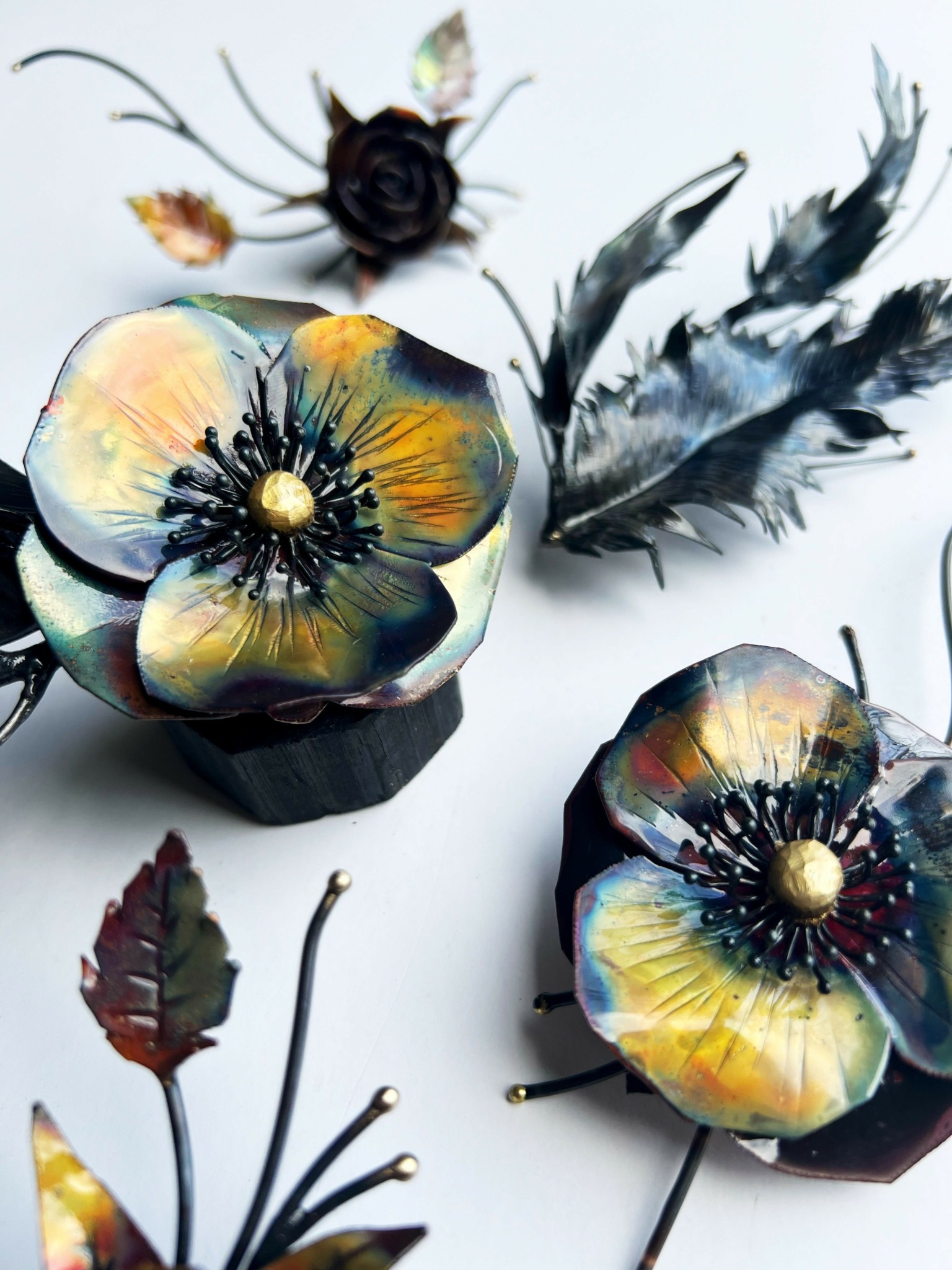 One of my main stample marks here at Studio Black Avenue, is long stem metal roses, constructed from copper and steel. Offering a wide range of colors to choose from between copper rainbow-thermal patina’s to heat treated colors. But, roses are not the only blooms I offer because my passion in welding is to create a bloom for you to celebrate that special occasion like weddings and anniversaries, in addition to creating one-of-a-kind blooms that beautifies one’s home space. From large scale to small display pieces, I enjoy creating sentimental keepsakes, boutonnieres and headpieces, giving one’s self a beautiful accent piece that can also be worn to any formal occasion, with a bonus of being displayed as an art piece.