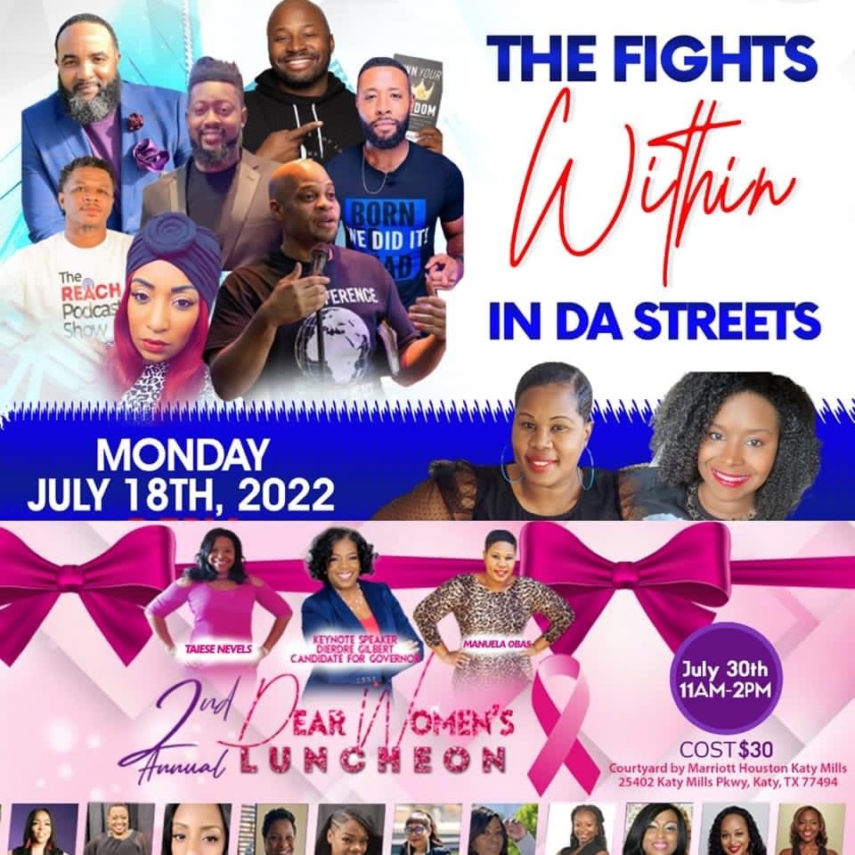 1. I am also a co-host on The Fights Within Radio Show and The Fights Within: In Da Streets Live Podcast with Manuela Obas. Our first book collaboration was in 2021 “Dear Woman” and it featured 8 other authors. The launch of the book was aligned with the annual Dear Woman luncheon – the second Annual Dear Woman Luncheon was hosted on July 30, 2022 in Katy, Texas. Manuela and I are publishing “Healing the Woman Within” book in November 2022. This book was inspired by our “Healing the Woman Within 5-Part Series” podcast featured during Women’s Month in March 2022.