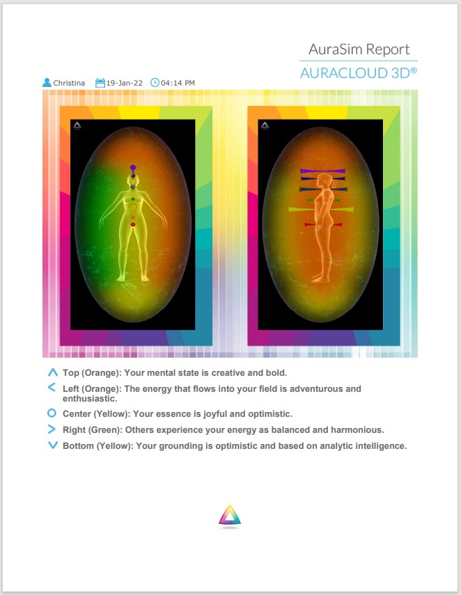 With an aura photo session, you simply put your hand on our state-of-the-art sensor and it will read your energy and determine the colors in your auric field (the field of energy that surrounds your body). I then interpret the colors for you, depending on the placement the colors represent different aspects of your personality. Every aura photo comes with your printed picture, a pamphlet describing the colors, and a personal interpretation of your colors. In addition, clients can choose to get a chakra photo showing the energy levels in each of their chakras and/or a 14-page emailed report that goes into greater detail about the colors, chakras, and energy levels.