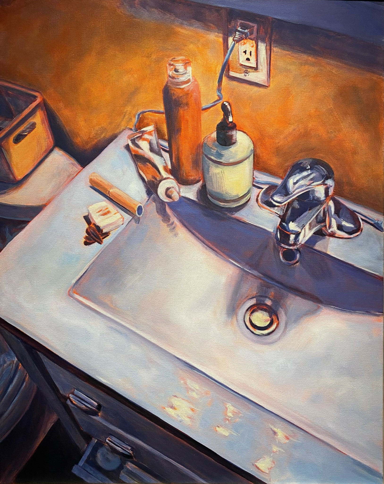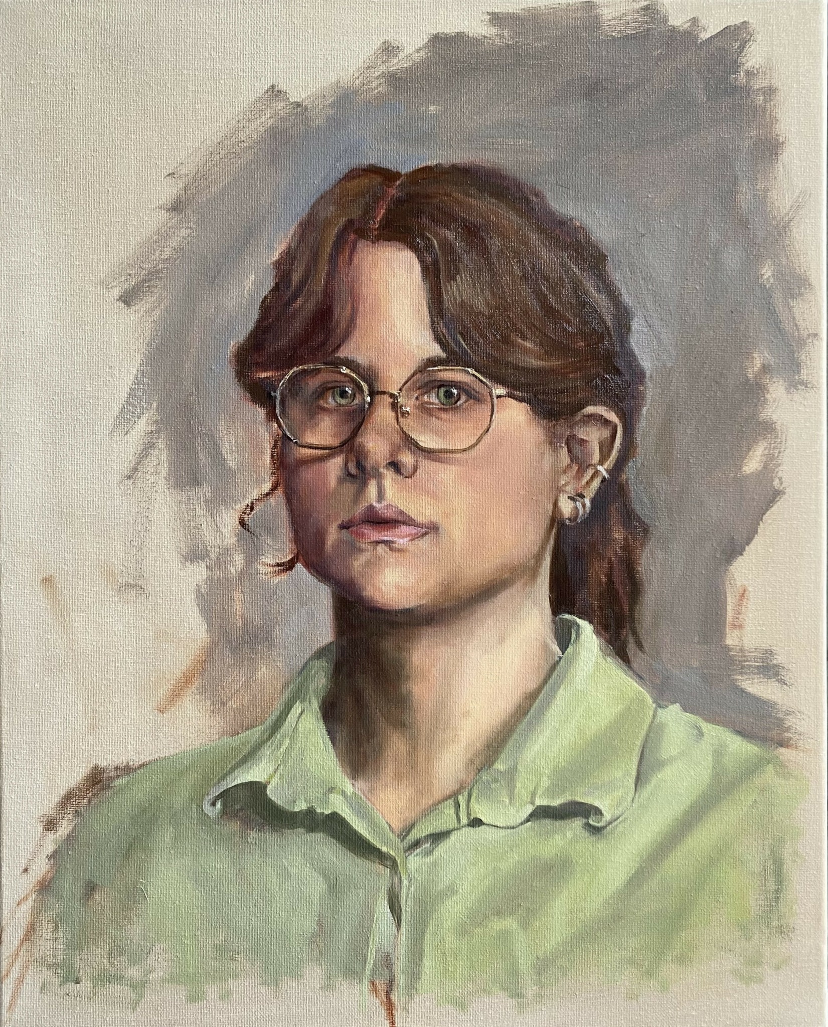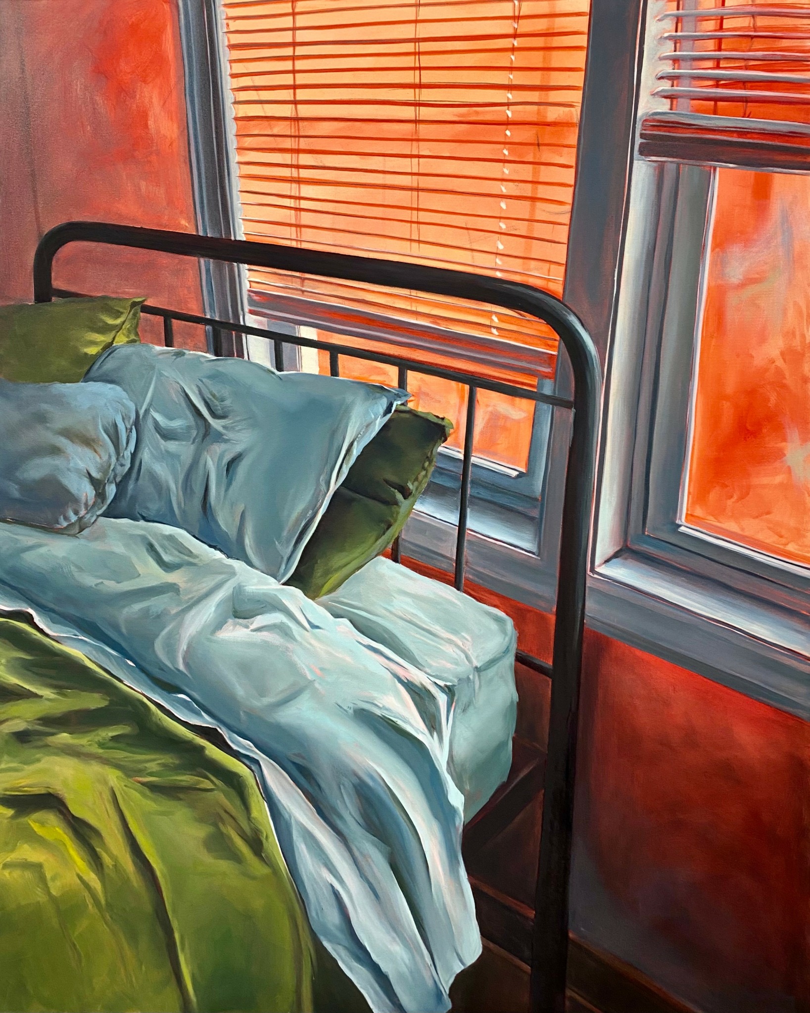 My name is Baylee Bennett, I am an oil painter living in Omaha, NE currently. I graduated with a Bachelors of Fine Art degree in studio art and art history back in 2023. As well as being a painter, I also work at the Joslyn Art Museum in Omaha, NE. Working at a museum has given me opportunities to teach classes, lead tours around the building, and it has let me surround myself with plenty of great art! In my painting practice, I focus on mundane moments, scenes, and objects from my life; I also find myself painting landscapes and cityscapes outside. Working in primarily oil paint, I try to manipulate the medium to create different effects with color and mood by using thin layers of paint to create transparent layers mixed with opaque layers. I have noticed that by painting these interior spaces and objects in my life, it is causing me to look differently upon the space I take up and the material items I have brought in. My paintings end up being a reflection of what I am consuming and what these items mean to me. I’m currently applying for shows and residencies in the Midwest to continue to focus on my painting practice!