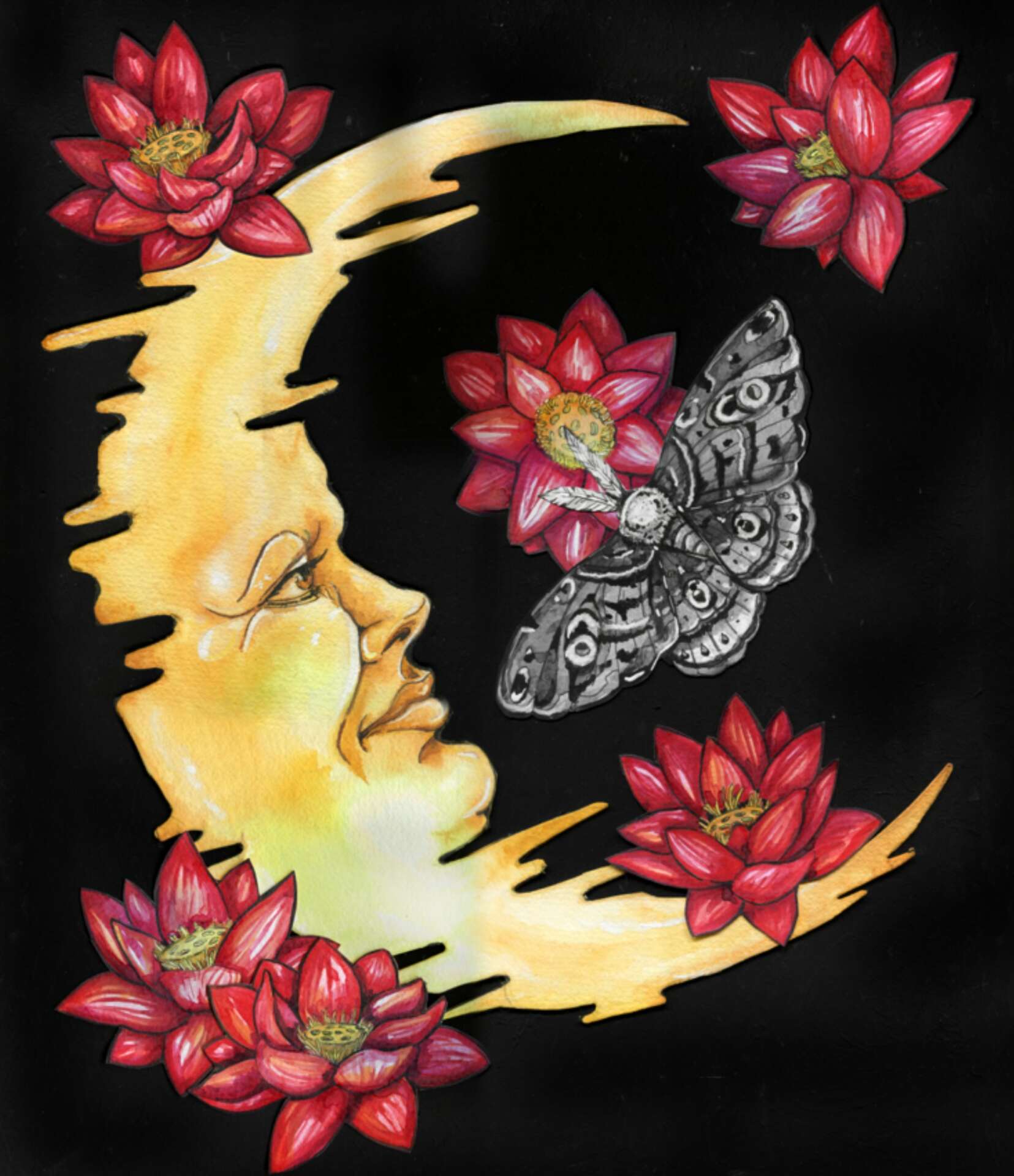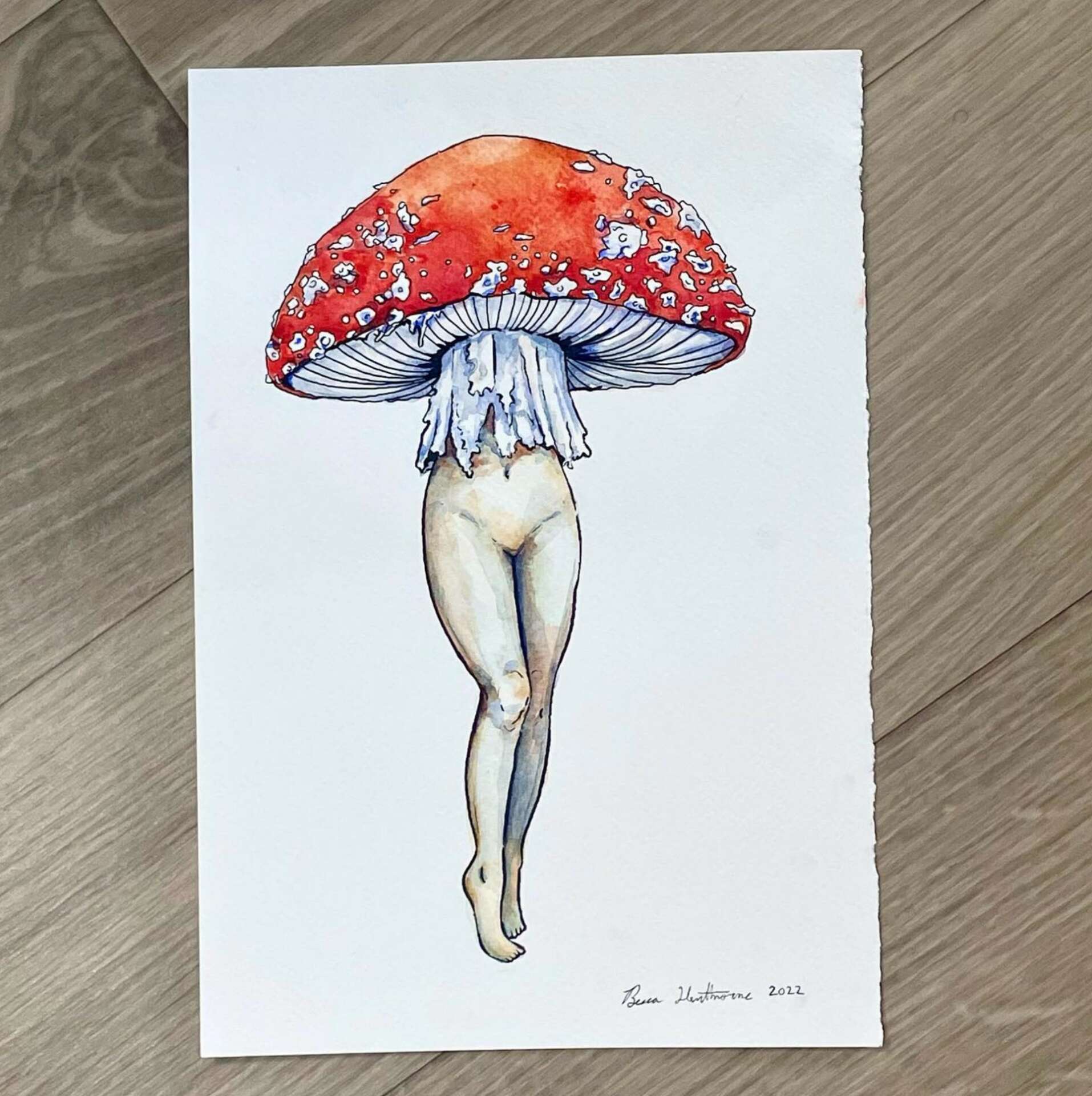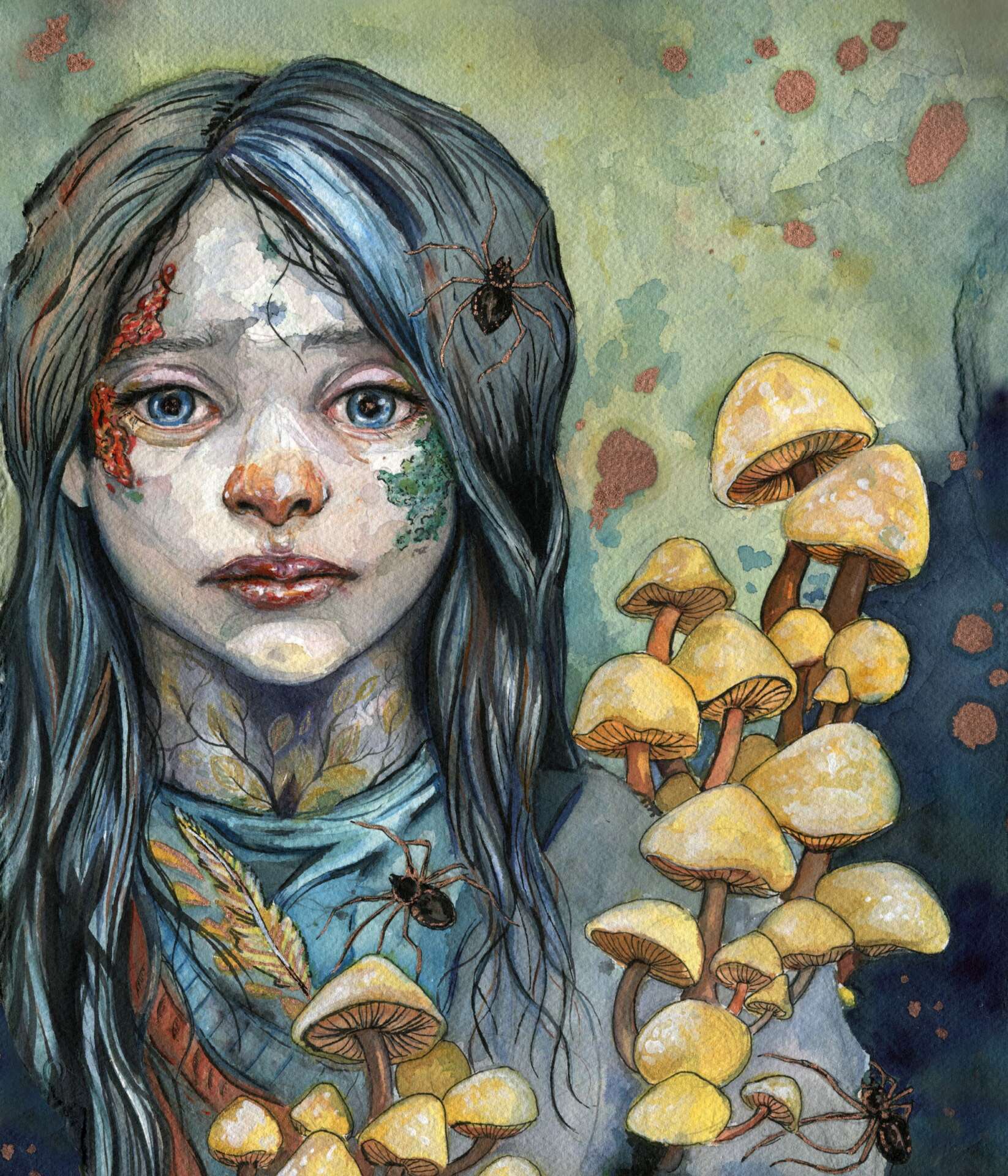My personal approach to art is colorful, whimsical, lightly dark, and rough around the edges. Everything is intentional, but I don’t strive for clean perfection. Much of my inspiration comes from the natural world, folk tales, unloved things, and an inherent fascination with death and mortality. And I mean rough around the edges literally: while it often doesn’t translate online, the majority of my original pieces are painted on torn watercolor paper, and sometimes I even set the edges on fire. More than anything, I love painting mushrooms, moths, and faces. Surreal portraits of beautiful girls or old bearded men.