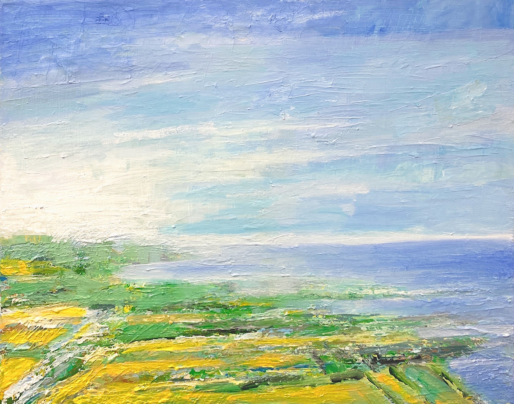 I never planned a career in the arts. Had I not taken a college creativity class in basic drawing, none of this may have unfolded. A whole new world was opened to me by my first art professor and artist Squeak Carnwath. I went on to study with noted painters John Walker (former grad arts director at Boston Univ), Bernard Chaet (longtime Yale arts faculty and one time chair), Wolf Kahn, and a number of others. This foundation really helped me begin to get my bearings as a young artist. From there it has just been a road like most artists, most of all of us in life – filled with ups and downs, challenges, and times of great awe. I work in two modes which I am well aware is not the norm as far as the formal art gallery world is concerned. I paint both contemporary abstraction with hints to social commentary related to male cultural role models (www.benjunta.com – insta @benjuntastudio), as well as contemporary landscape paintings (www.paintscapestudio.com – insta @paintscapestudio). That said, for 20 years, I did not deal with landscape painting, but about a decade ago, while sitting out on my surfboard looking up to the beautiful rocky coastal outcroppings, I felt a strong pull to capture that as well. The landscapes were included in a summer 2023 group show with The Bridgette Mayer Gallery in Philadelphia, PA