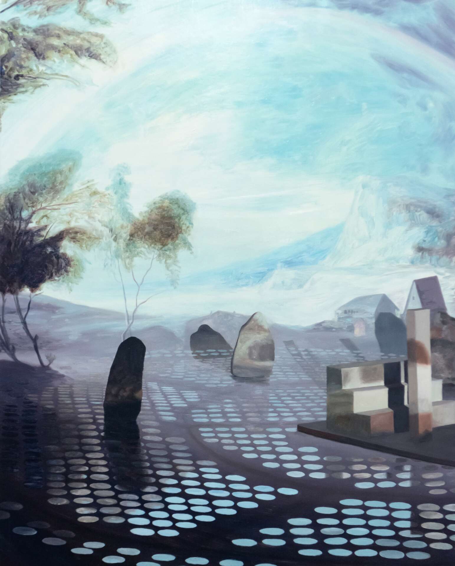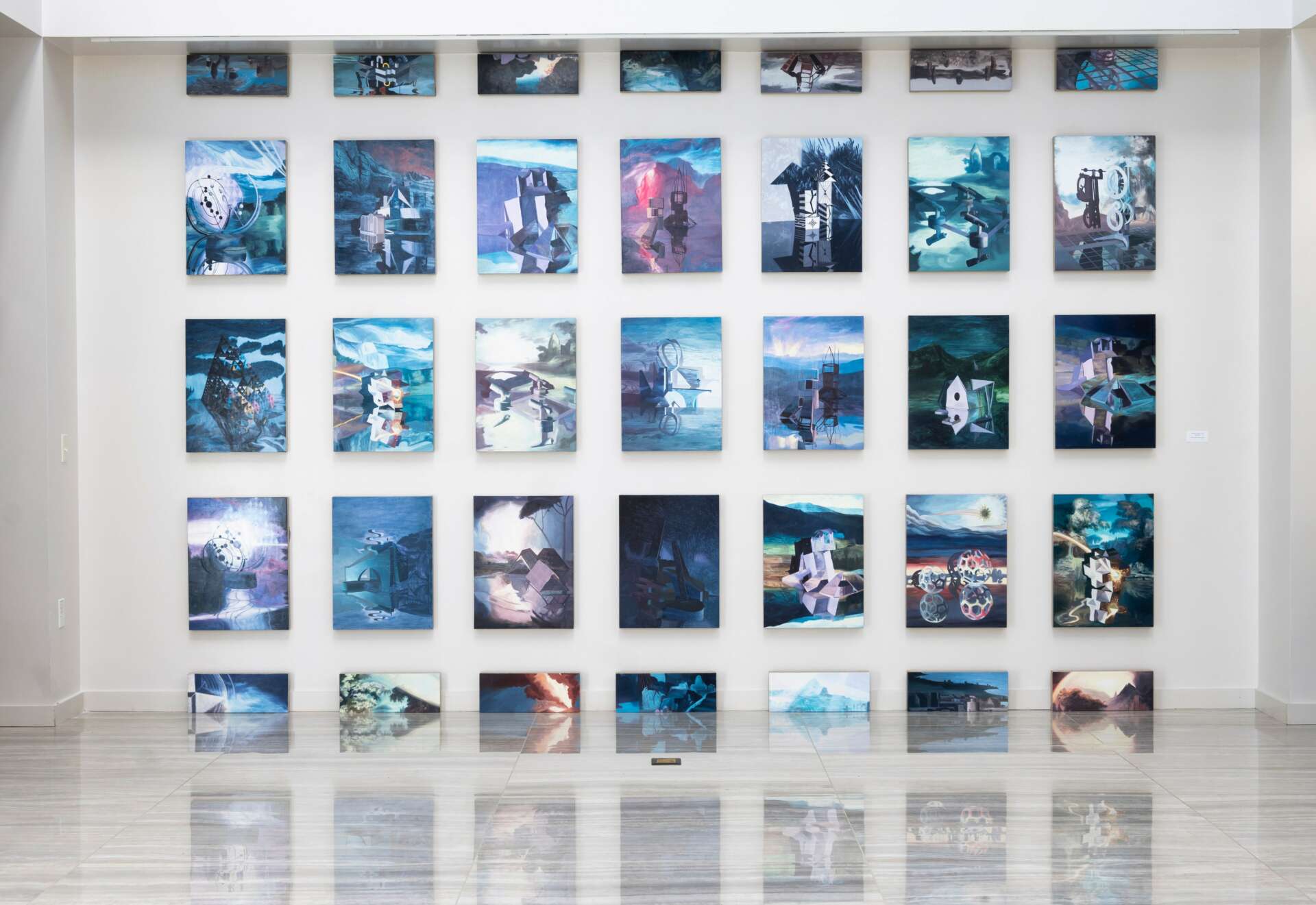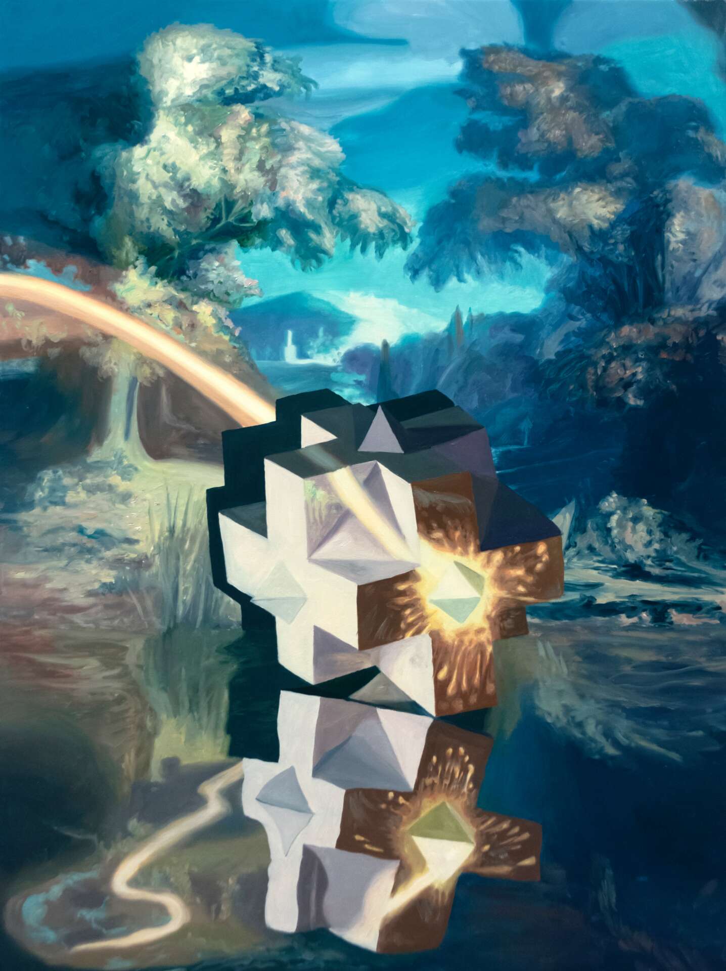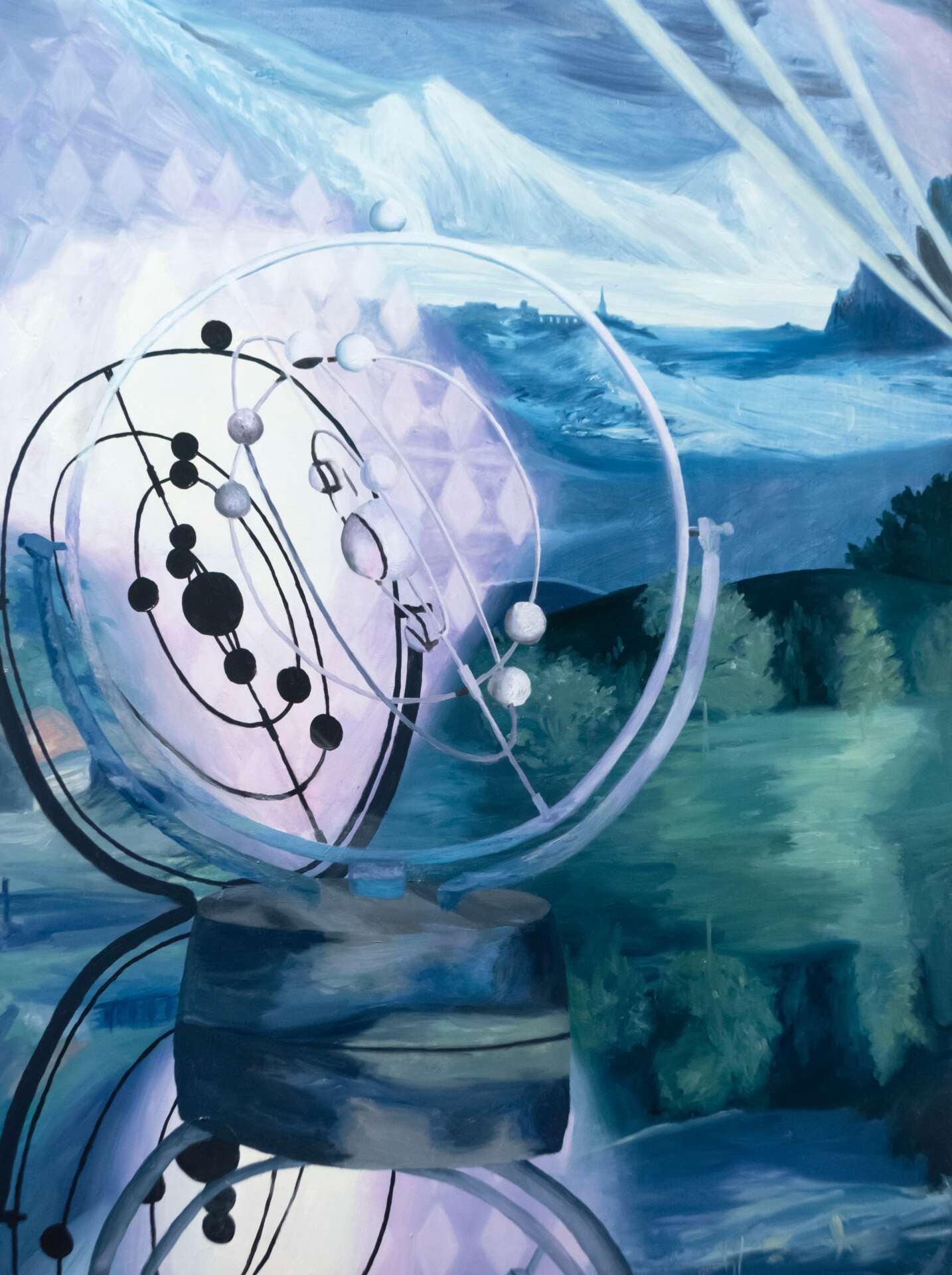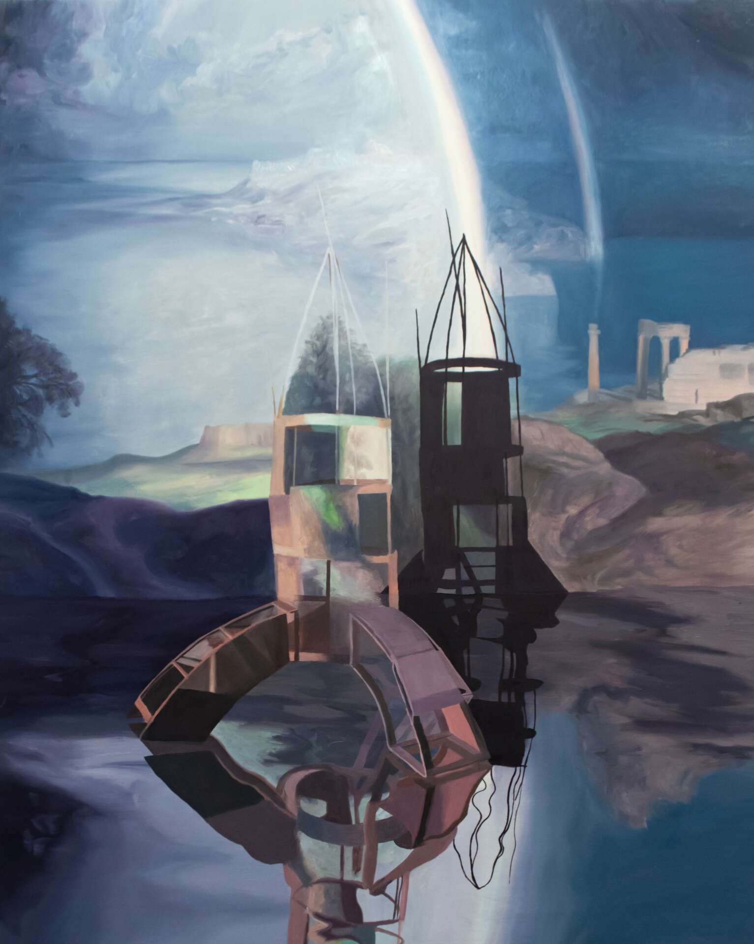 I create oil paintings that are based on futuristic architecture, inventions, and the history of landscape painting. I am drawn to the utopian ideals put forth in futuristic architecture and sees this as a way humanity continually strives for a world that is just out of reach. The promised future is never here. Forms refer to futurism and invention in multiple times and places in our world’s history. They also at times appear to be in a state of ruin or construction. I am interested in how representing ideas of the future from the past creates a tension and feeling of displacement in time. Across multiple paintings a single form may appear more than once, seen at different scales, from diverse angles and in changing environments, as if in a shuffling of a giant deck of human history.