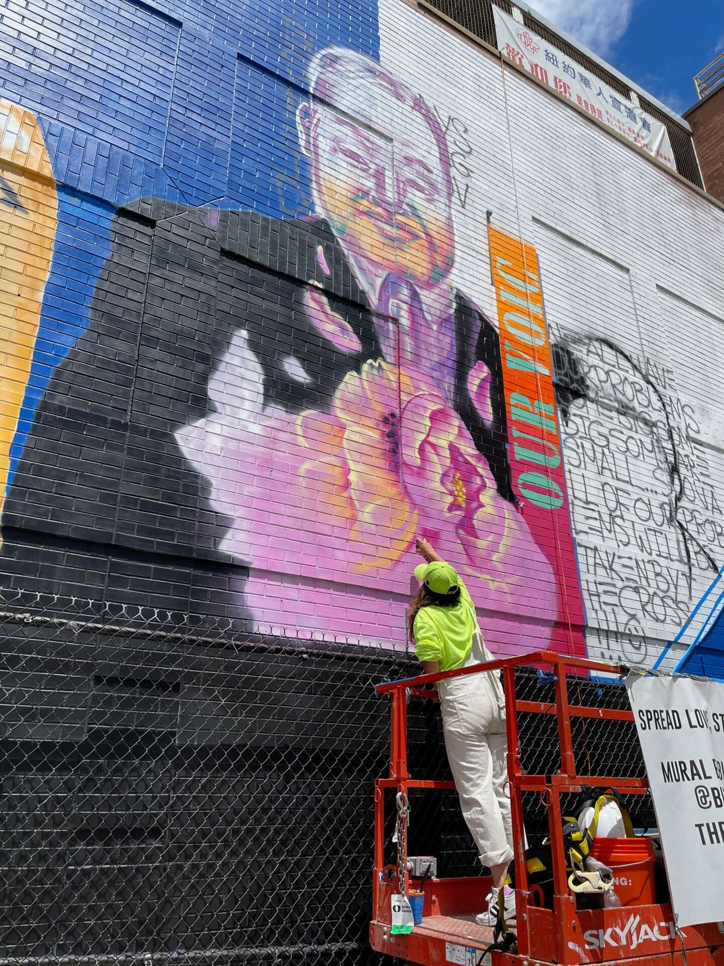 I have two. one is the “spread love stop asian hate” mural thats in lower east side. being korean and spanish and growing up in east village originally I felt very affected by the rise in hate crimes during the pandemic and it reminded me there that wasnt any representation for the aapi community for me growing up so I sought out to paint a mural and take up space (literally and figuratively” for the asian community. I partnered with the NYC city departments, and even had an unveiling event with the NYC mayor and first lady. that mural is now one of the biggest in manhattan, and will remain a permanent fixture.
