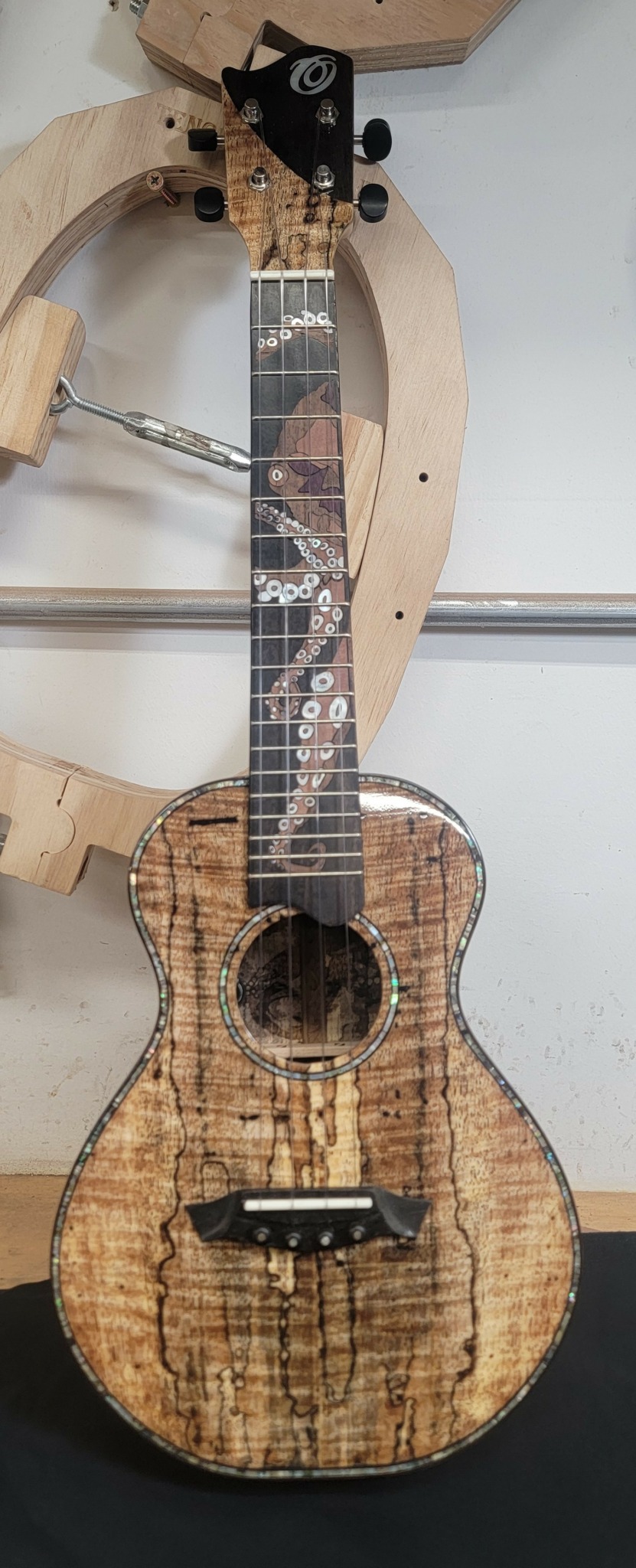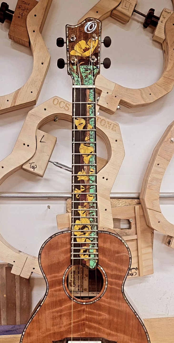 So right now, I am making USA custom shop instruments, specifically ukuleles. I have a few dealer-specific models I’ve designed that hit a certain price point and features that are competitive with the overall market, and those are available for the dealers of the company to purchase. Those locations can be found all over the world currently and are continuing to expand into new locations and countries as we can. I’m only one guy so there’s only so many instruments to go around and I can only build them so fast, but besides the US I’m in Japan, Australia, Germany, the UK, and maybe a few others as well. The real work at my job is the truly custom instruments. These are made to order and cater to a specific customer’s wants and needs and usually involve a lot of inlay work and specific woods and materials that are perhaps unusual in typical builds. Typically, the customer will come to me with an idea or vision they have, and I will do all of the design work, drawings and other specifics until we agree on a final product. I have a bunch of work I’ve done they can look through to give me an idea stylistically of maybe what they are interested in, or even thematically. A lot of my works so far have been different animals either land or sea and are more often based on a broader landscape like my personal painting work. I did a custom octopus inlay uke for one customer, and a field of poppies for another who wanted a truly all California uke, utilizing California woods as well. Any idea they have really, be it personal or just something they are really interested in, I start with the initial drawing and take my design cues for the rest of the ukulele from there.