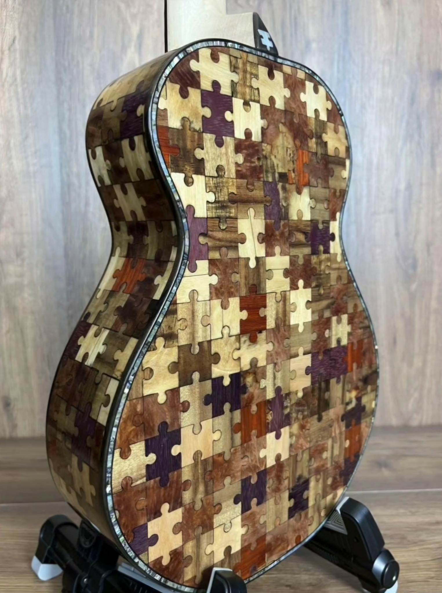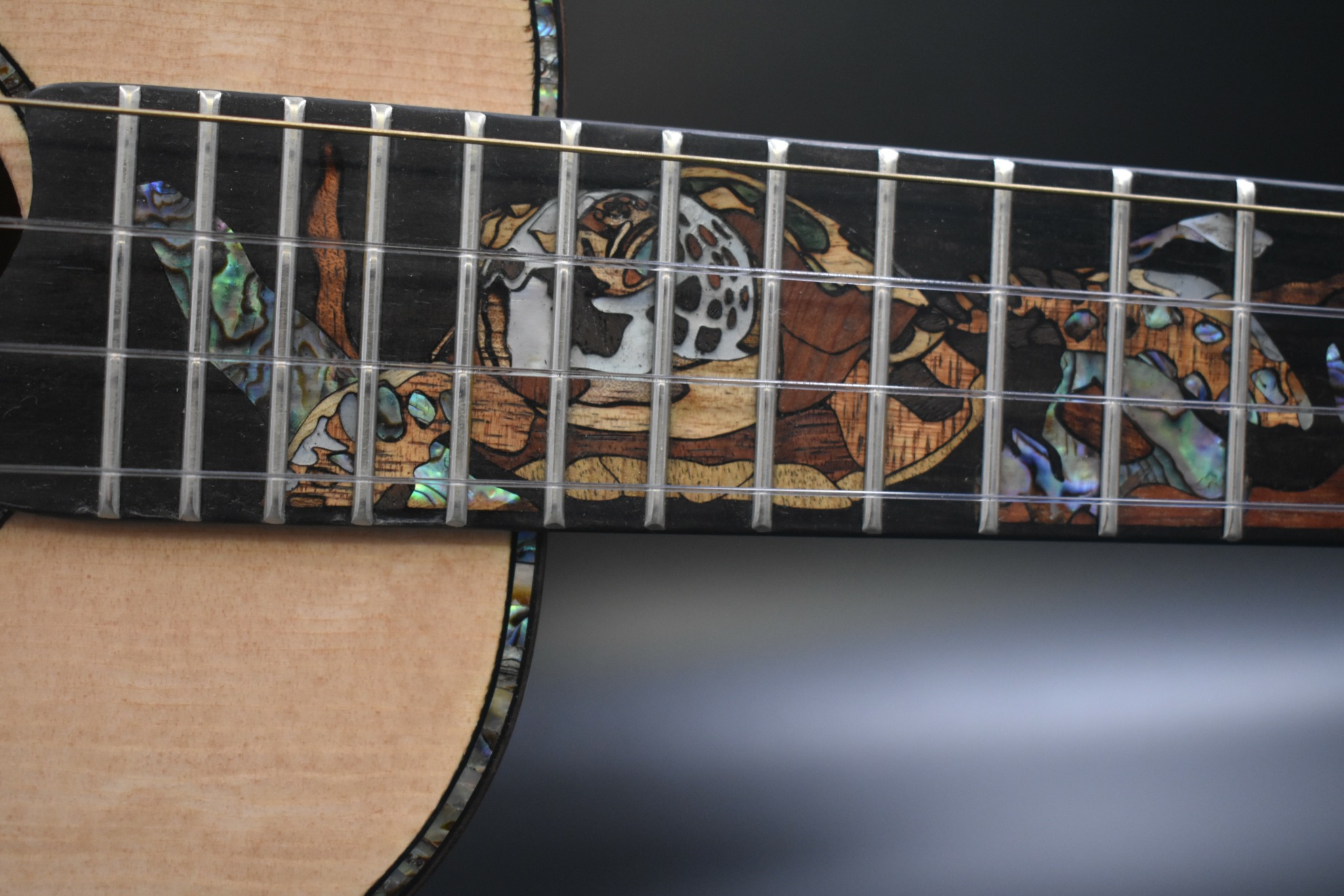I think what sets me apart from others, at least when the instrument building is concerned, is that I’ve been forced to think outside of traditional means of building from the beginning. I don’t quite consider myself a woodworker, but more of a designer/fabricator/artist really, and all of my official training is really from trial and error and watching videos. I also took it upon myself to really dive into inlay work, how they are made and installed and what it even means to make or have an inlay. I approach them as I do my paintings, which are primarily landscapes. I try and view the function of each part of the inlay in space, where does it belong and what it is doing, and tie these things in with other design features of the instrument as well. I try and treat most of them as if they are telling a story, how landscapes often capture a specific moment or feeling in time and try to replicate that with the materials and skills that are available to me. My paintings also lean heavily towards the realm of realism, which reflects my inlay work as well. I try and keep all of these skills I possess closely tied together so they benefit one another, build off of and reflect these design elements to come together into a homogenous instrument.