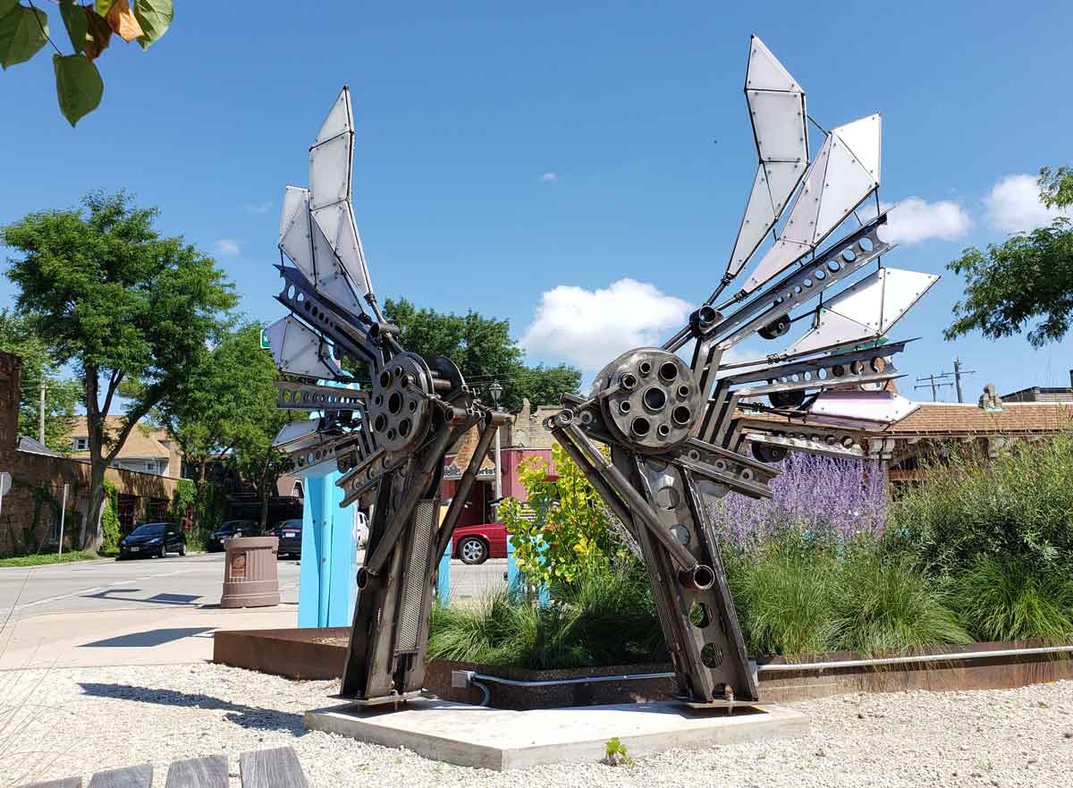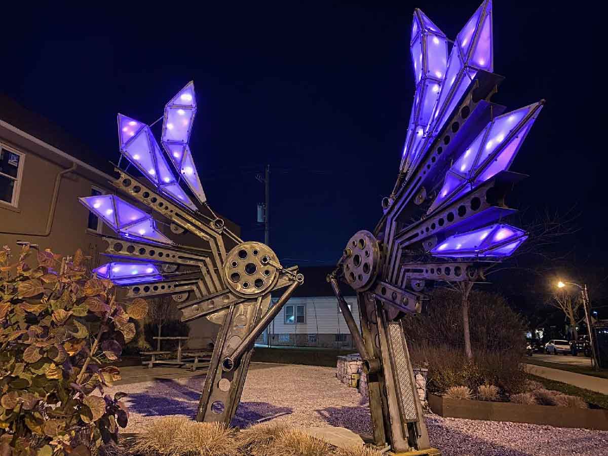 Notably, I created the “Together Feathers” sculpture for Uptown Crossing’s Pocket Park, which received the 2020 Mayor’s Design Award. I also designed and built a 15-foot-tall sculptural interpretation of a jellyfish, the “Salva-Jelly,” in downtown Green Bay, WI. It’s solar-powered with 300 LEDs that illuminate at dusk daily. I was able to employ 13 artists, mostly from the House of RAD. One of my most impactful projects is with America’s Black Holocaust Museum, where I art-directed and created all graphics from production through print and installation. My work on the Neighborhood Markers for the Near West Side Partners earned me the 2022 Mayor’s Design Award. In 2024, I created six large digital murals and a sextet of fine art pieces for The We Energies Foundation Art Collection at the Baird Center. A space-making public art project was the Beerline Plaza renovation, involving multiple teams—from middle schoolers to college architecture students and the neighborhood BID. Most recently, the House of RAD celebrated its collection of artwork at the Trade Hotel, where I curated custom-commissioned pieces in collaboration with hRAD artists.