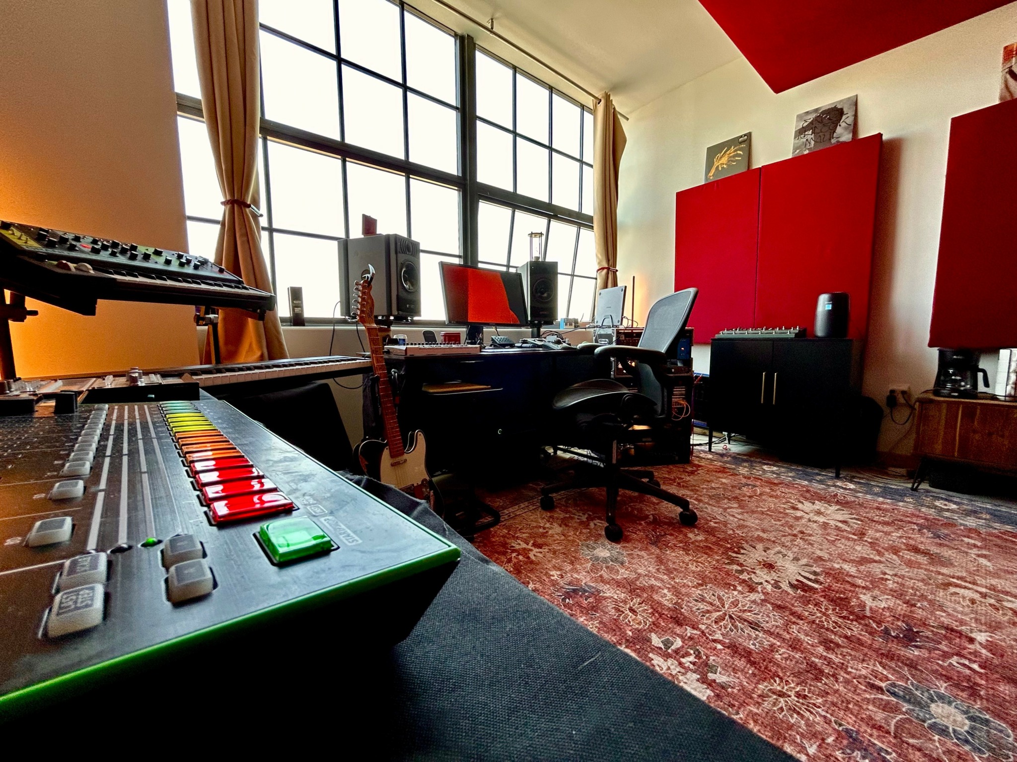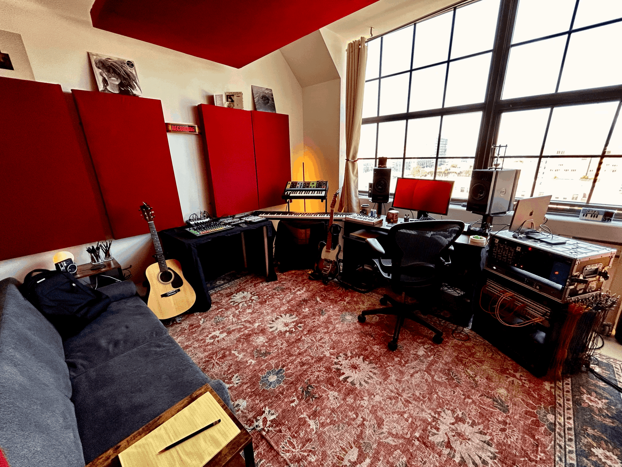 Over the next few weeks, I began construction on the acoustic treatment for the space. I had already calculated the amount of acoustic treatment I would need, and where they would need to be placed to achieve the best sound. My younger brother Brian and his friend Sean are carpenters by trade, so I brought my plans and quotes to them to check my work and make sure I had everything I needed. When they saw the designs they offered to help, and we set off on building out the space. It took about four days to build all of the acoustic wall panels by hand, and another three to build the walls for the live room and ceiling clouds. Once everything was hung in place, I was able to order my furniture and audio equipment. My friend Jaydee Deleon helped me to configure all of my audio routing over the next few days, and also provided a bunch of extra equipment such as guitars, effects, and synthesizers. Once we tested everything, we invited some musician friends over for a test session, just to see how the workflow would be in the space, and to check that we didn’t leave any stone unturned. We were pleasantly surprised to find that our test session went even better than expected. So after about a week and a half of non-stop work: we finally had a recording studio.