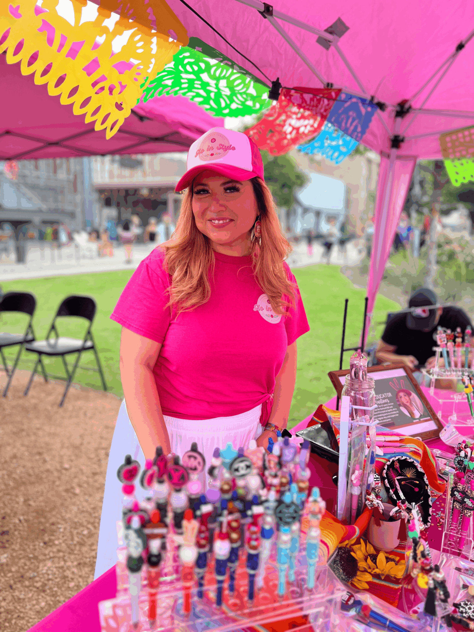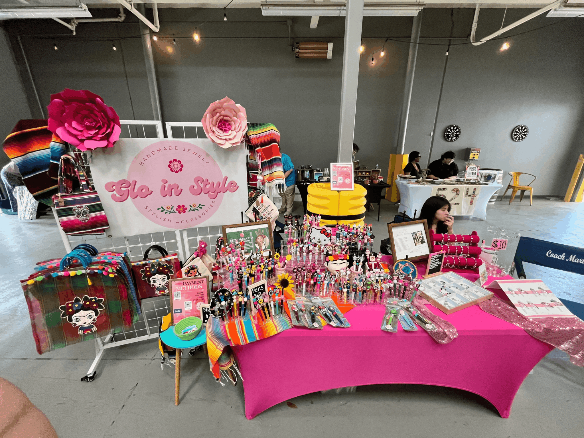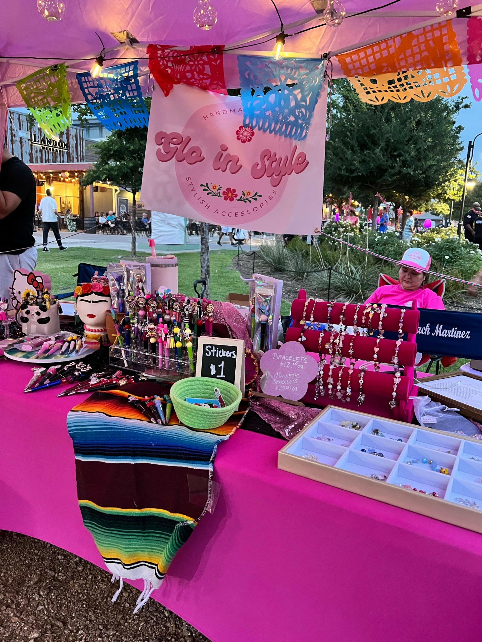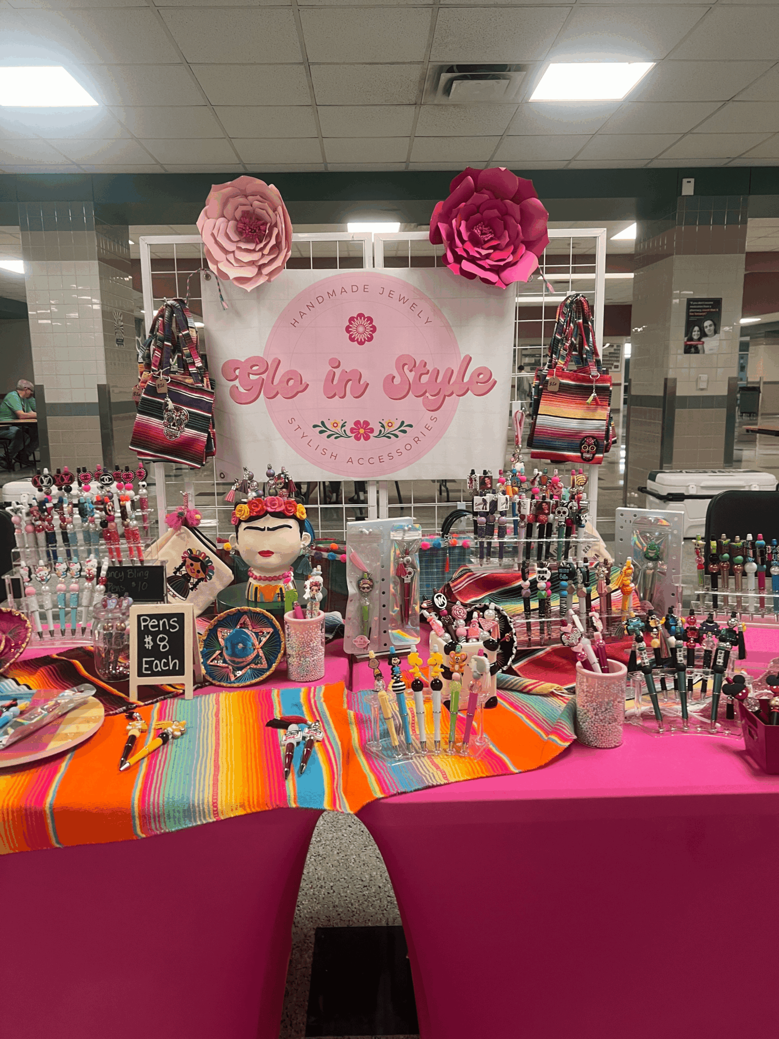 We make focal pens and handcrafted jewelry along with other Mexican inspired accessories such as mercado bags, keychains, etc. I absolutely love celebrating life with color, so in our booth, at events you will see our vibrant pink along with many colors as we want our customers to “Glo in Style” with our colorful products.