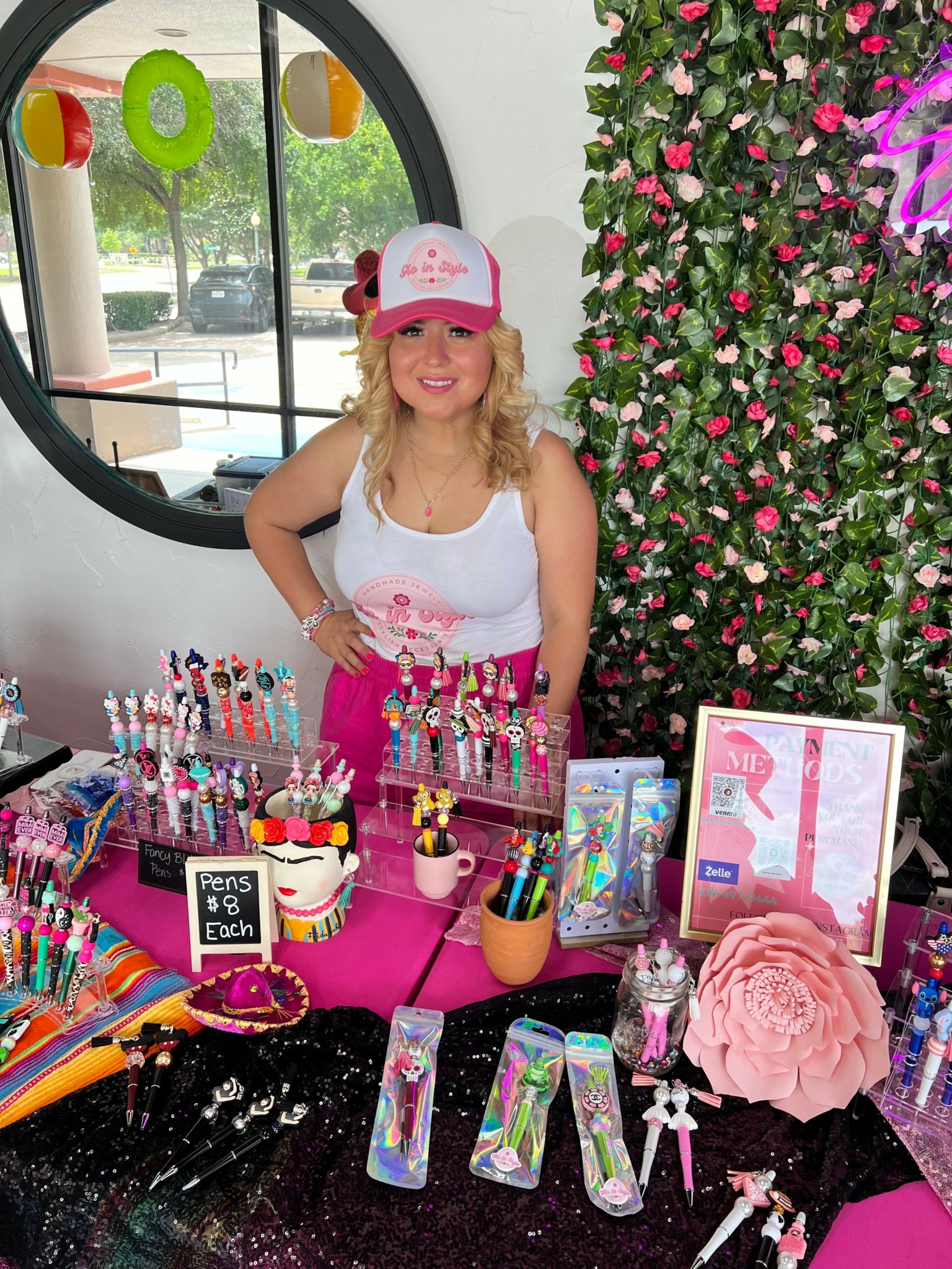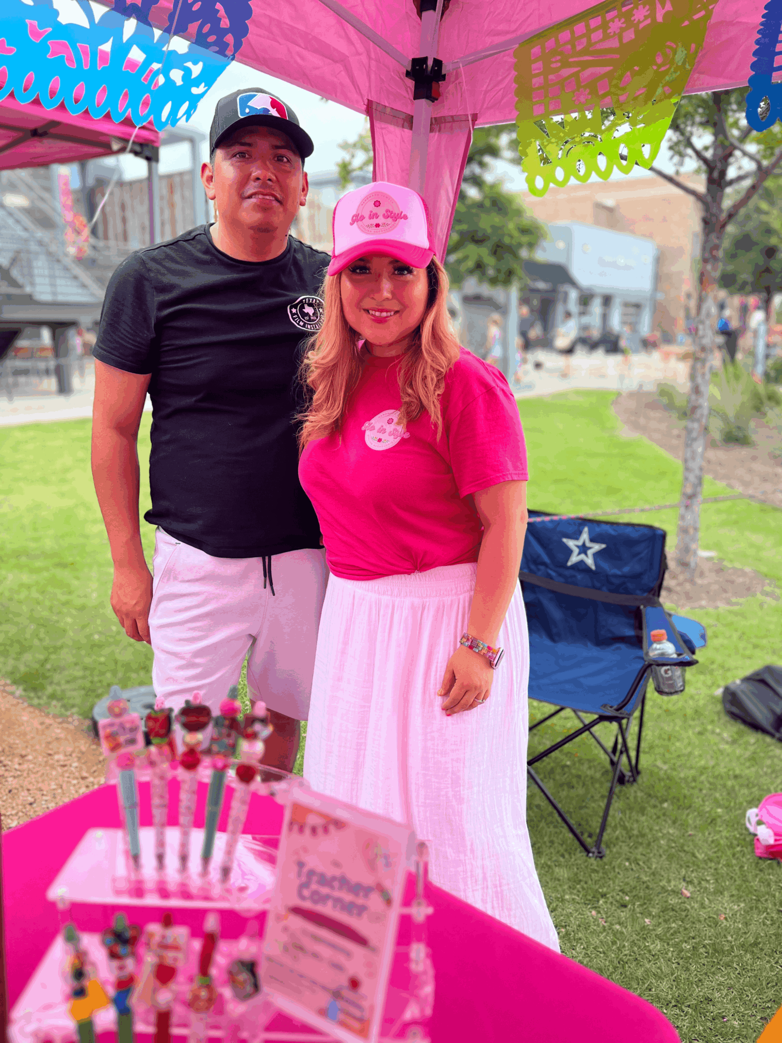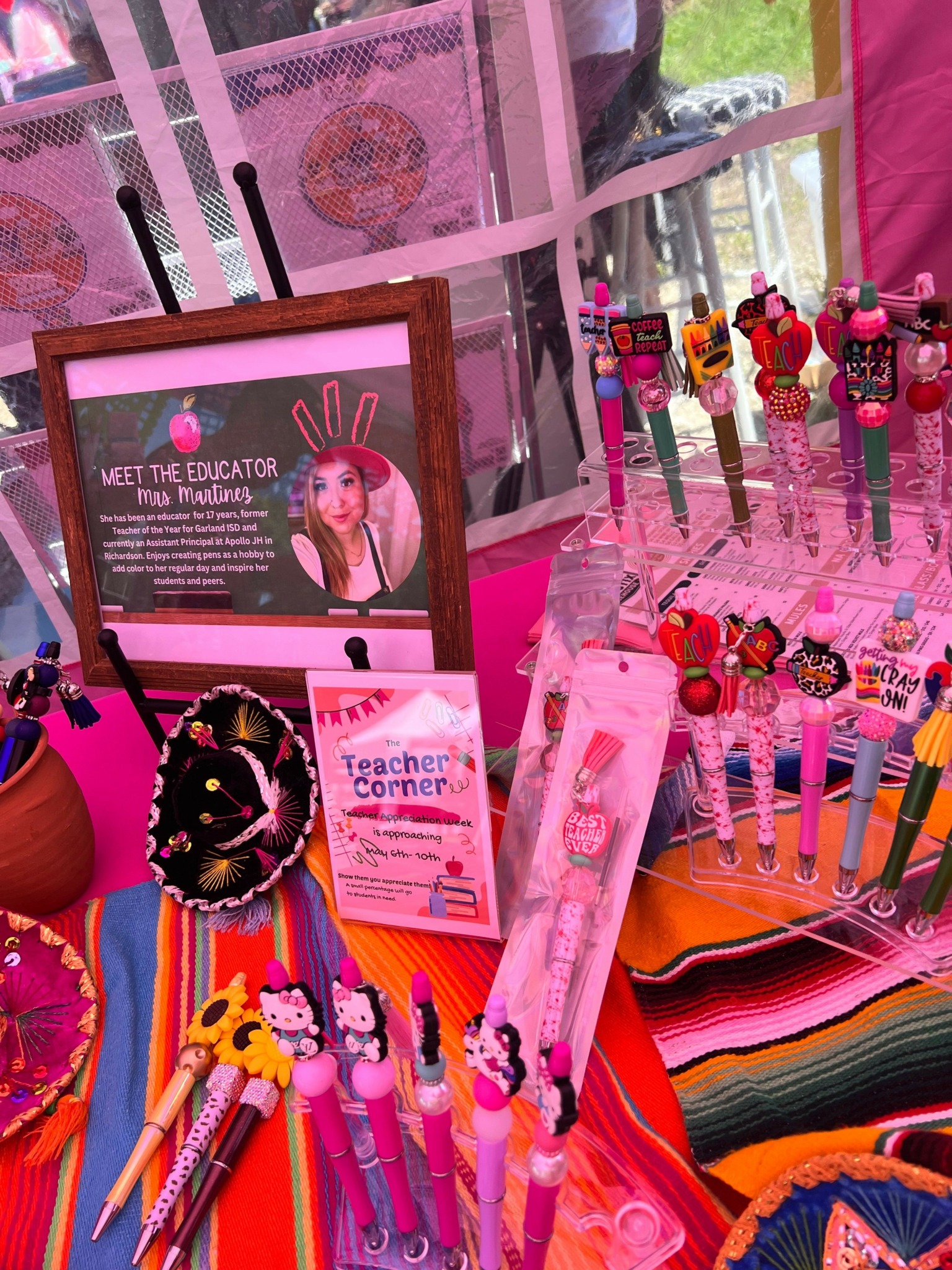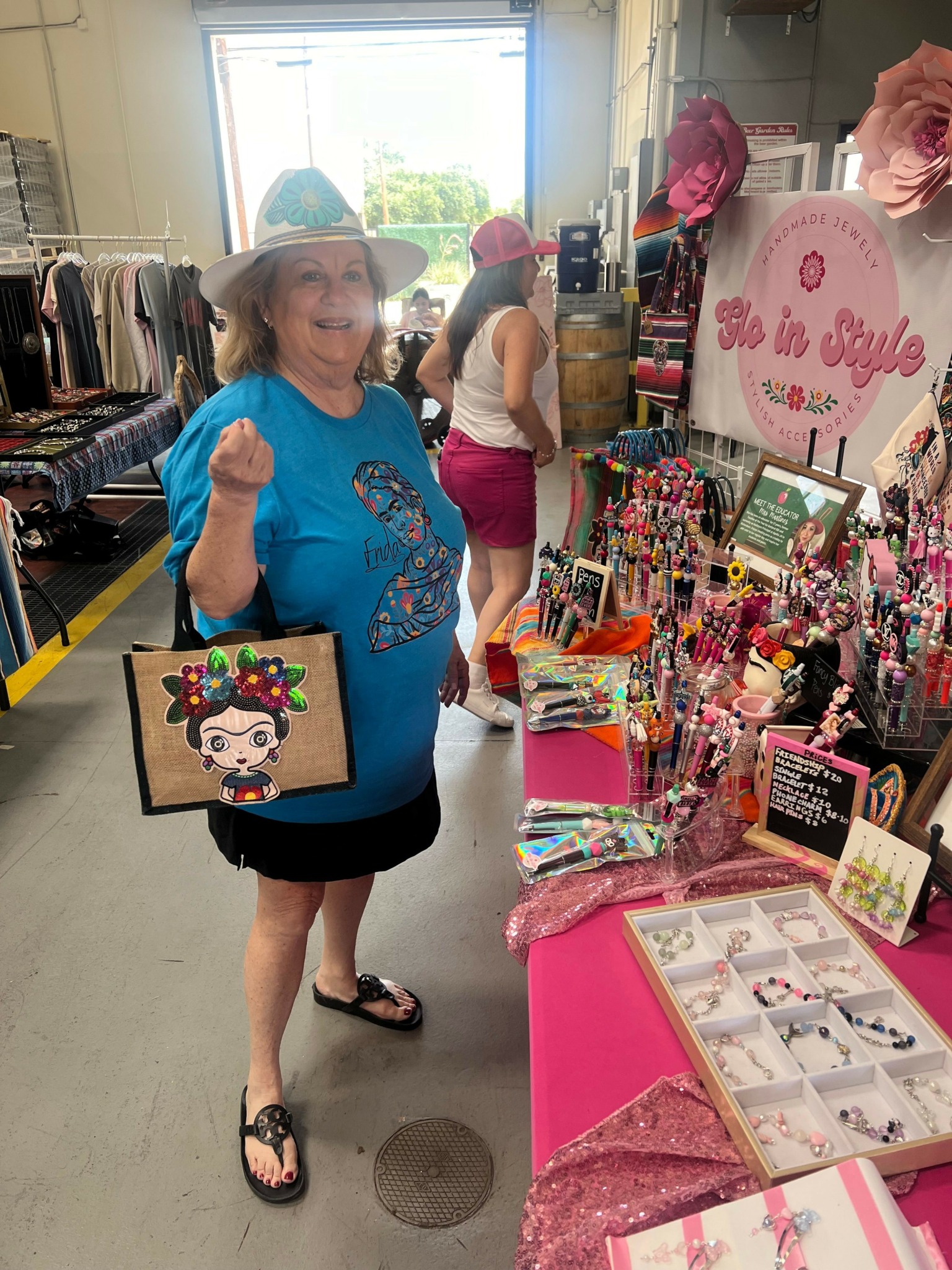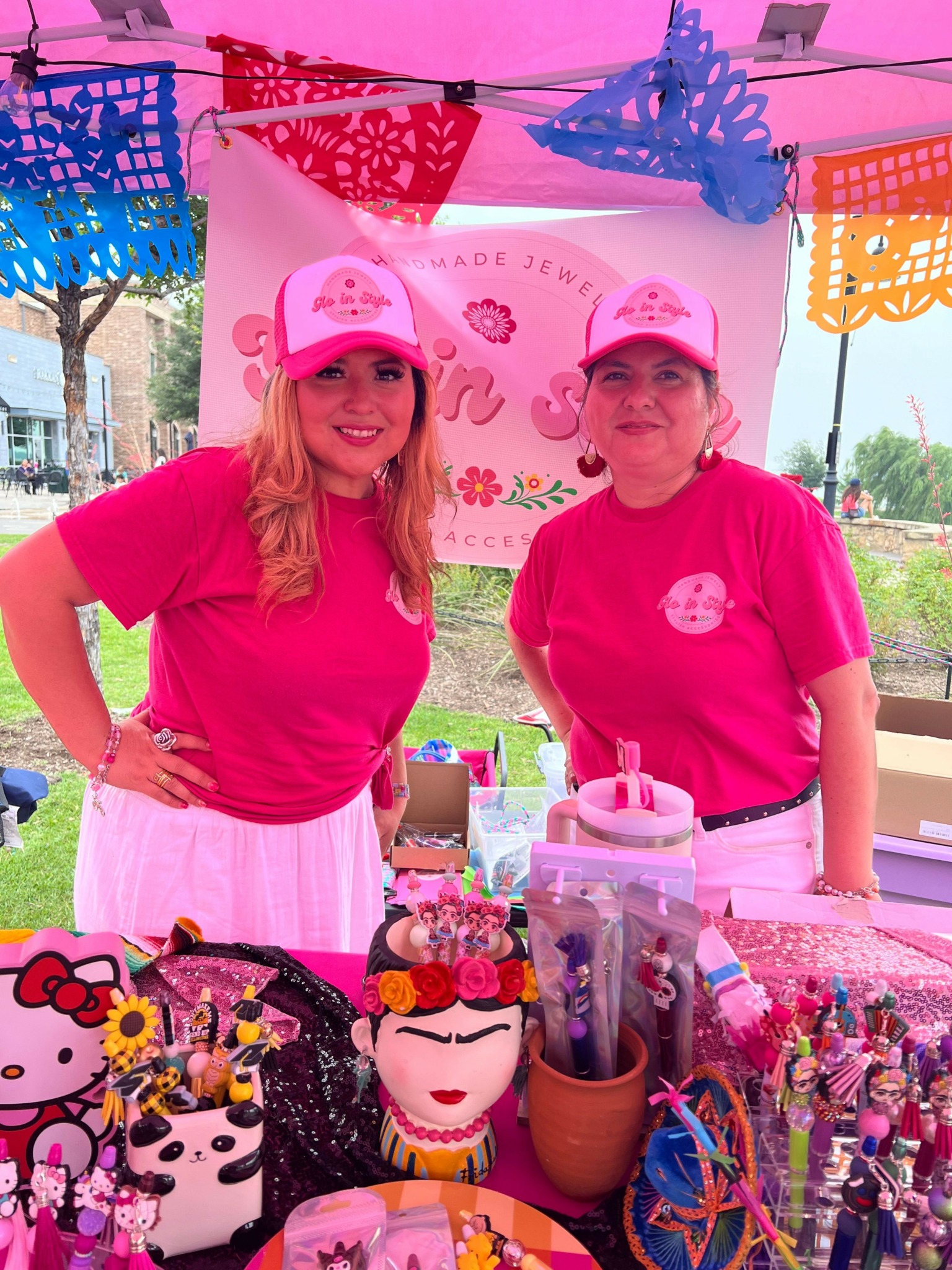 We make focal pens and handcrafted jewelry along with other Mexican inspired accessories such as mercado bags, keychains, etc. I absolutely love celebrating life with color, so in our booth, at events you will see our vibrant pink along with many colors as we want our customers to “Glo in Style” with our colorful products.