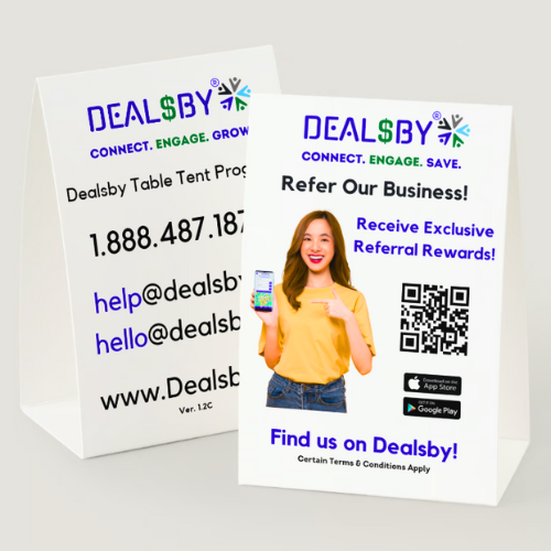 Additional Support: We also provide Dealsby table tents for store checkout counters and restaurant tables along with window cling stickers with the Dealsby QR code that allow consumers to easily find and sign up for Dealsby so that can quickly start referring our member businesses.