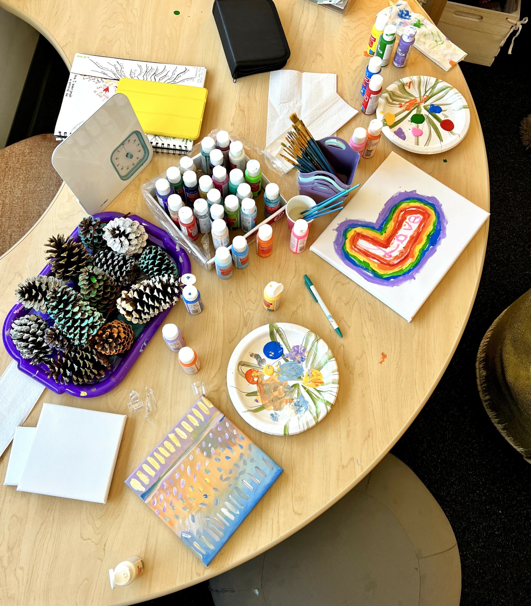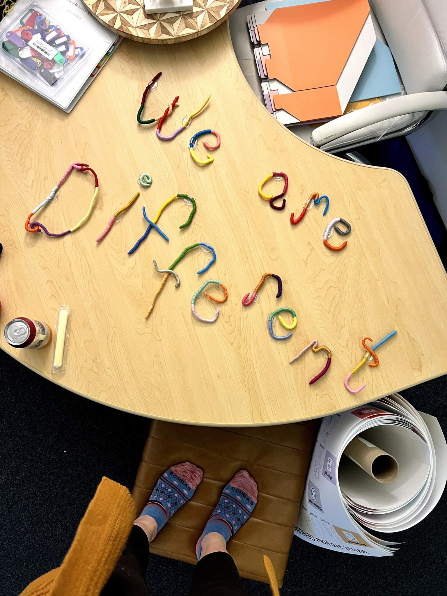 When I expanded my physical space for the practice to include the group room, it was really important to me to have authentic characters and experiences portrayed in my space and on my social media platforms. In my field, confidentiality laws make it so it’s very difficulty to share authentic feelings and experiences with the outside world, rightfully so. Nonetheless, I feel that our humanity and all of the big feelings and tough stuff are a major connector for….everyone. Over time, my space has become filled with all original artwork by myself. We do hands on and creative projects with all of our clients and have their work displayed as well. I have a strong need to feel connected to where I spend time and it is more important to me that anyone walking through our doors feel that connection and comfort that comes with community as well. So, functional space design and consultation related to accessible spaces for children has become another thing I began being asked to do, which, I guess is now a “service” considering that I am paid to do it in some cases. In our space, I draw, paint, color, build, craft, sew, embroider, etc with the kids and teens.