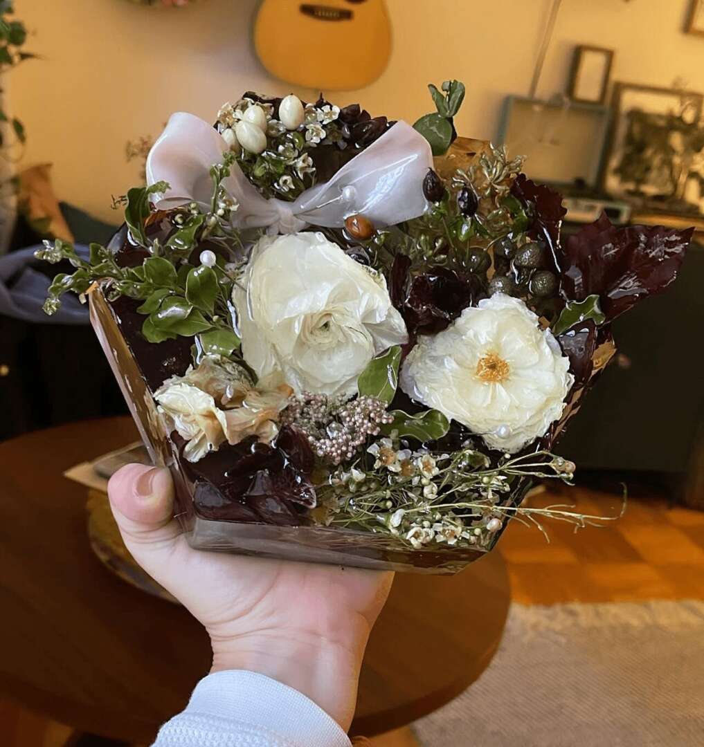 Through my own personal brand, I preserve wedding bouquets and items of sentimental value or really just about anything from or for any occasion. Something that sets me apart from others who do similar products is that I really make an effort to create a unique piece of living art that is a forever keepsake. My special touch is not entirely submerging the flowers so it feels as though the sculpture is alive. One of my favorite things I often create with wedding flowers is book ends! They are not only beautiful but also a functional way to have a special memory on the shelf. I really can make anything. You just have to ask! My creative services expand beyond resin, though. I’ve been sued to make props for children’s theatre productions and installation builds for corporate events. A friend once asked if I could create art out of her placenta as a gift for her Doula, and, of course, I said yes! I ended up making pressed prints of her placenta which ended up so stunning that I even saved one to frame for my own wall.To this day, it is one of the wildest and most incredible artistic experiences I’ve ever had!