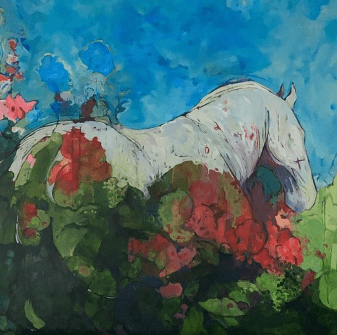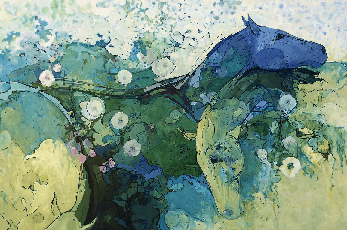 In the studio I primarily use to horses express myself. I use colour, and line, and brush marks to convey feelings, thoughts, and moments of time. I want the view to be engaged with the artwork and to slow down and contemplate what they are seeing and feeling.
