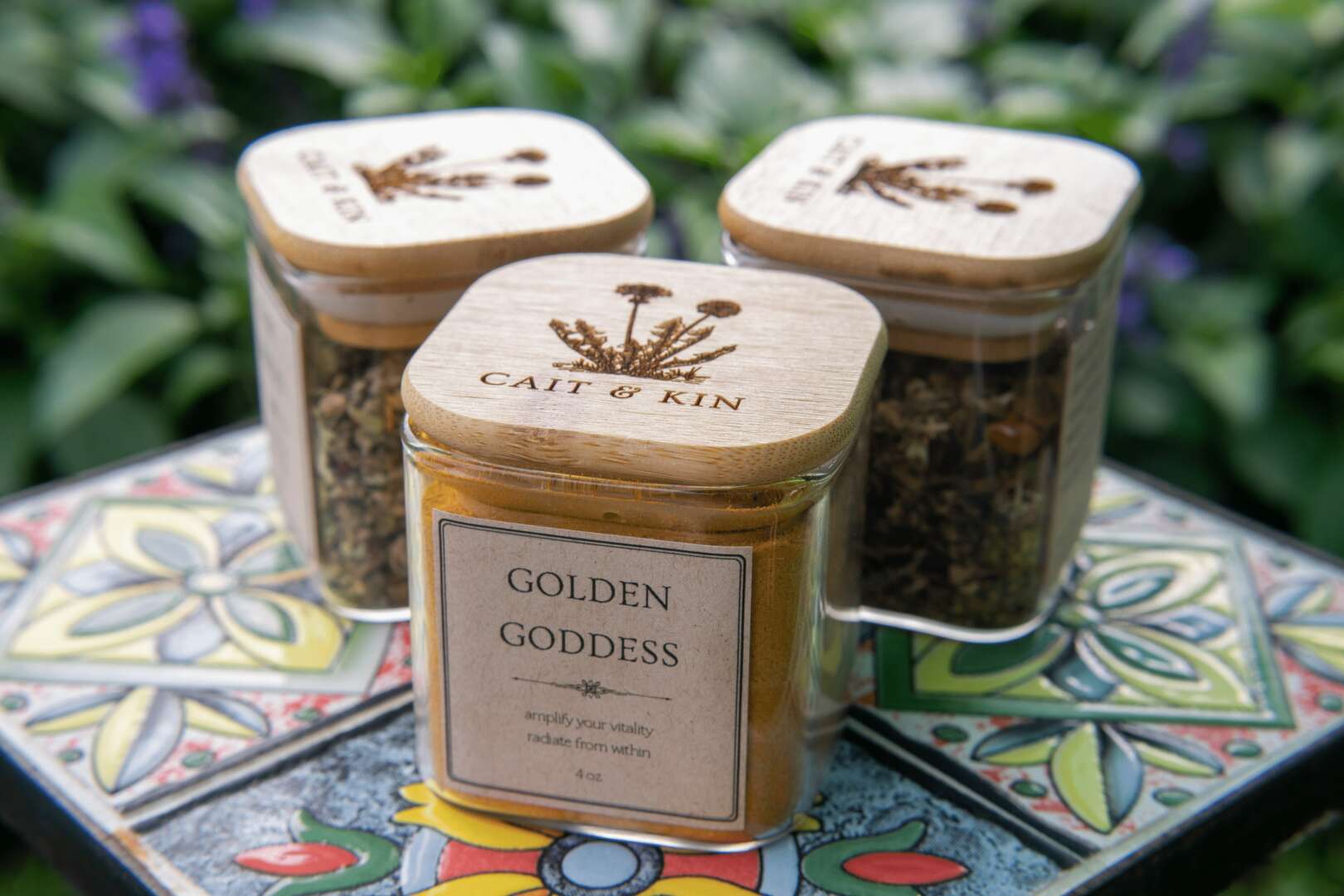I’ve always been interested in plants and how humans can live more harmoniously with the land around us. After years of collecting herbal books, I started learning more about herbs. I’m a student of The Herbal Academy. One of the first herbal things a budding herbalist creates is a tea. I started researching plants and making tea for what ailed me; a cold, my cycle, an excited nervous system. During my 300-hour teacher training for yoga, I had a housewarming party. A couple my fellow ytt’ers noticed my apothecary full of herbs and my bookshelf full of herbal books. They were enchanted that I also was interested in herbs and oils. As a requirement for our 300-hour certification, we had to create and host a workshop. We chose to do our on how plants, oils and movement all come together to help us move energy. From that, our company, Self Kindness Studios, was born. With the encouragement of my SK Studios co-founder, I created my tea brand, Cait & Kin.