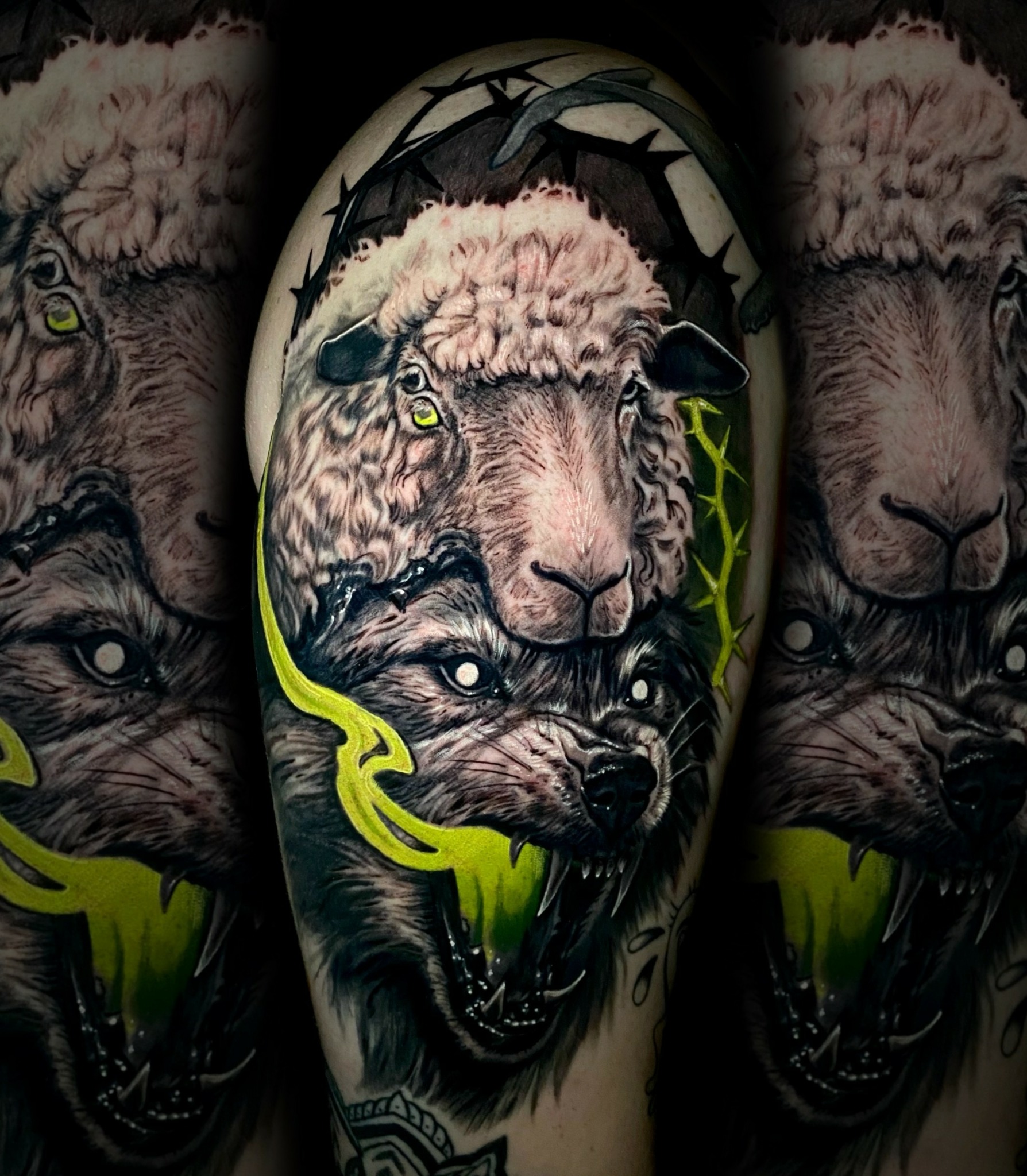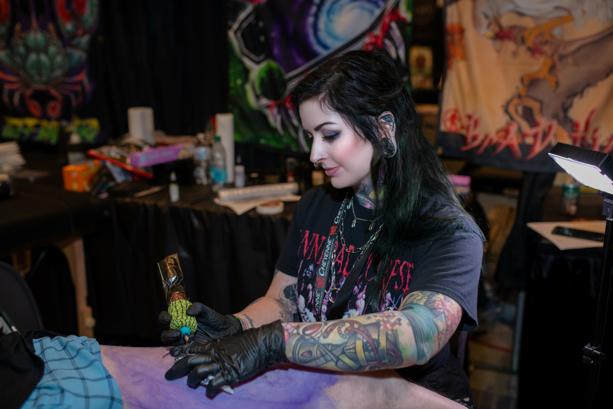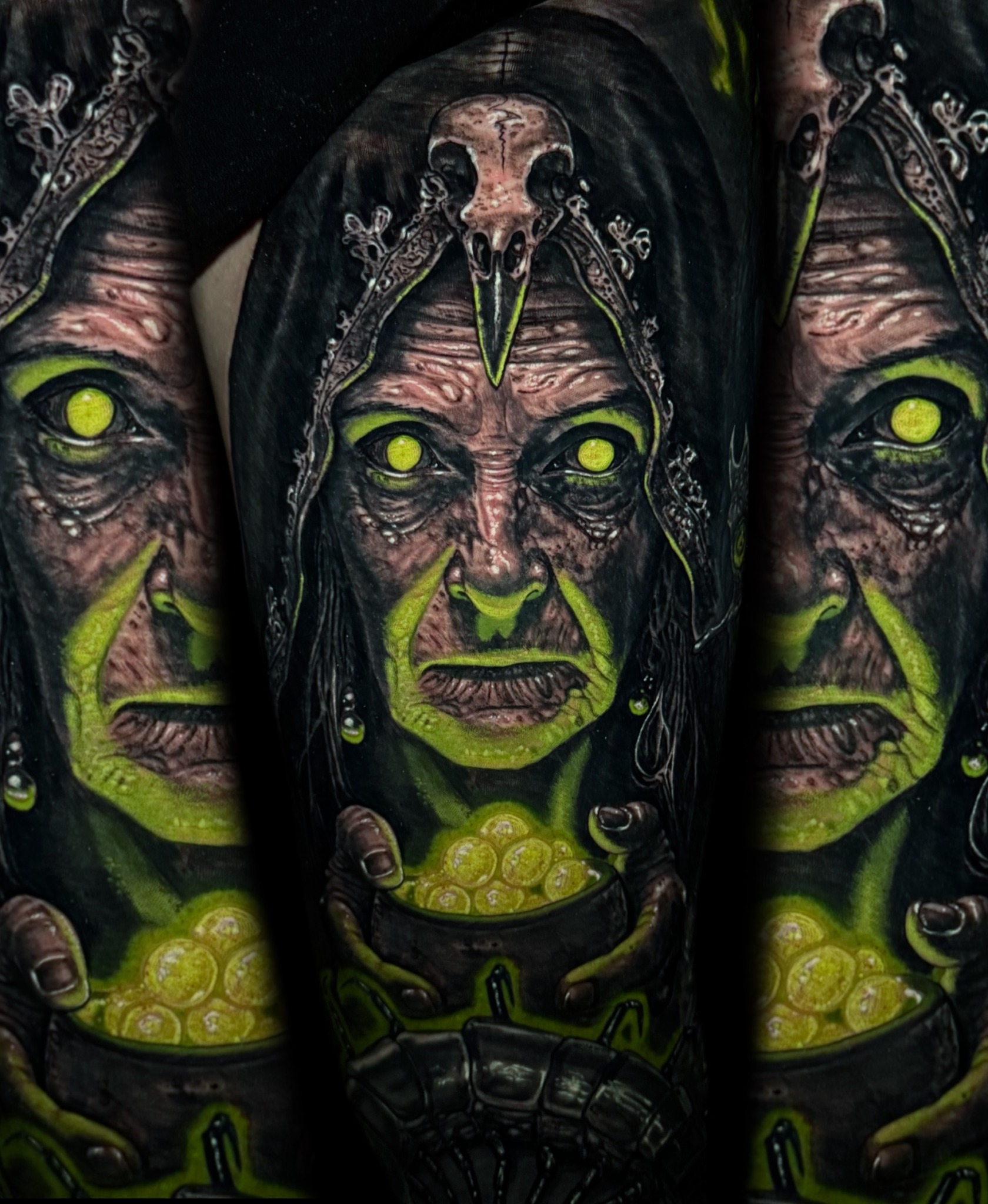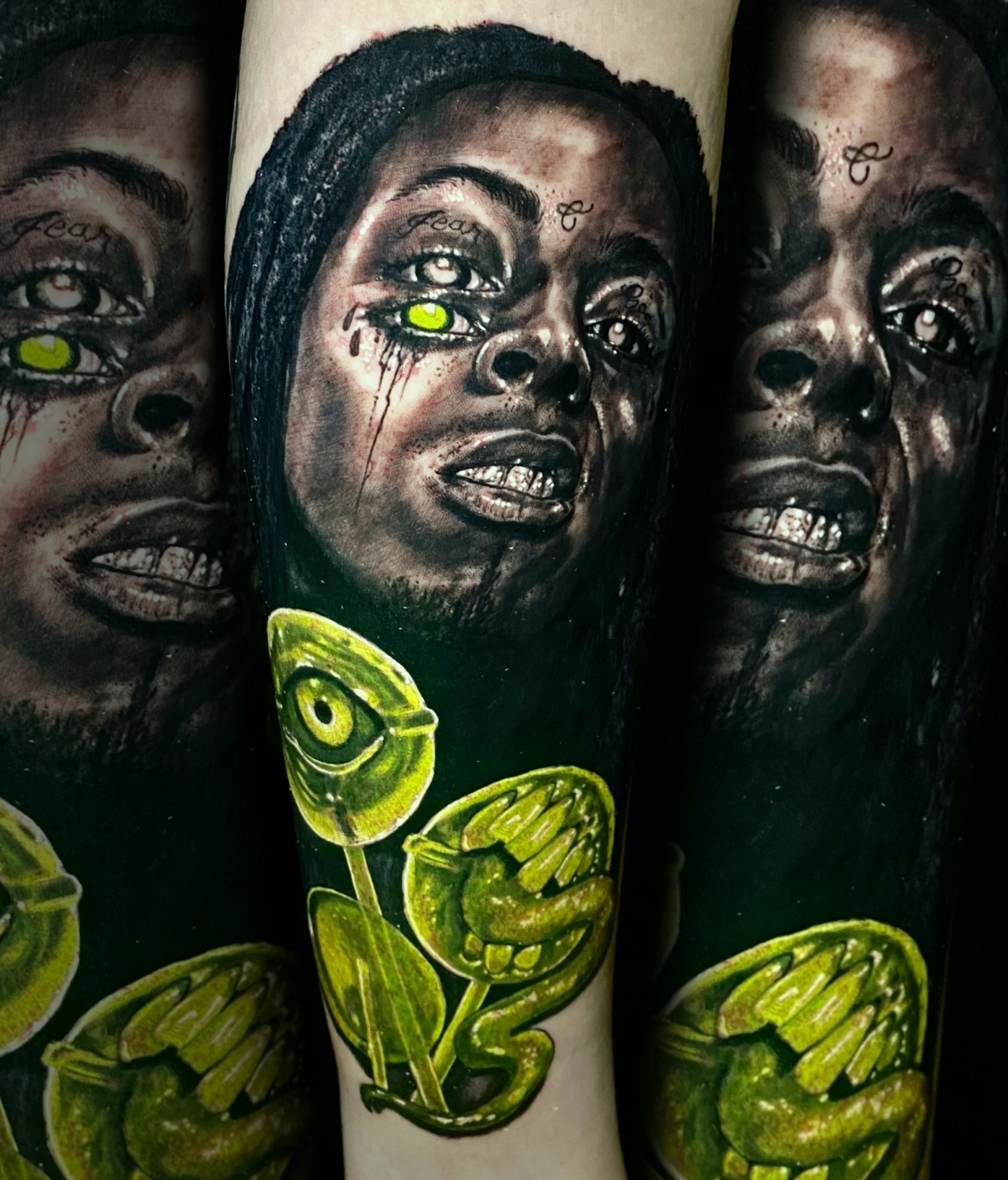 My tattoo style would be more of a neon Dark surrealism, but I also do color realism. I love working with clients to give them the most unique and custom design specific to them. I always try to turn a simple design into something we both love. My goal is to compete with myself by trying to make each tattoo better than my last. I’m also surrounded by talented friends and peers who push each other to progress.