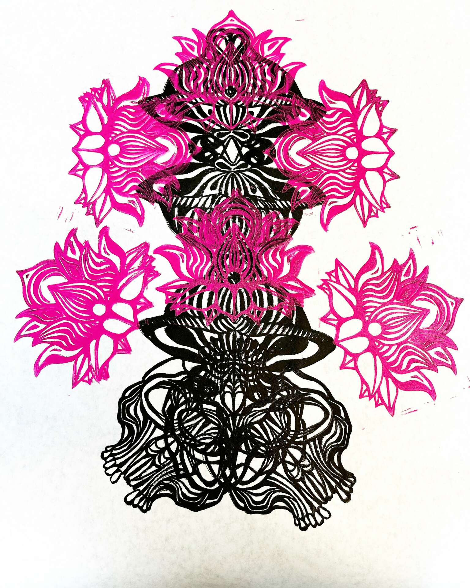Though I work in many mediums (paint, pen, dance, photography, etc) I have been focused on block printing as of late. I was first introduced to the medium in my 8th grade art class. In fact, I still have the stencil I made all those years ago. However the focus on that medium extended no longer than 2 weeks. I then revisited the medium on my own about 5 years ago and have been expanding on and refining my knowledge and skill on my own since then. The process is very much trial and error, so practice and consistency are essential for learning. In the process of refining the skill, I’ve found that patience is essential, haste makes waste in this craft. Some obstacles that stood in the way of my learning process were insufficient funds for materials, and not having an inspiration space to create in. In acknowledgment of these obstacles in the way of picking up the craft, I have been offering intimate classes in my art studio for those interested in learning a new medium. All materials are provided as well as shared knowledge of all that I’ve learned along the way.