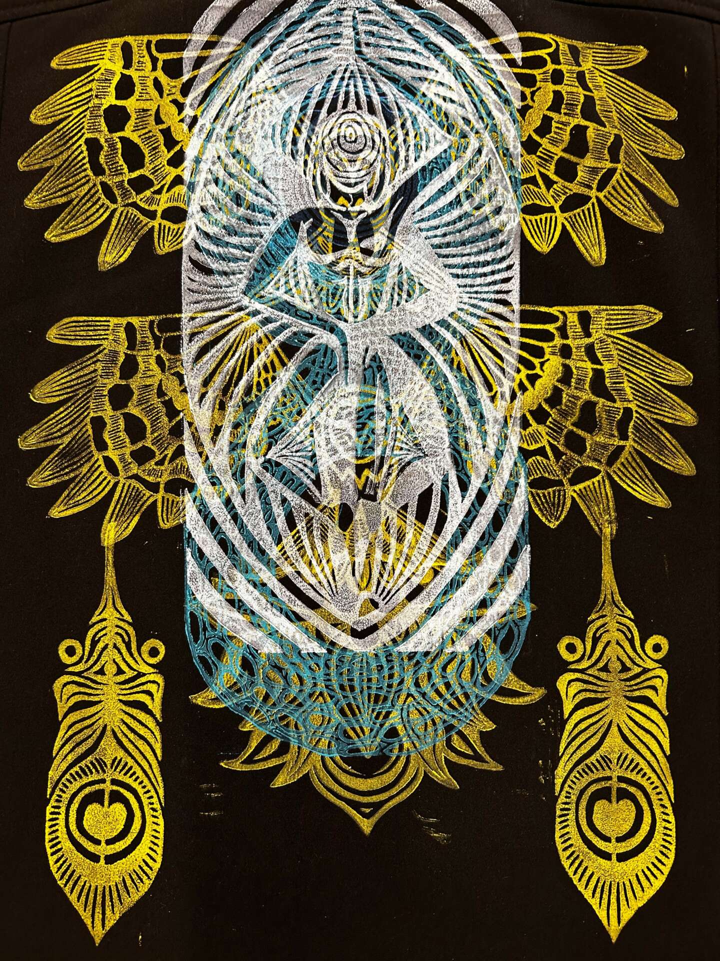 I have been creating my whole life, always eager for expression of any form. I have danced across many mediums, allowing creativity to flow through whatever channels it chooses, whether that be movement, music, visual art or performance. My roots span far and wide. However it wasn’t until about 7 years ago that I started to consider art as a career. I started out with my focus on painting, while I studied art in college where I developed a visual style of my own. Simultaneously, I was living with and learning from a prominent figure in the modern art world who taught me not to limit myself to one medium and to release the concept of “completion” from my work. Much like the ever evolving artist, the art should be able to do the same. Since then, (with a focus on visual arts) I have allowed myself expand into many other means of creative expression such as poetry, live performance paintings, modeling and photography collage work. Often times finding ways to allow mediums to intersect. However in recent months, my focus has been on fashion, implementing the skills I’ve developed in block printing to up-cycle clothes. The intention is to focus in on sustainability, rather than fast fashion, as well as reintroducing a sense of sentimentality to our belongings. Rather than discarding them when we feel we’ve outgrown them, breathing new life into them and allowing them to grow with us. I am excited to say I have been undergoing a sort of renaissance in my craft. For years I have been operating on intuition, sort of like a channeling from which I determine meaning after the fact. A process that served me as I was on a journey of self reflection and discovery. However recently I have been refining my process by taking the raw ore that is intuitive inspiration and throwing it into the fiery forge of intention, alchemizing it into something far more powerful that it was before. Much of my latest work is inspired by the lessons I’ve been learning in life, lessons that I have observed to be a relatively universal experience amongst others. With that in mind, I have been employing the universal language of symbols, allowing me to create art that speaks for itself without the use of words. The intention behind each stencil creates an energetic charge to each print.