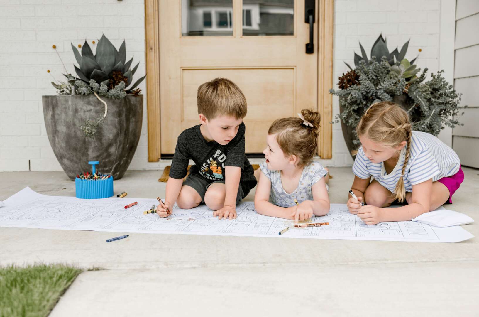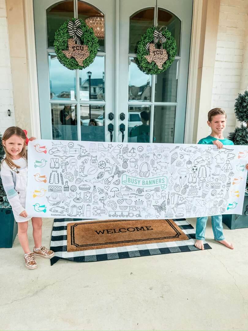 If you haven’t ever heard of a Busy Banner…it is a GIANT 2ft by 6ft coloring banner that is hand drawn and printed right here in Fort Worth, Tx! Each Busy Banner comes wrapped and ready to gift with a small package of crayons right on top!