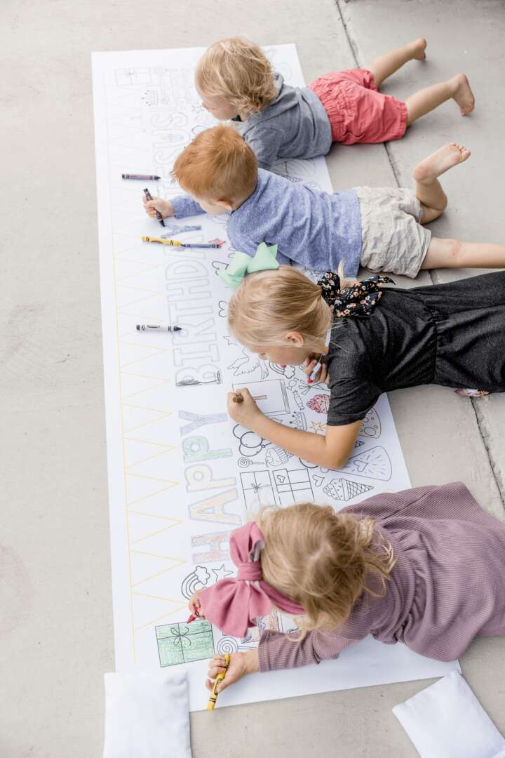 We were trying to make extra money to go toward the adoption of our second son, and I always have been creative and entrepreneurial. I remembered seeing a company online that was making personalized placemats and signs that were 3 ft long and I just thought to myself how fun would it be to make a coloring page and make it at least twice that size! When the printer arrived at my house – I got right to work and started drawing all of the elements for my first banner and designing it until it was perfect. It was right before Halloween so I decided instead of putting candy on our porch….I was going to use this as an opportunity to market my new business. I made small Halloween placemat coloring pages and wrapped them all individually with my business card tied to the top…I filled buckets with them and left them on the porch next to a huge bowl of crayons. By the time I got home from taking our little ones trick or treating…the porch was empty! The orders started flowing in soon after.
