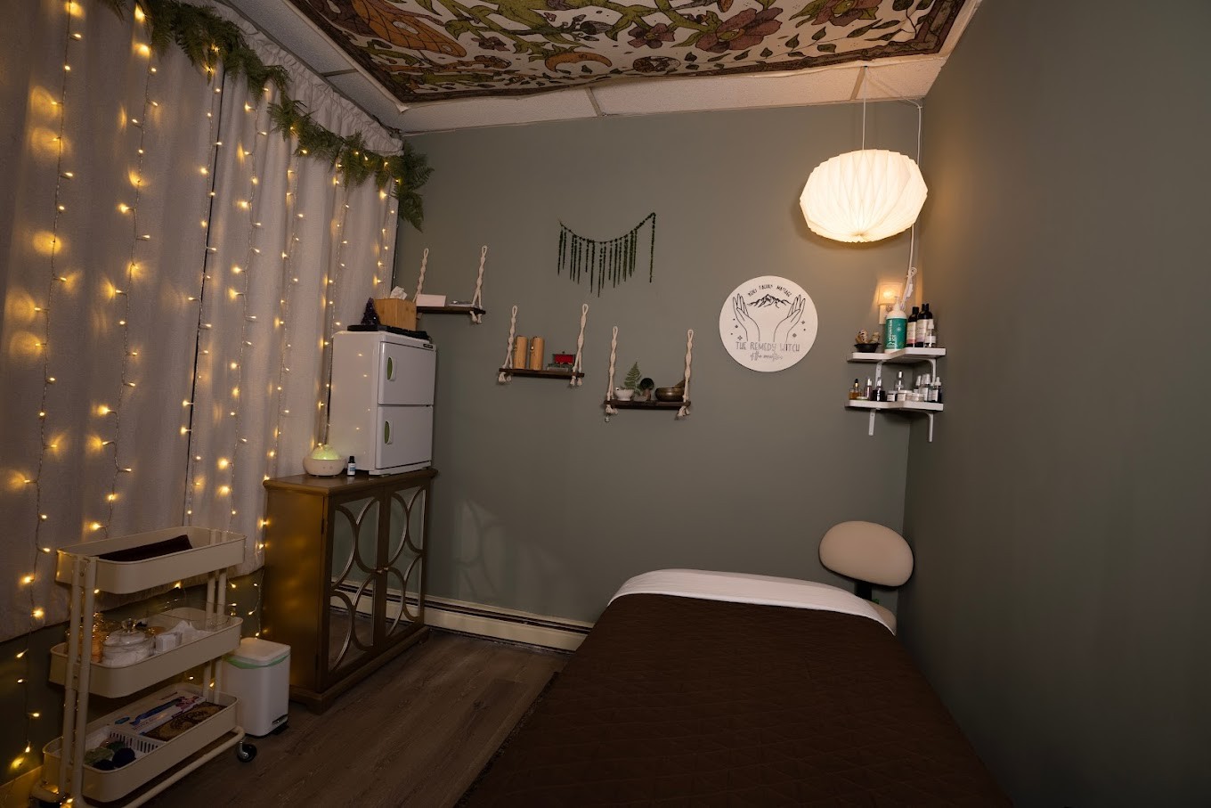 About a year after opening my little office I was ready to expand! I wanted more space. At the same time that we found our house that we ended up buying, I also found a storefront space to rent just around the corner. I had enough space to rent out an office and still have my own office and a shop/reception area. A friend of mine and someone I had worked with in the past joined me and opened up her massage business in my additional office space. We work extremely well together and have very similar style so I knew it would be a great fit. I have created the space to resemble the forest with the iconic fern in the logo. I decided to call the shop “The Remedy Studio – Holistic Wellness” because it became more of a collective. I still operate as “The Remedy Witch” and have gained my following around that name. I am now booking about a month out and some days I get too lost in my business and forget my own self care. It has been difficult for me to find balance but I have gotten better at limiting my availability to create my own boundaries. My service menu consists of massage rituals, myofascial release, Reiki healing, and Herbal facials.