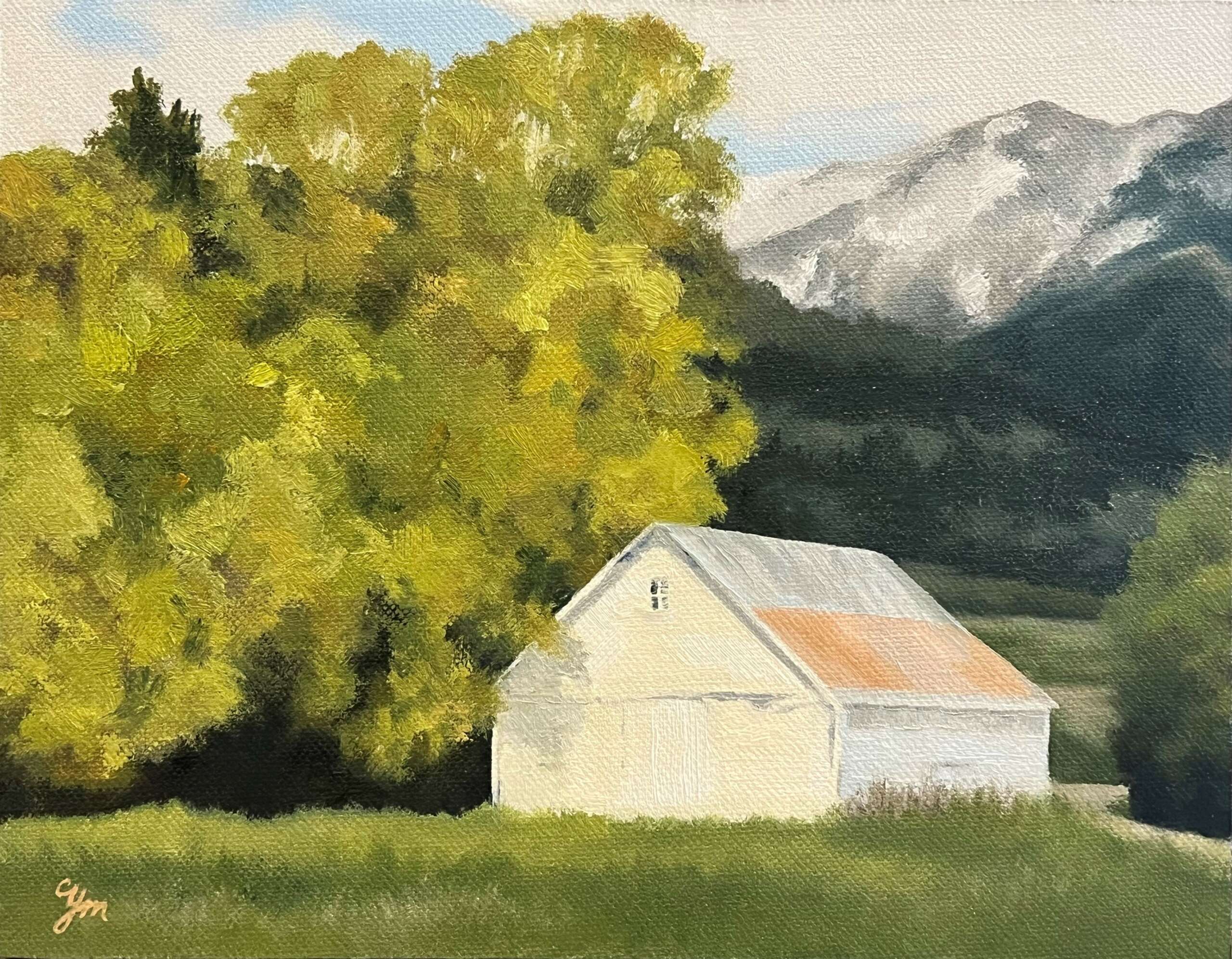 I knew from a very young age that I loved to create art of all kinds. I loved paper, pens, paints, and markers – always having some creative project in progress. And remember winning a Best of Show ribbon at one of my elementary art shows. I still have that ribbon and the artwork which are like a portal bringing me right back to that season of life. I believe that finding joy and success in art at that young age brought me a kind of satisfaction/validation that has stayed with me my whole life. Of course, at that age I had no idea how to put words to that feeling, but it felt like I was doing what I was meant to do. I feel very fortunate to have spent my high school years attending a larger public school which provided an unexpected blessing that came in the way of a vibrant and robust art department. Through the dedication of those teachers who had active art careers outside their classrooms, I was drawn into an art world that opened wide possibilities of all kinds. My time in that hive of activity was infused with challenge, invitation, advice, pushing of the preconceived boundaries and the opportunities to experiment with mediums and techniques I had never seen or used. During those years my desire to be an artist grew but I continued to follow the “you need to work on getting a degree in something that will make you real money” mindset, since it seemed to be the practical choice. I managed to include a few art classes in my college years which were the only classes I loved, funny enough. As I have aged, I have purposely sought out opportunities for art education through workshops with artists I admire and other online classes. My return to creating seriously began just after my children were born. I connected with one of my favorite high school art teachers and she again worked to bring me face to face with a new medium and walked me through the process of learning to paint with oils. Through that medium I have been able to find myself as an artist and to confidently bring my love of the Montana landscape that surrounds me to others through painting.