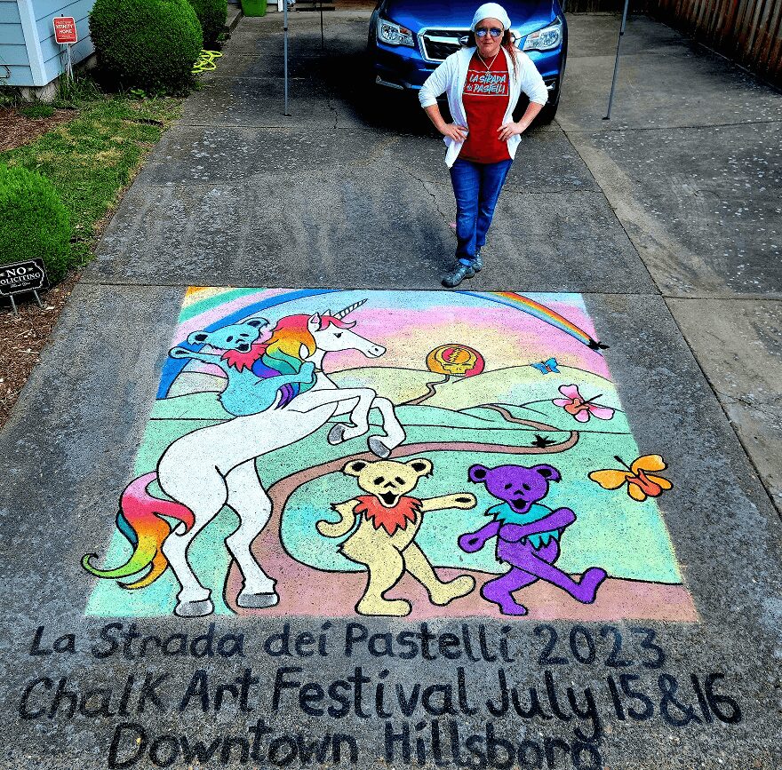 Eventually I joined yet another art committee, Tualatin Valley Creates, as the Team Lead for Chalk Artists. I learned how to create large scale chalk murals on the street.