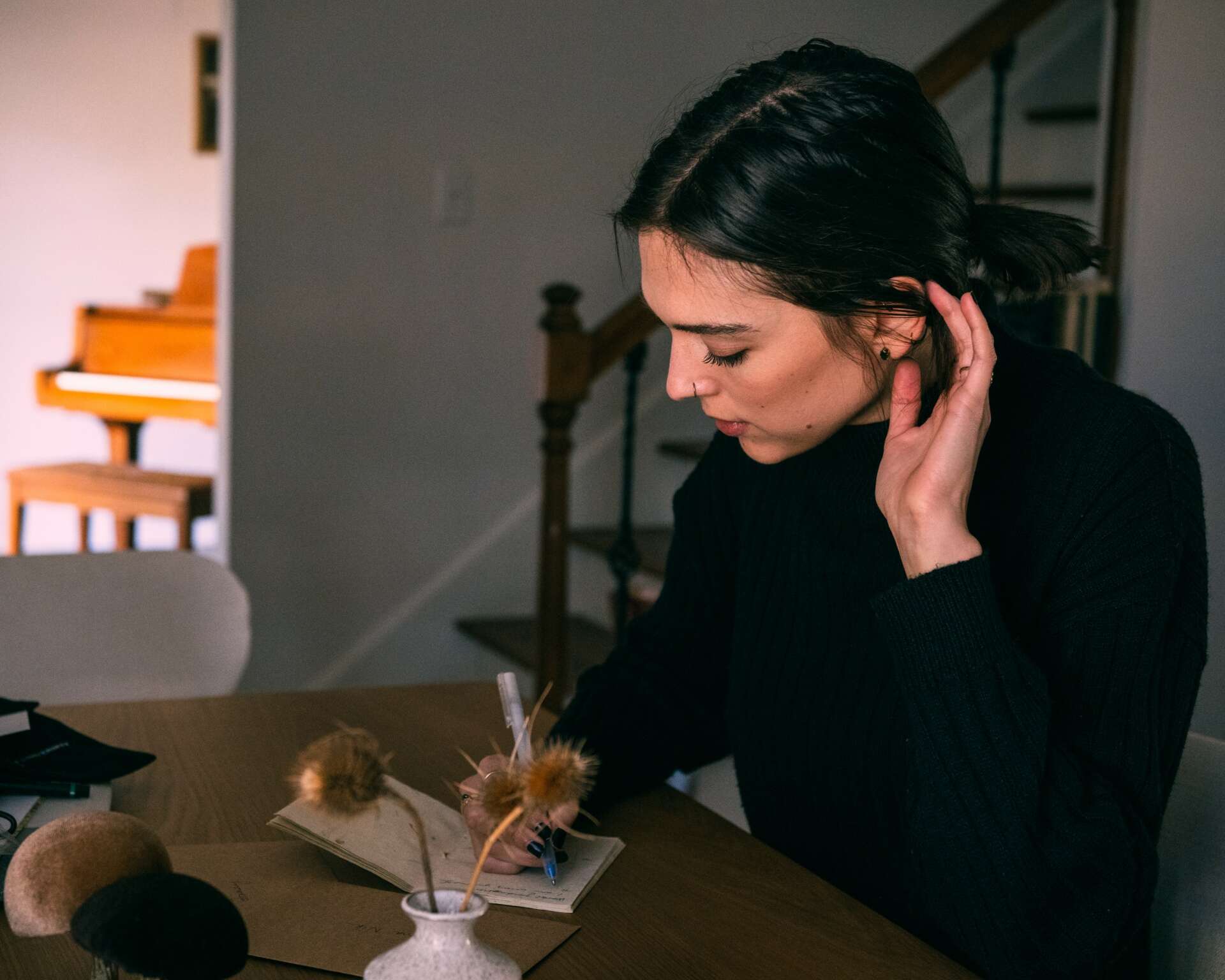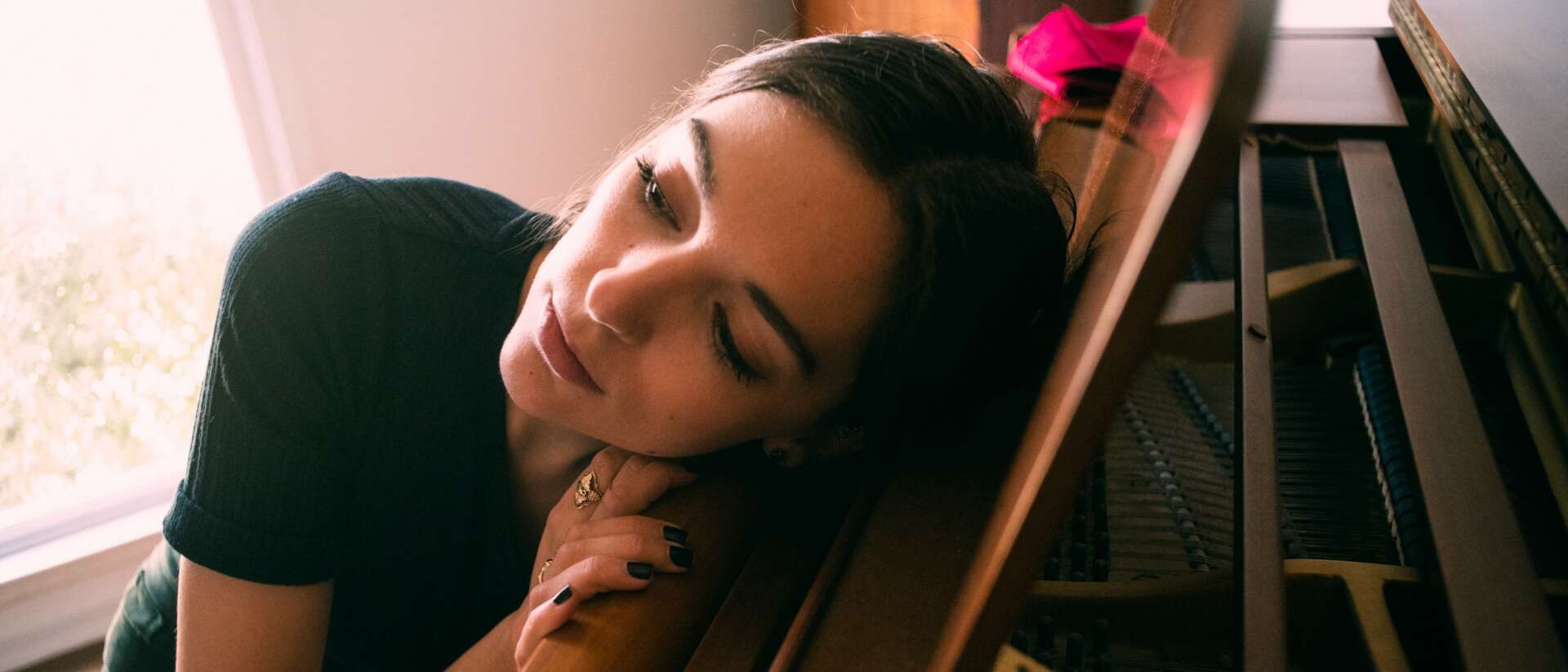 Home Nashville shoot (cover photo, writing in black sweater, head on piano) by Lucius Patenaude