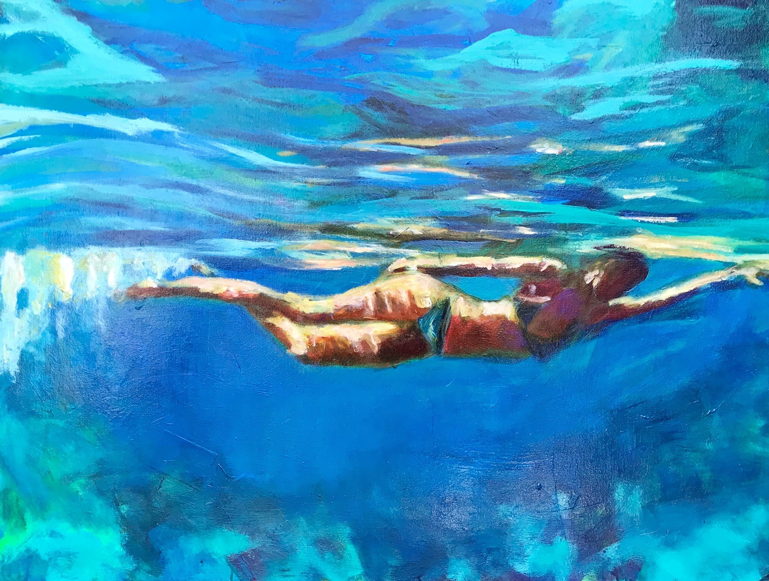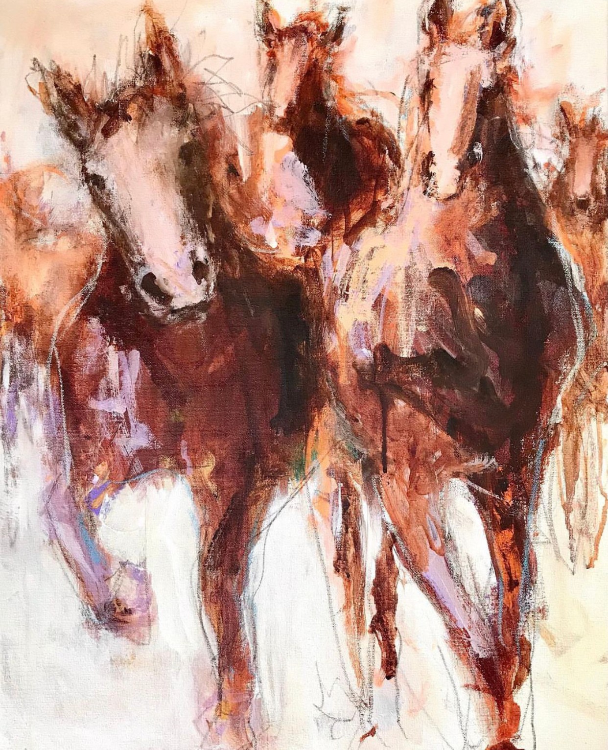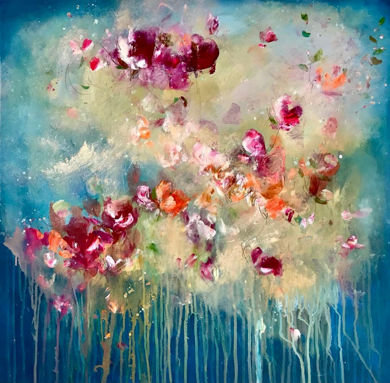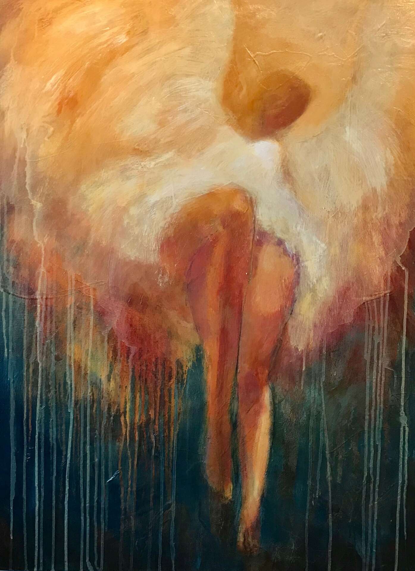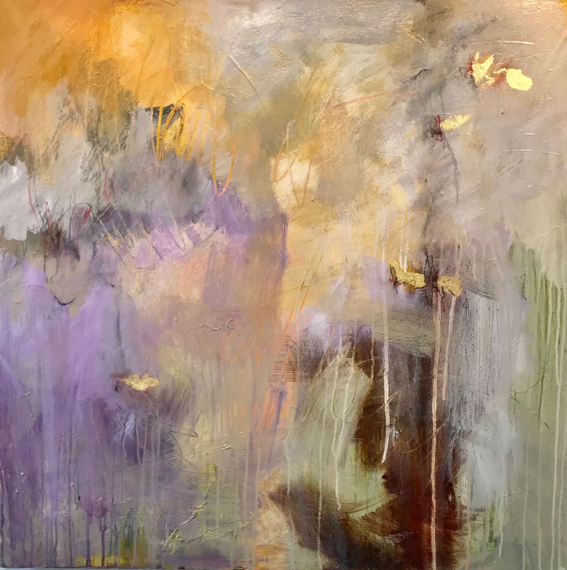 A lesson I had to unlearn was to be an artist you have to be born naturally gifted and talented. This was not my experience. I had to learn how to paint, taking years of trial and error, stop comparing myself to others that were better and most importantly NOT listen to my critic who always told me my work was bad. Once I made the decision to learn, to understand my work was amateur , I made progress. I looked at lots of art for inspiration, copying and learning to find my way. I switched from Oils to acrylic because acrylics helped me be looser, using water and my hands to play. I credit Robert Burridge’s style as a huge influence. He modeled having fun painting, something I had never seen before. He used paper towels as a brush, his hands and he was laughing while creating. I had only seen painting as serious in college, many rules of composition, laying out the palette in a certain order, using the right brush etc. I was so stiff using those techniques which resulted in stiff paintings. Once I started using water and acrylics, finger painting and throwing paint, I was having fun which started to result in more lively and interesting paintings. My goal in painting is to surprise myself, to find interesting marks and create a lively atmosphere.