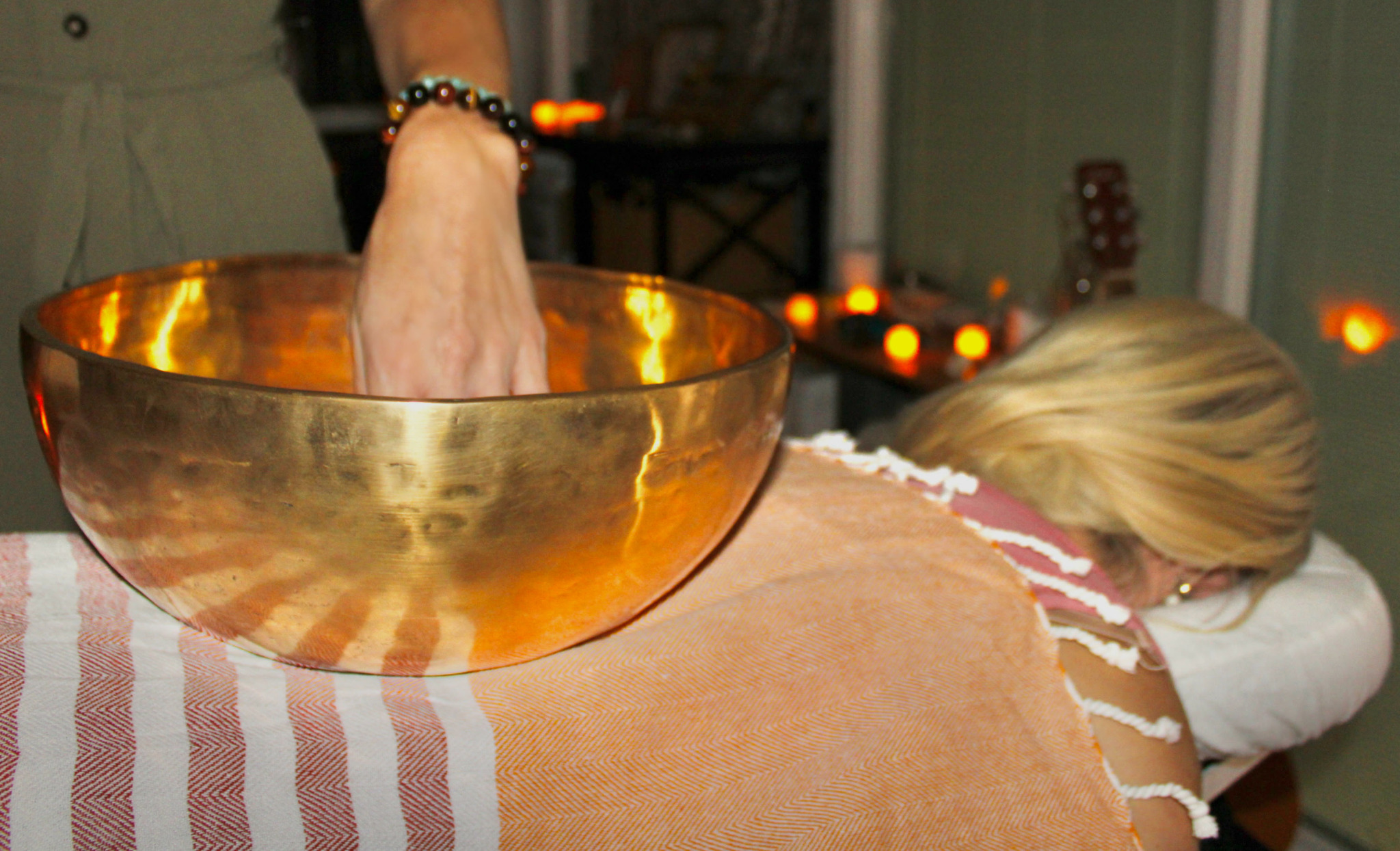 Vibrational Sound is a very wonderful method of healing. Since my first sound bath at that out-patient program, I was hooked. It took away the worries and thoughts in my mind and left me feeling an all over body relaxation. I could not wait to share this with the world. I could help people again, without the strain of massage therapy. I am now certified in Vibrational Sound and have been practicing for one year! My husband and I moved back to Florida recently and everything has fallen into place. Lately, I have been involved with sound bath events in St. Augustine and Jacksonville. I travel with all of my instruments and set up wherever I am needed. My instruments include: Crystal Bowls, Himalayan Bowls, Chimes, Buffalo Drum, Water Disc, Wind Wand, Thunder Tube, and The Gong. The collection is growing as we speak haha. I traded in the love of alcohol for the love of sound healing. Thanks to my cousin, who owns an amazing recording studio in Elkton, I also use a lovely speaker and subwoofer to create an all over vibration. Clients are asked to lie in a comfortable position either on the floor with a yoga mat or in a comfy chair. I guide them along the way starting with a few cleansing breathes. As time seemingly disappears, the different sounds and vibrations from the instruments commonly have the group enter into a relaxed state. In this state, there is potential to receive any combination of the wonderful benefits that come along with the experience. Many clients show up with similar problems that I had when I was drinking. Some show up with stress, depression, agitation, etc…Before every sound bath, I pray that everyone gets something out of it. Everyone usually leaves happy and relaxed. It feels great to know that I could possibly help someone in this way of intention and sound.