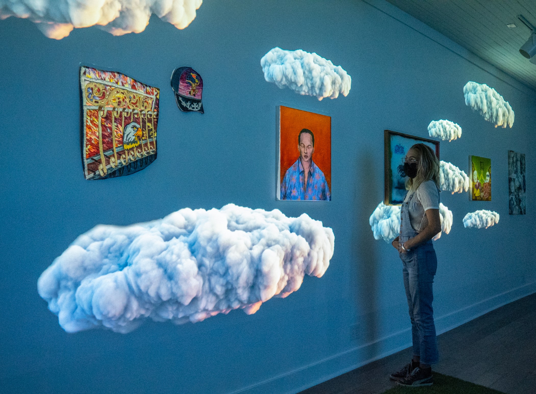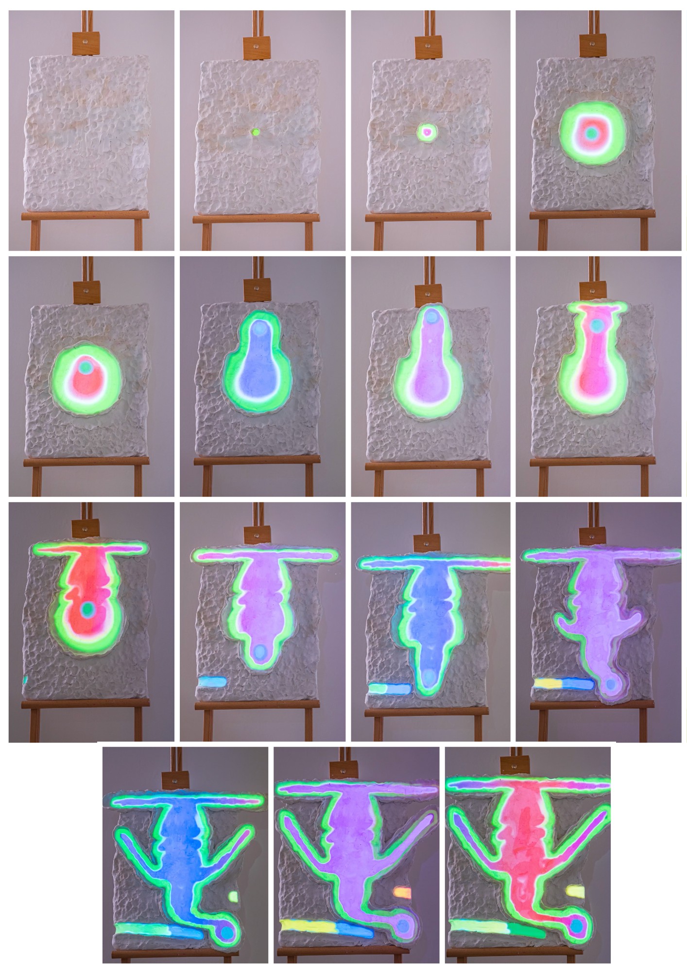 Most of the images are still frames of my claymation light sculptures. The image with the two seated figures: Immersive space “Geraldine’s Place” exhibited with Art 84. (My role: New Media Director) The image with the clouds: Immersive Video Art Screening “Video Picnic” exhibited at Martha’s ATX. (My role: Co-curator and New Media Designer)