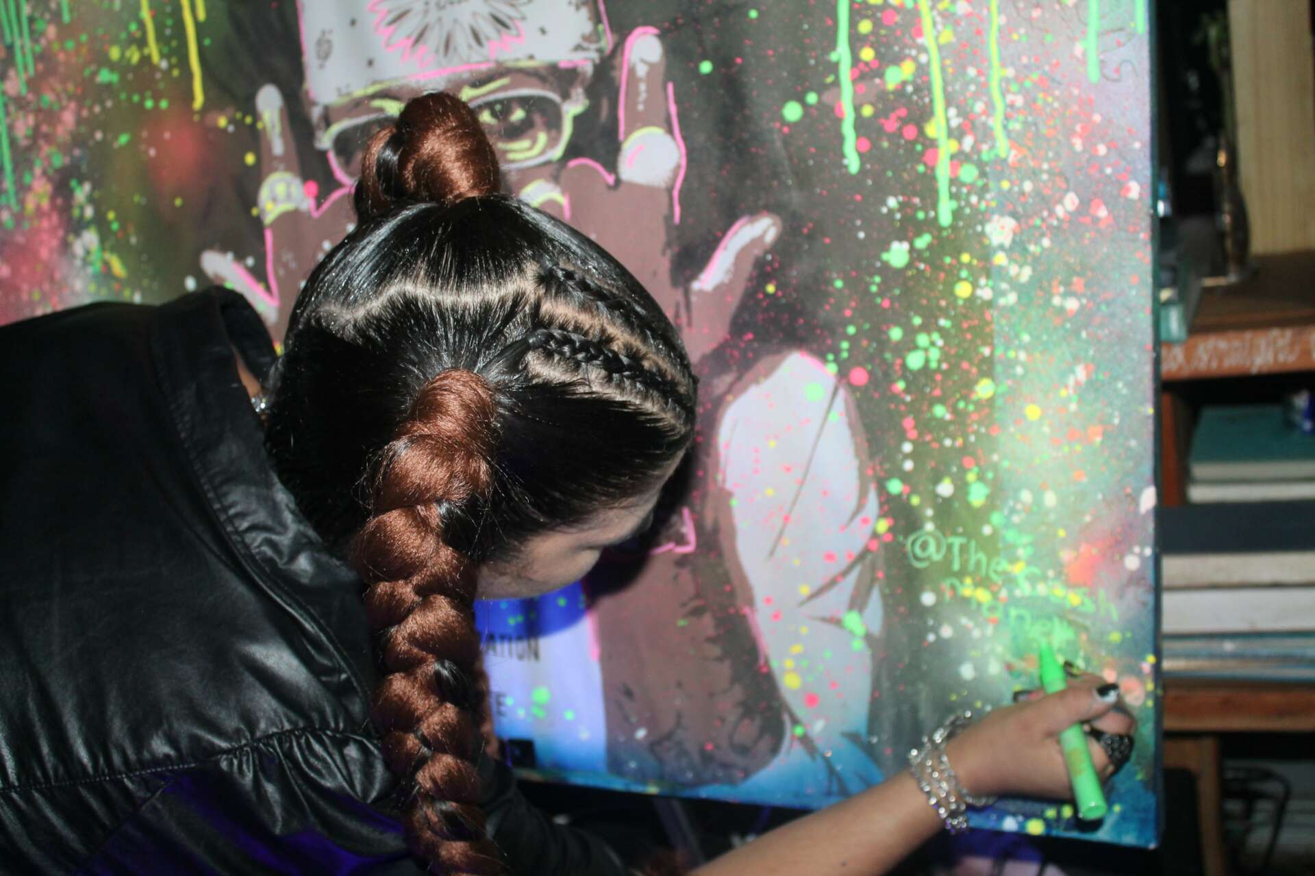 Custom paintings have been my backbone since my teenage years and I still pride myself in producing customer pieces. My favorite new way of showcasing myself and my art is through live installations. All-inclusive of neon lights, glow paint, and personalized photo tracing, I take someone’s photo which is personal to them, and recreate it with a technicolored chic design, accentuating the emotion illustrated in the photo. Some pieces can be coated with resin elevating the piece and making it suitable for wall featuring in one’s home.