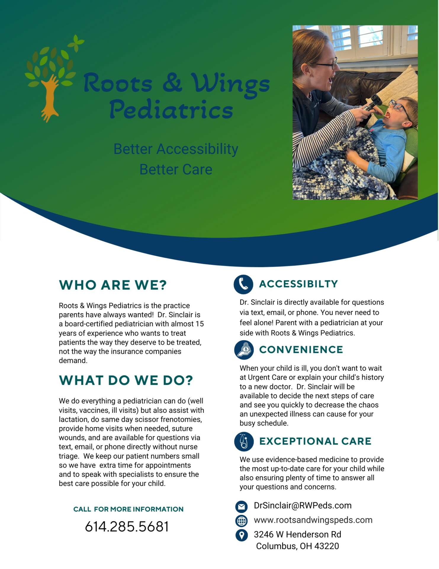 My name is Catherine Sinclair and I am a Concierge Pediatrician in Columbus, OH. After working in a major hospital system for almost 15 years, I decided to open my own practice to treat patients they way they deserve in a way that works for their family! All patients have my cell phone number and can call or text anytime (yes, even evenings and weekends) and can be seen within hours of their call if needed, sometimes even in their home! My patient panel is small and they are all like family to me. Our healthcare system in this country isn’t working and people don’t have great access to evidence-based medicine with a known and trusted physician. While my practice is small, I’m thrilled to offer people an alternative solution to traditional insurance-based healthcare at Roots & Wings Pediatrics!