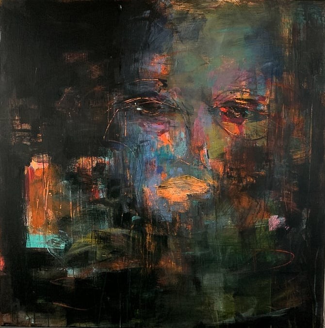 I view my work as being process-oriented. The first few paint strokes are extremely impulsive. I enter a sort of spiritual or meditative mental space. I stay in this safe place for as long as I can, but I eventually step back to see what I have painted. To others, I am not sure what they see at this stage, but I see a world of images. I see my thoughts, safe places, fears, stories of my life, fun times, and bad times. Next, I start chasing some of the images that I see. Each stroke turns into another image. Each dot of paint contains its own world, evoking its own feelings and experiences. Every movement of my eye or dot of paint changes the story and the images keep moving. The hardest part is when I must commit to the final image. I work slower in this stage and plan each stroke carefully. It is a struggle between what makes sense visually and the little pieces left from the first impulsive marks. I have heard that if you can figure out your paintings, you can figure out your life. I have not figured it out and it may take a lifetime. I don’t want to lose the secret places that come from my soul that only I can read, but I don’t want a viewer to get inside my paintings and see everything that is under it either. My works are the results of these intense and intimate conversations spoken in the language of form, space, color, and gesture. While my paintings may feature forms or silhouettes, they are deeply connected to the process of painting, which mirrors the process of living itself. In my artistic process, I strive to find a balance, replicating the constant struggle that exists in all aspects of life. As I work, the figurative forms within the composition come to life, providing structure to the layers of underpainting beneath. These implied figures serve to mask or distract from the raw honesty that I may not be ready to fully reveal. In a way, the figurative forms in my art reflect the masks that each of us wears to navigate daily life.