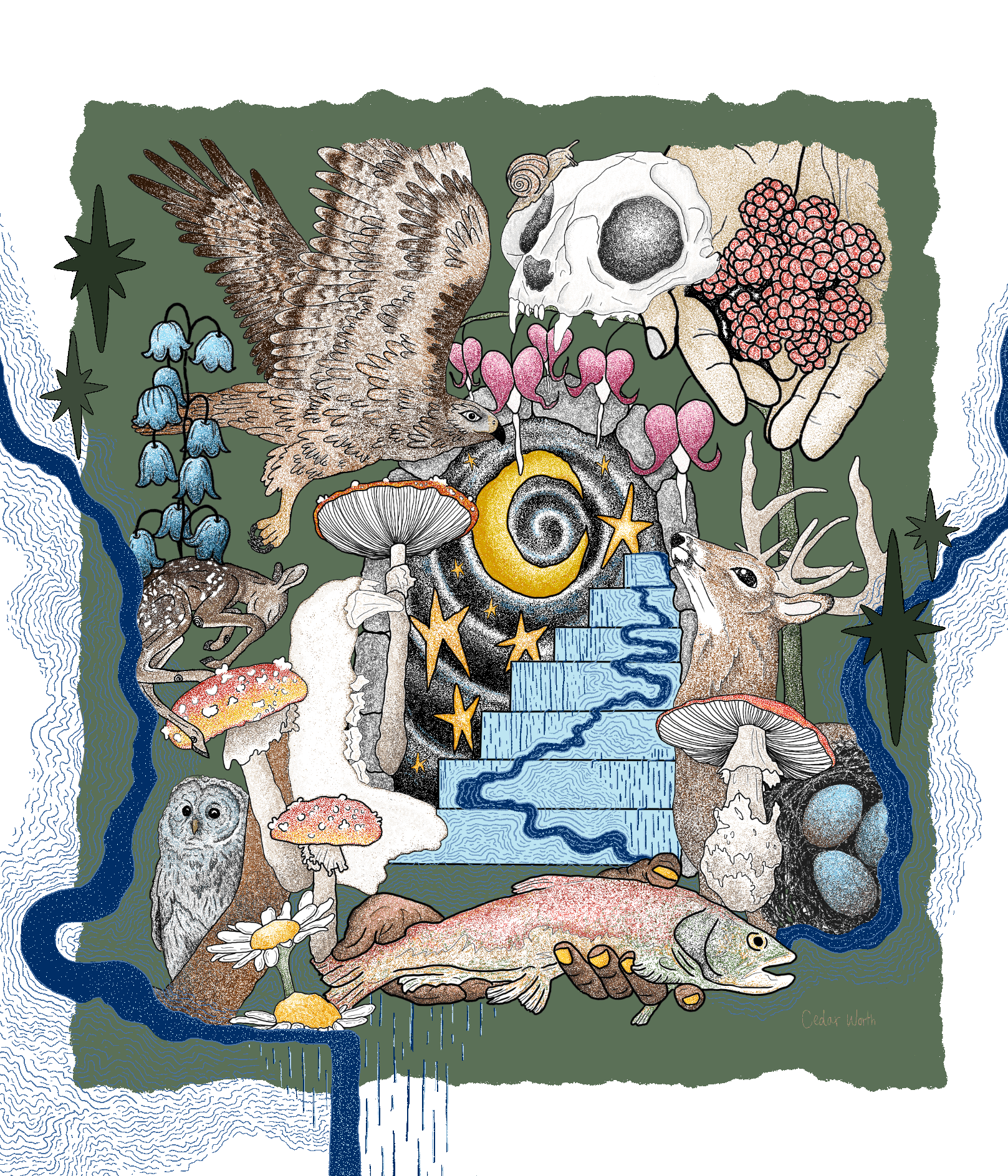 I enjoy drawing and have been having so much fun using procreate on my Ipad lately. I’m greatly inspired by nature and my spiritual practices, but also love to just doodle and see where it takes me. Drawing, as well as collaging, is something that is very soothing. I love stippling, and seeing all of the little dots is incredibly satisfying, as is cutting out images and the less structured process of collaging.