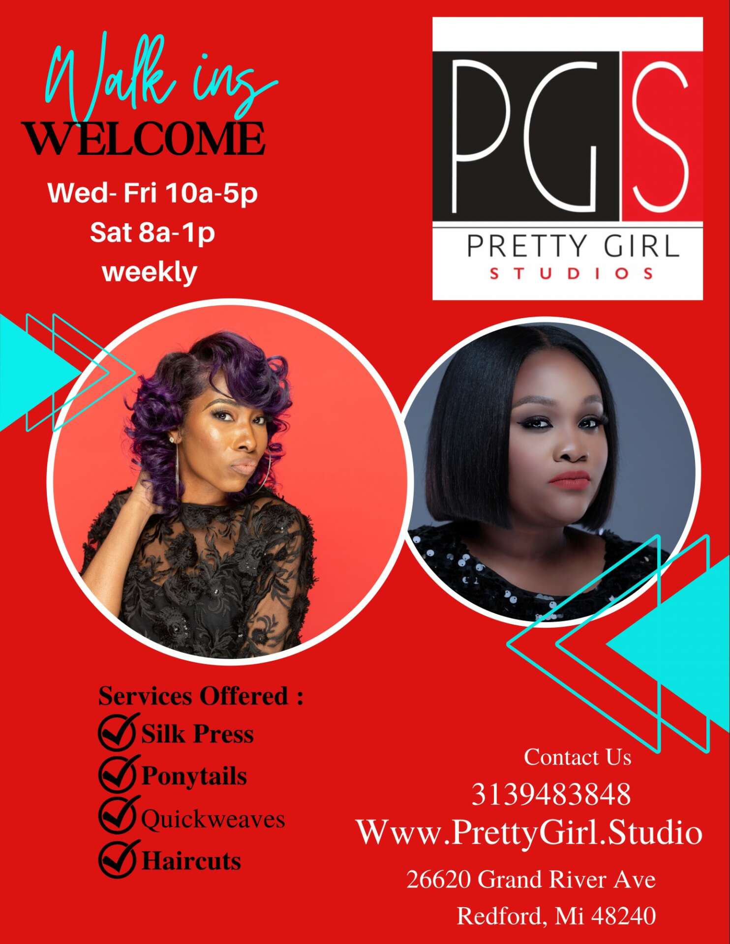 My name is Chantele Gray and I’m the owner and operator of Pretty Girl Studios Salon and PGS Cosmetics. We’re located in the Metro Detroit Area. We specialize in healthy hair care maintenance. The services we offer are Silk Press, Relaxers, hair cutting and Hair Coloring services, ponytails, and more. It is our priority to give our guest excellent customer service coupled with a great experience in a warm, inviting, professional and friendly atmosphere. It’s our goal for all of our guest to look and feel like a Pretty Girl when they leave our salon.