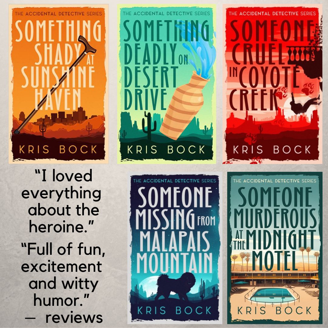 In the Accidental Detective series, a witty journalist solves mysteries in Arizona and tackles the challenges of turning fifty. In the upcoming Reluctantly Psychic series, a quirky loner who can read the history of any object with her touch gets drawn into mysteries when people bring troubled artifacts to the museum of oddities where she works.