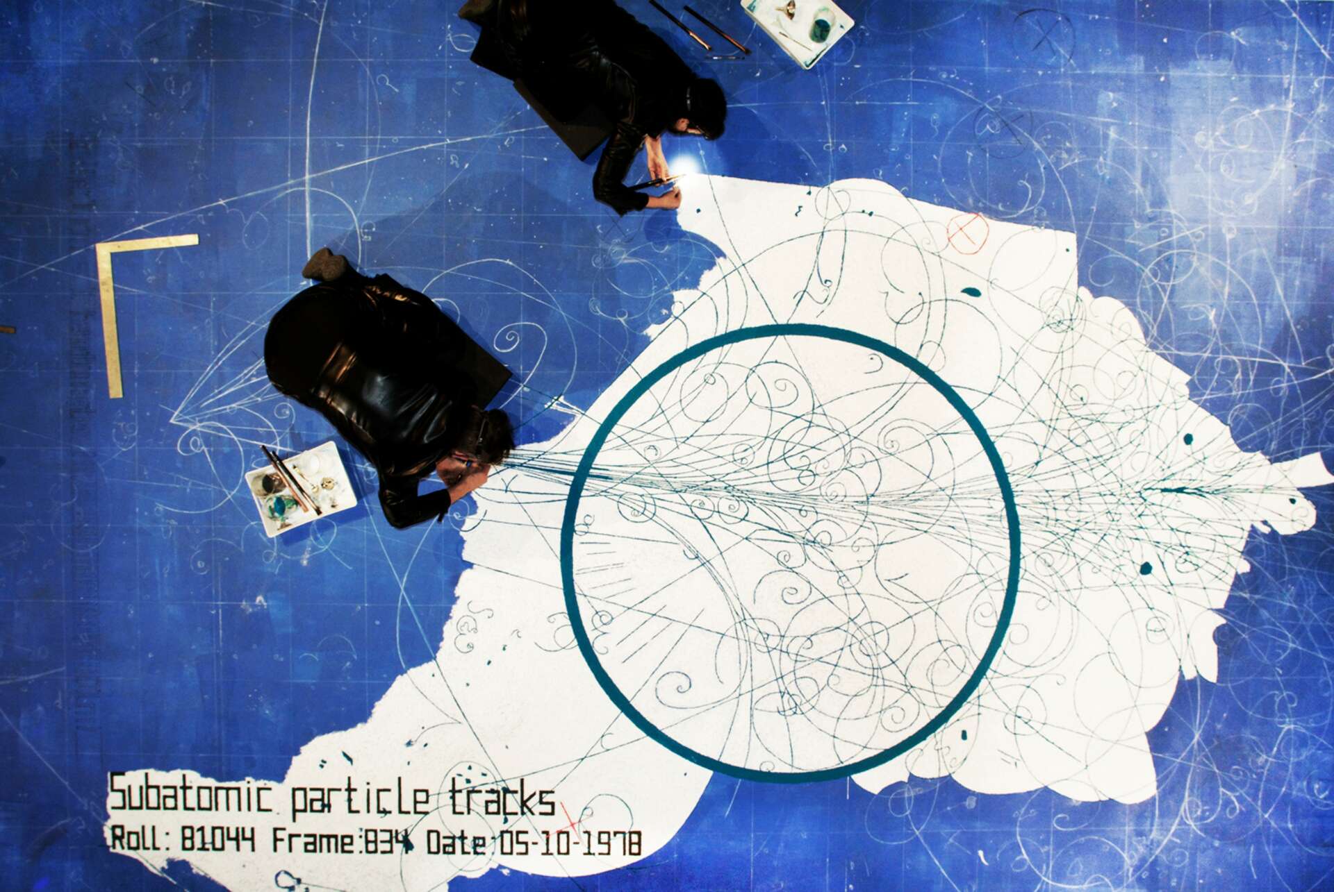 Our multidisciplinary installation, DATAATADATA: Everything and Nothing centered on a 30 day performance where we created a 20 ft x 16 ft mandala. Using the raw data of a subatomic particle collision, we painstakingly laid out the image with powdered marble dust. This project connected us with Fermilab and gave us the opportunity of a lifetime. Fermilab gave us special access to the projects and scientists working on the bleeding edge of scientific discovery.