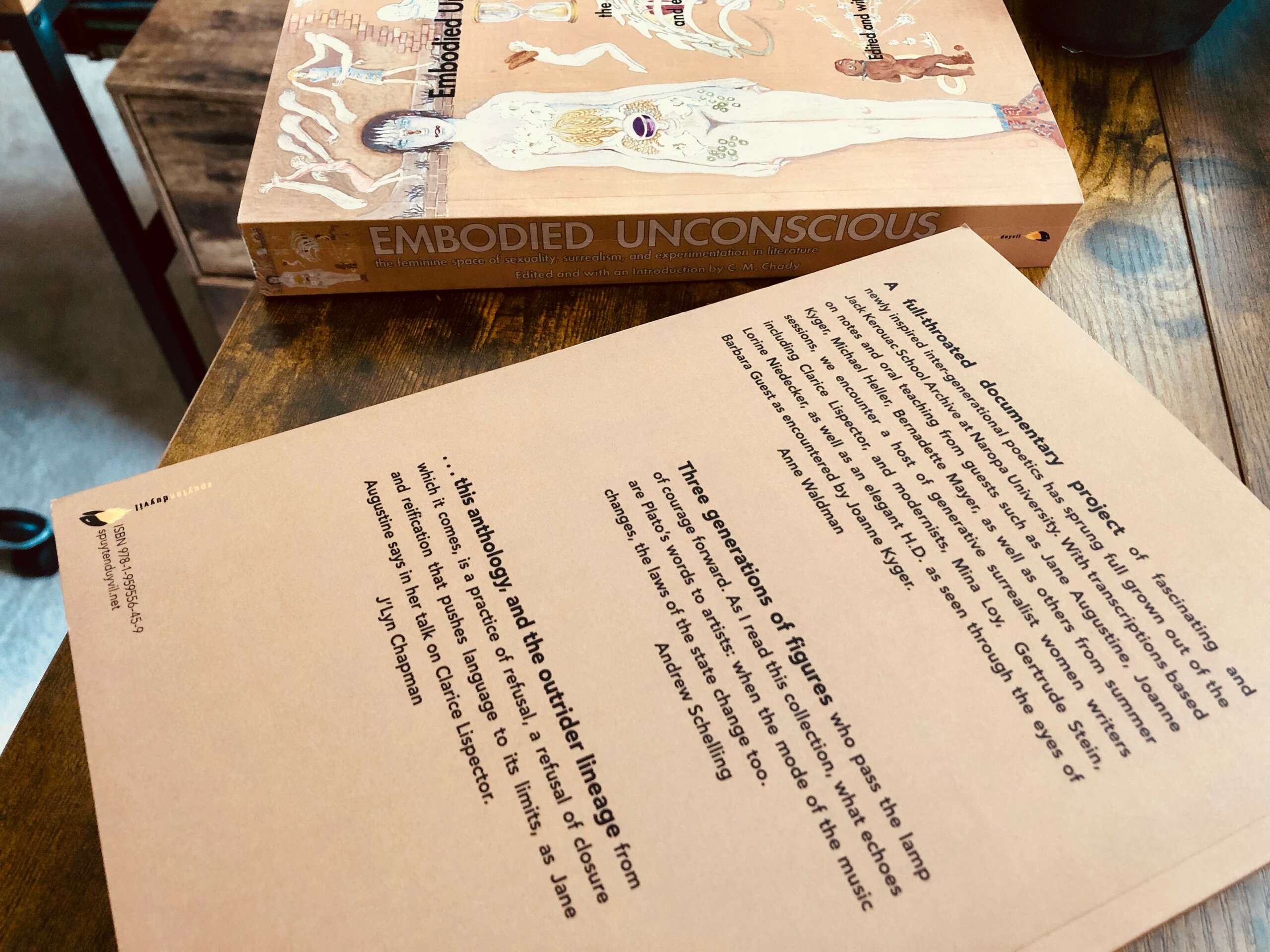 A second project which has finally culminated for me is my anthology Embodied Unconscious: the feminine space of sexuality, surrealism, and experimentation in literature, which was published with Spuyten Duyvil. I first conceived of it as I finished my MFA Creative Writing and Poetics. We were initially assigned as a part of the Summer Writing Program to transcribe a lecture from their extensive archive dating back to 1974 (shout out this year to their 50th anniversary!). As I combed through the audio recordings and let the voices of the past wash over me, I found it difficult to choose just one to transcribe. There was so much richness in the generative lectures and hearing these voices of twenty – thirty – forty – years in the past reverberating in the room and still so relevant; I knew I wanted it to be more. I aligned fourteen lectures around a similar theme exploring select women writers’ contributions to poetry and how they expanded our use of language. As the archive is a myriad of voices, I wanted the anthology to mirror this as well so that it could be a living discourse through the years. I invited my other cohort members to assist with transcribing the lectures and writing our own interludes to serve as a contemporary reflection and introduction to the lectures. Each has their own style, some more poetic and experimental, others more scholarly or informative. We started this at the beginning of the pandemic as well, so in a time where everyone was forced to either virtual interaction or isolation, we found a way to continue to connect with one another. My hope for the project is that is can serve as a companion piece for curious writers who hope to expand their practice and learn of new women poets. It could certainly be a piece for individuals, but I also designed it to be 14 chapters which could easily compliment a course syllabus.