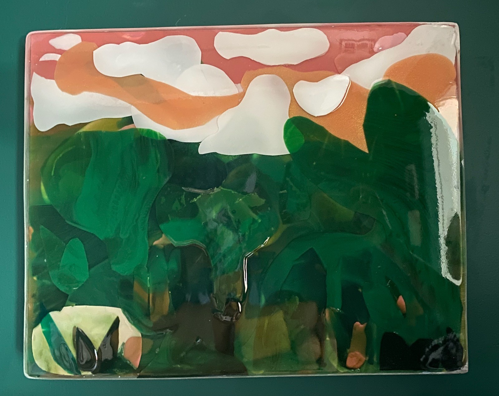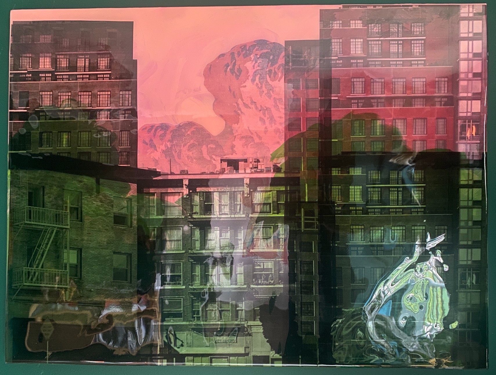 Working with resin has given me the opportunity to layer my pieces in a unique and sculptural way that reaches out to the viewer and pulls them into the depths of the work luring them to be touched. The slick glossy feel of the surface gives some pieces a slick sexy quality, while in others, the resin forms a hard shell encasing images forever inside. The way the resin creates different moods inside each piece mirrors the contradictory experiences of LA. Typically I tint the resin with acrylic or inks, and occasionally there are found objects trapped inside, or more recently, transparency prints sealed into the works. My dream is for these works to become a part of this city’s history, while reflecting its resiliency.
