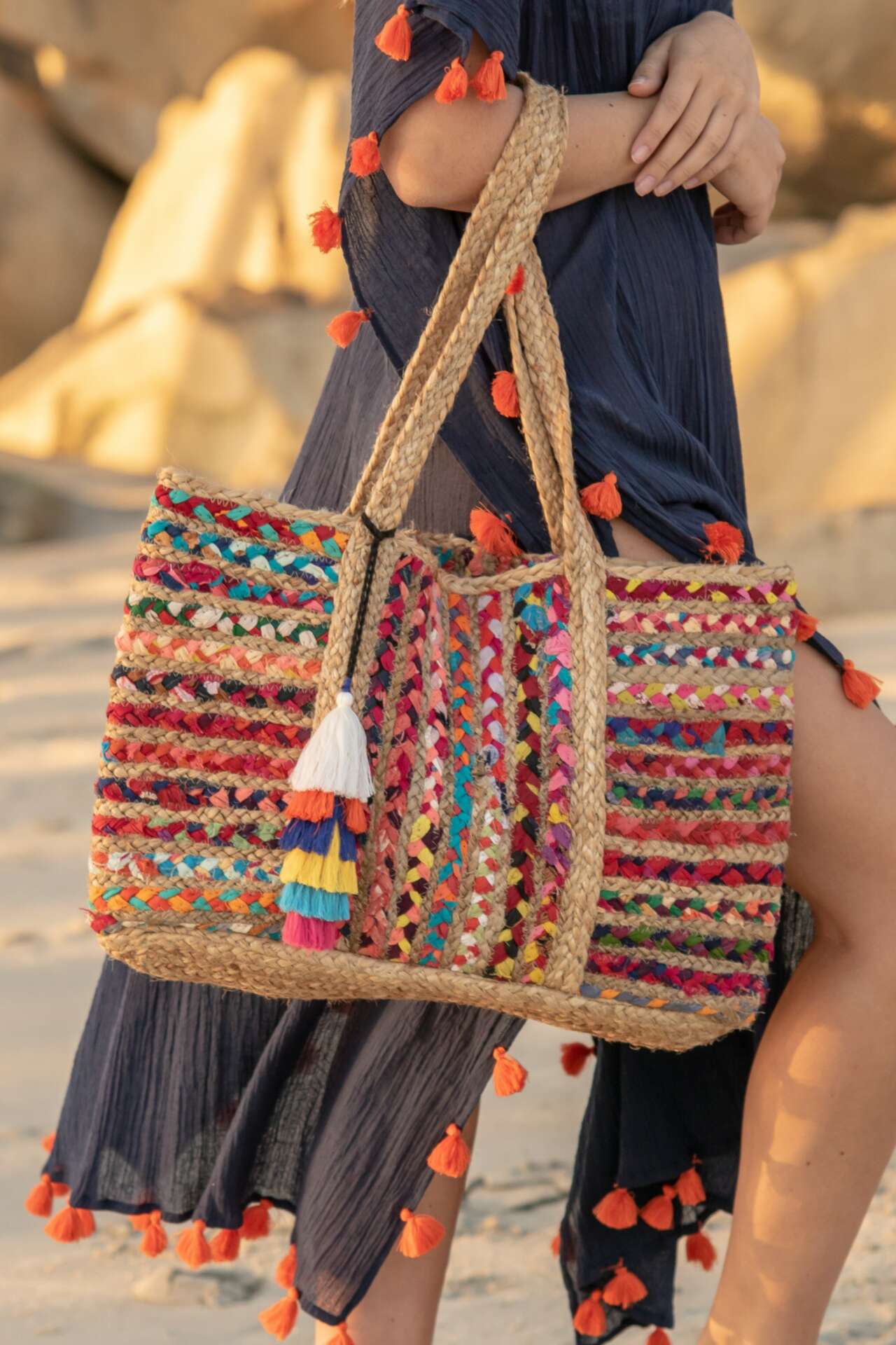 We work with artists all over the world to fabricate our designs. Our current Santa Barbara Collection is made in India using remnant fabrics which not only makes our bags bright and colorful, but eco-chic too. We hope to continue to bring more eco-conscious designs to our line.