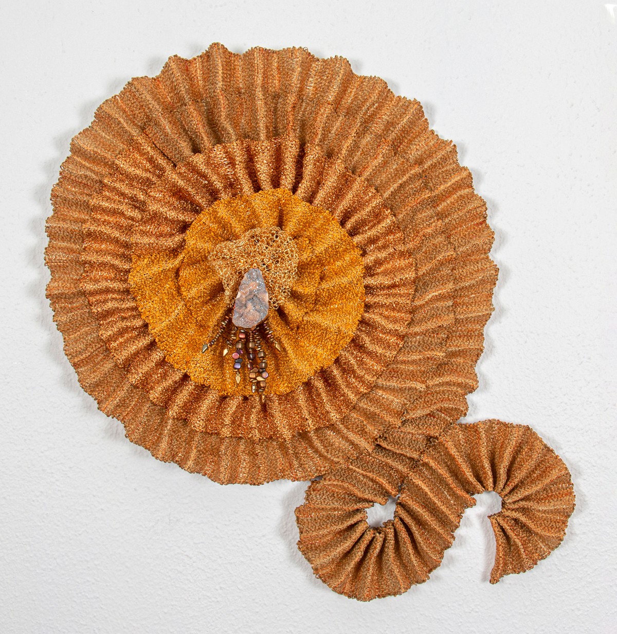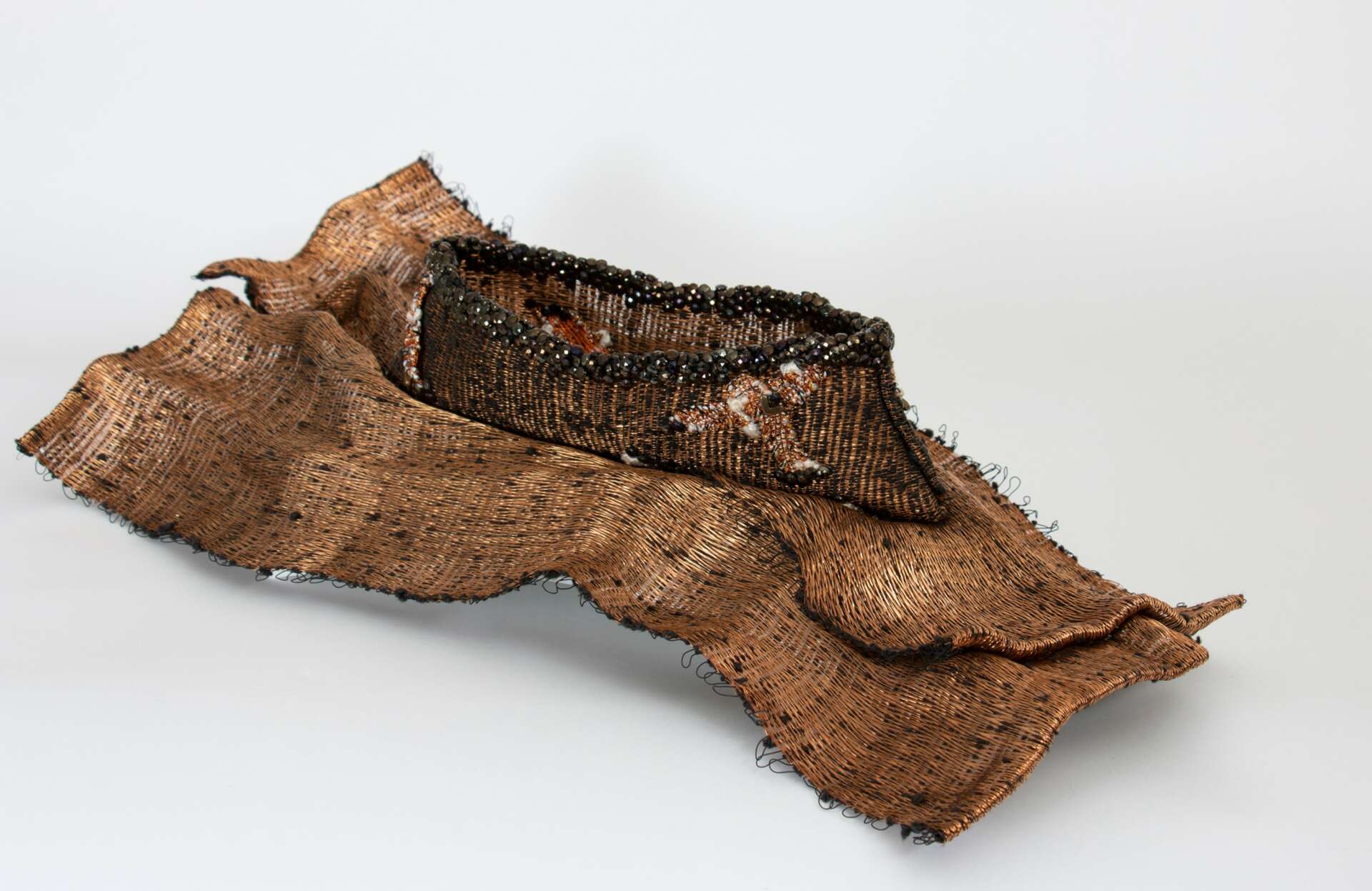 About 30 years ago I took a weekend workshop through the Dallas Handweavers & Spinners Guild led by Donna Kaplan, and I learned how to weave with wire on my floor loom. This workshop instantly changed my weaving life, and for the next 20 years or so, I ONLY wove with a wire warp on my loom! I call the material I create a woven metal fabric. The wire in the warp and weft, along with a fiber weft, create a material that is strong and can be manipulated and sculpted into three dimensional objects such as jewelry, basketry, sculpture, and wall art. It is a very exciting material that seemingly has no boundaries of creative possibility.