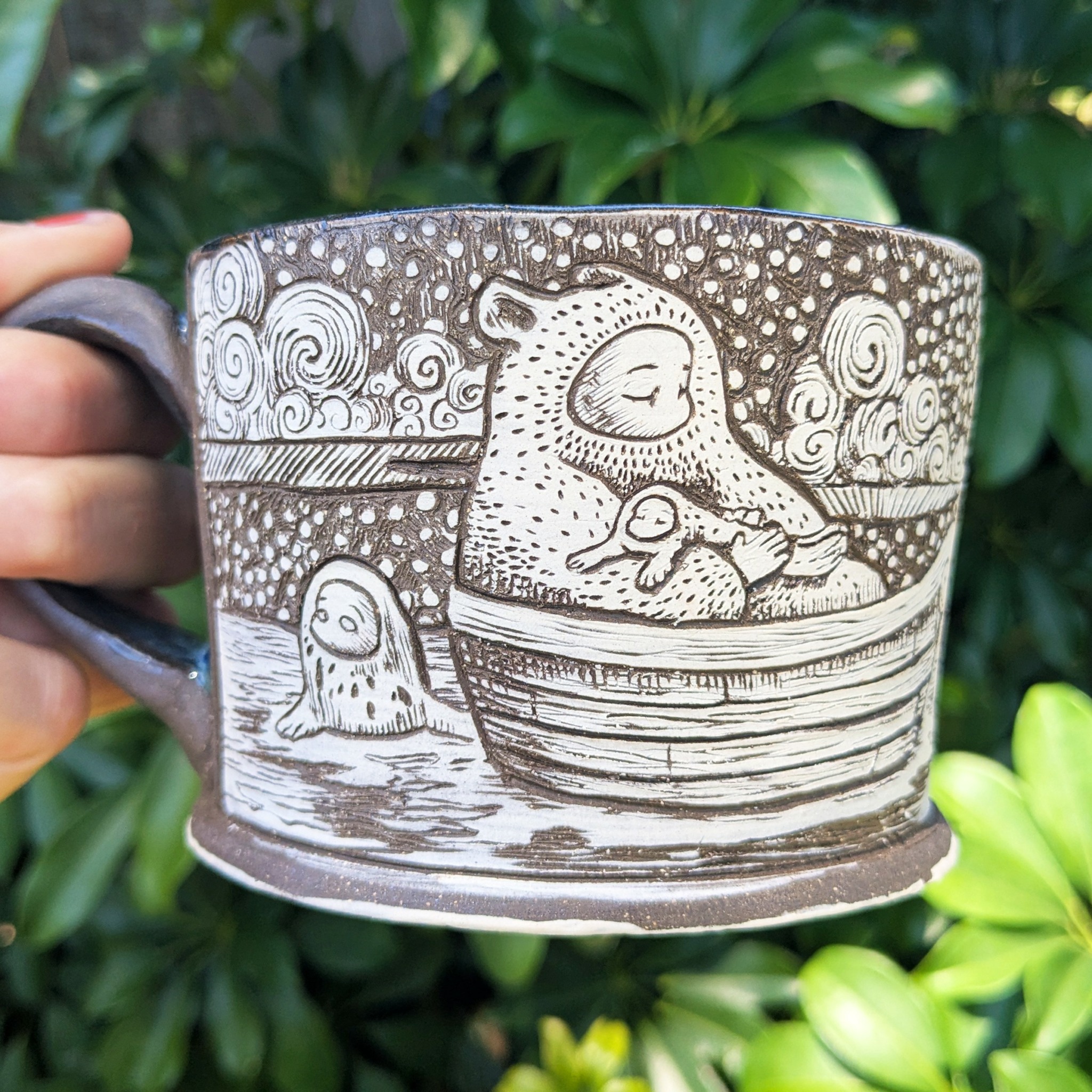 I have been making and sculpting since I was probably 11 years old. I have always loved and been inspired by small, detailed things. My family is very Catholic, and growing up my grandma would craft Faberge eggs for each milestone. Our baptism, our first communion, confirmation, etc.. She also made them into Christmas ornaments and home decor. I loved the little dioramas she would create inside the eggs. When I was in college, I earned my degree in Illustration, but I adored my ceramics class. When I should have been working on my senior portfolio for my major, I would sneak down to the ceramics studio and continue to play with clay. When I moved to Chicago after school, I got a job at Lillstreet Art Center in Ravenswood, where I was able to spend a lot of my free time in the clay studio, and that is where things took off for me. After a few years of working there, I built my portfolio up enough to begin applying to residencies, and I was accepted into the one at the Morean Center for Clay in Saint Petersburg, Florida. I have been working on my craft here since. I jump between functional work, detailed and elaborately illustrated mugs, and sculptural work that was heavily inspired by my grandmother’s craft.