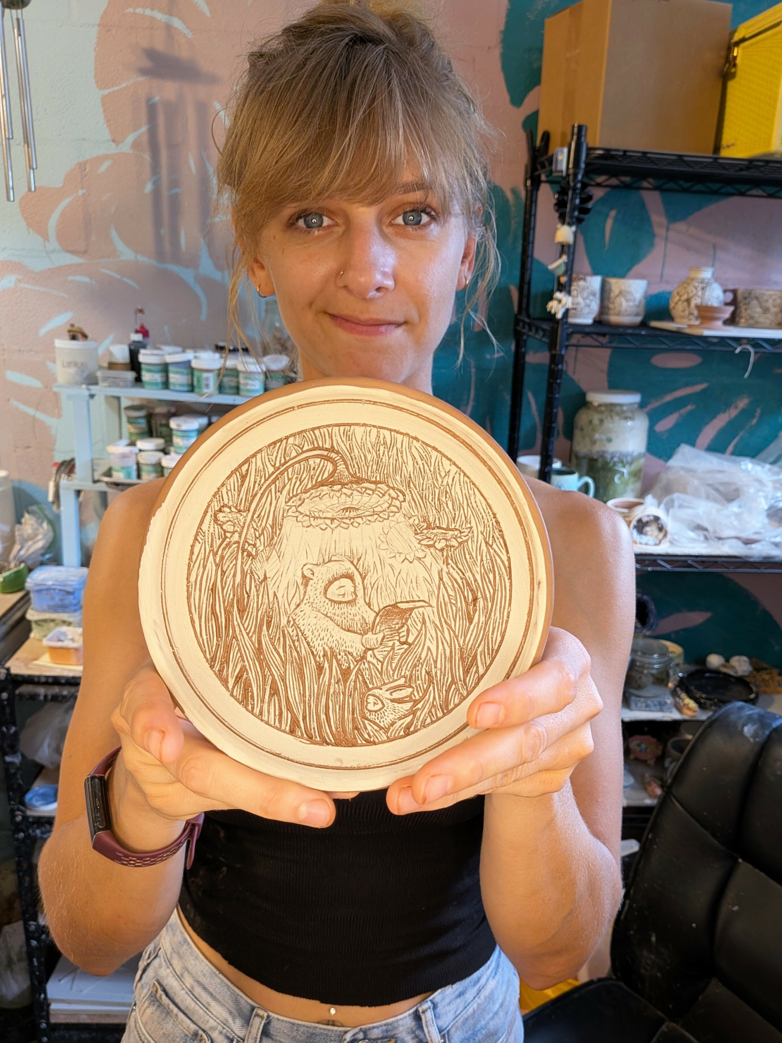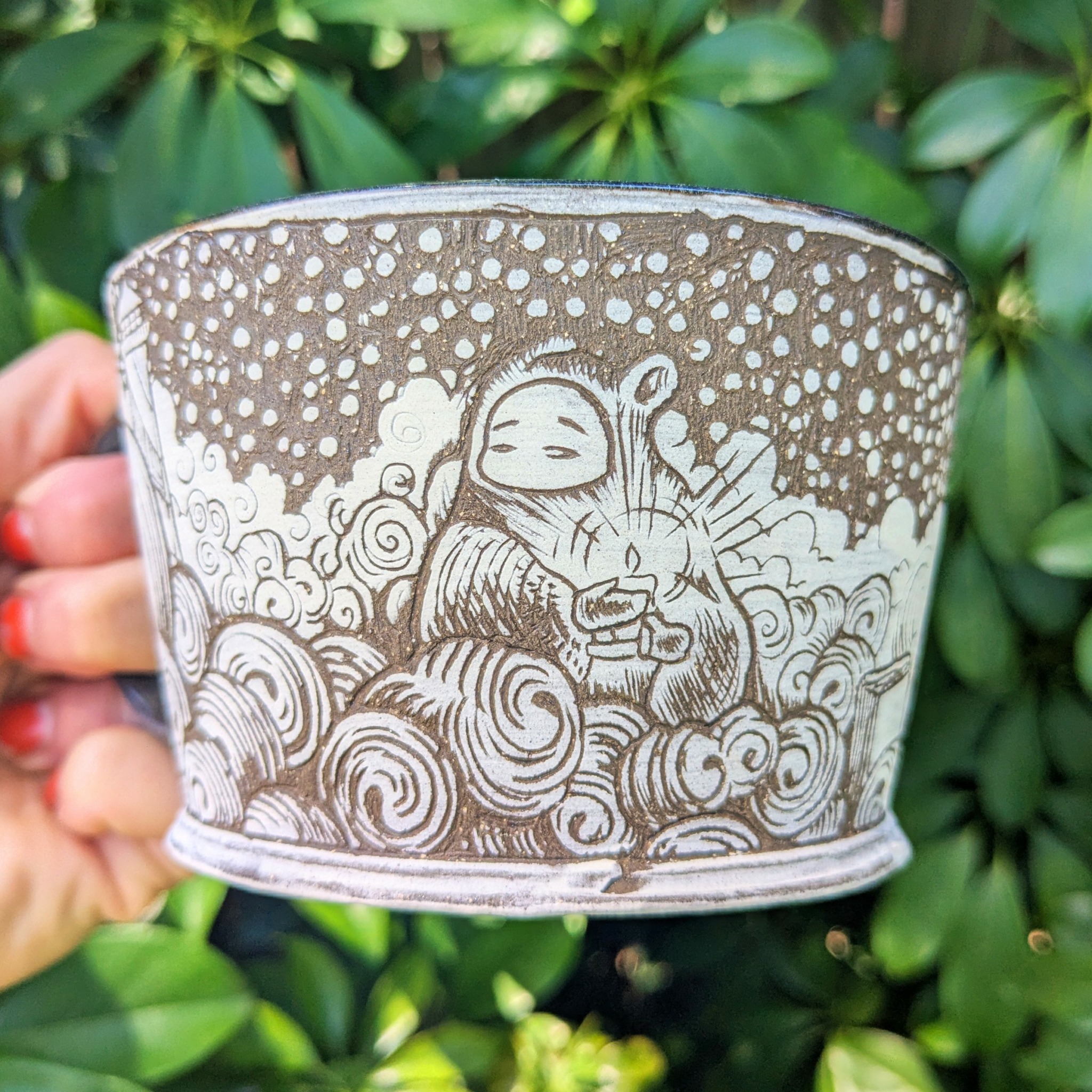 I have been making and sculpting since I was probably 11 years old. I have always loved and been inspired by small, detailed things. My family is very Catholic, and growing up my grandma would craft Faberge eggs for each milestone. Our baptism, our first communion, confirmation, etc.. She also made them into Christmas ornaments and home decor. I loved the little dioramas she would create inside the eggs. When I was in college, I earned my degree in Illustration, but I adored my ceramics class. When I should have been working on my senior portfolio for my major, I would sneak down to the ceramics studio and continue to play with clay. When I moved to Chicago after school, I got a job at Lillstreet Art Center in Ravenswood, where I was able to spend a lot of my free time in the clay studio, and that is where things took off for me. After a few years of working there, I built my portfolio up enough to begin applying to residencies, and I was accepted into the one at the Morean Center for Clay in Saint Petersburg, Florida. I have been working on my craft here since. I jump between functional work, detailed and elaborately illustrated mugs, and sculptural work that was heavily inspired by my grandmother’s craft.