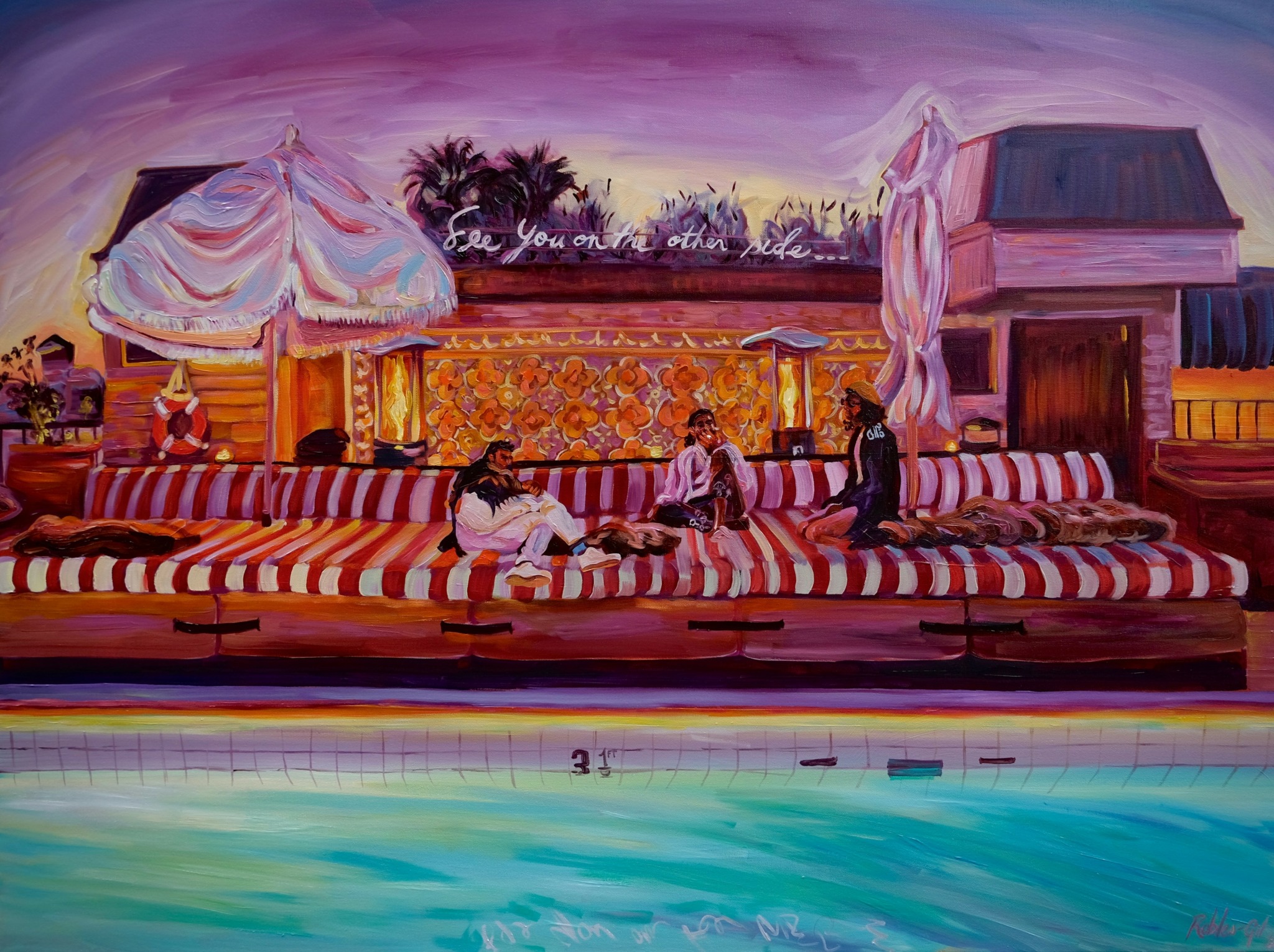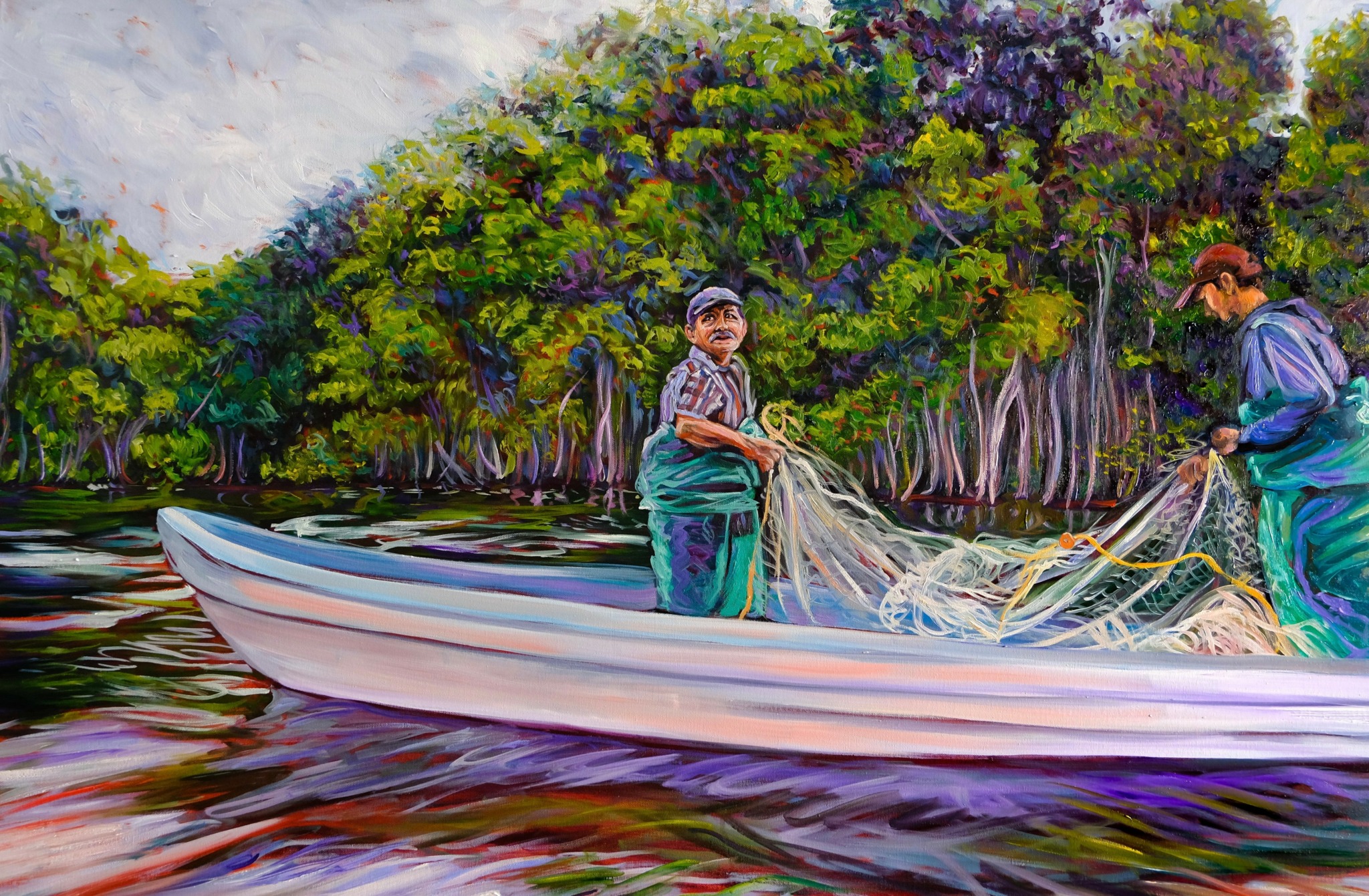 My work is deeply shaped by the places I’ve lived and loved: Mexico, New York, and now, India and the East. I’m drawn to moments where raw life and beauty intersect: fishermen in Mexico pulling in their nets, the energy at a techno music concert, children running at the beach, or women gathering in the glow of a Moroccan dinner. I paint scenes I’ve personally lived, infusing them with memory, symbolism, and the colors that carry their frequency. The result? Works that capture both the intimate and the collective: the joys, pains, and emotions we’ve all experienced.