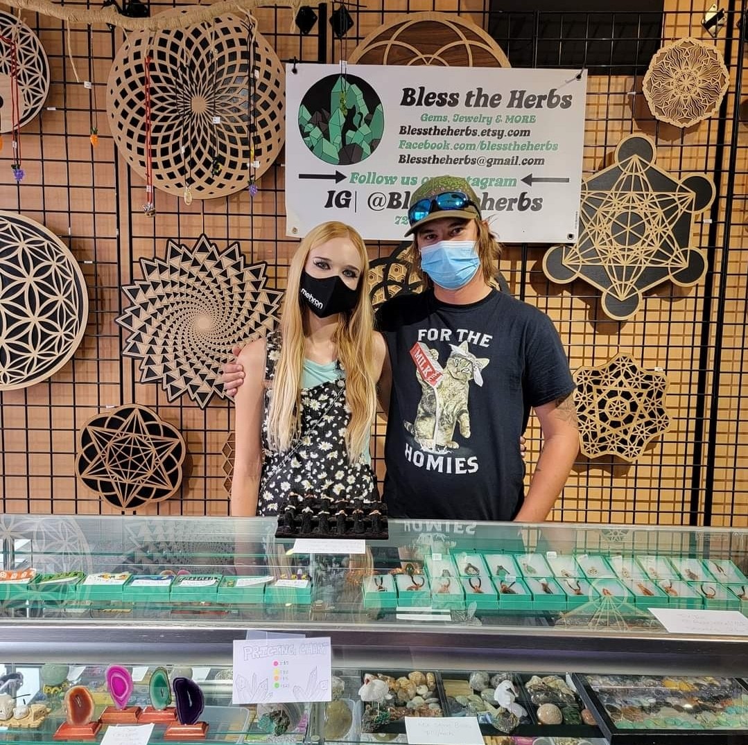 My name is Cody Cook, owner of BTH Gems and Jewelry LLC (Bless The Herbs) a Colorado based business. I specialize in gemstones, lapidary/stone cutting, jewelry and incense. I’m accompanied by my fiance and business partner Marissa “Missy” Miller who specializes in clay work and jewelry. When I first began my small business journey, I was primarily creating wire wrap jewelry. I progressed further by investing in my lapidary machinery which led to my ability to cut and polish stones. As time went on, I implemented silversmith skills learned from high school classes back into my jewelry. I’ve had the opportunity to self collect many of the stones in our shop/personal collection, adding “rockhound” to the list of many titles achieved in my time as a business owner. Missy took her love of sculpting into the shop when she first invested in her vast polymer clay set up. She’s created hundreds, if not thousands of intricate sculptures and jewelry pieces during our time together. I am extremely proud of the exponential growth of my brand. We have skyrocketed on social media to 15.8k followers on Instagram, our main selling platform. We offer live sales weekly, and love actively engaging with our clients. We’re really one big family of folks who share the same passion for jewelry and crystals.