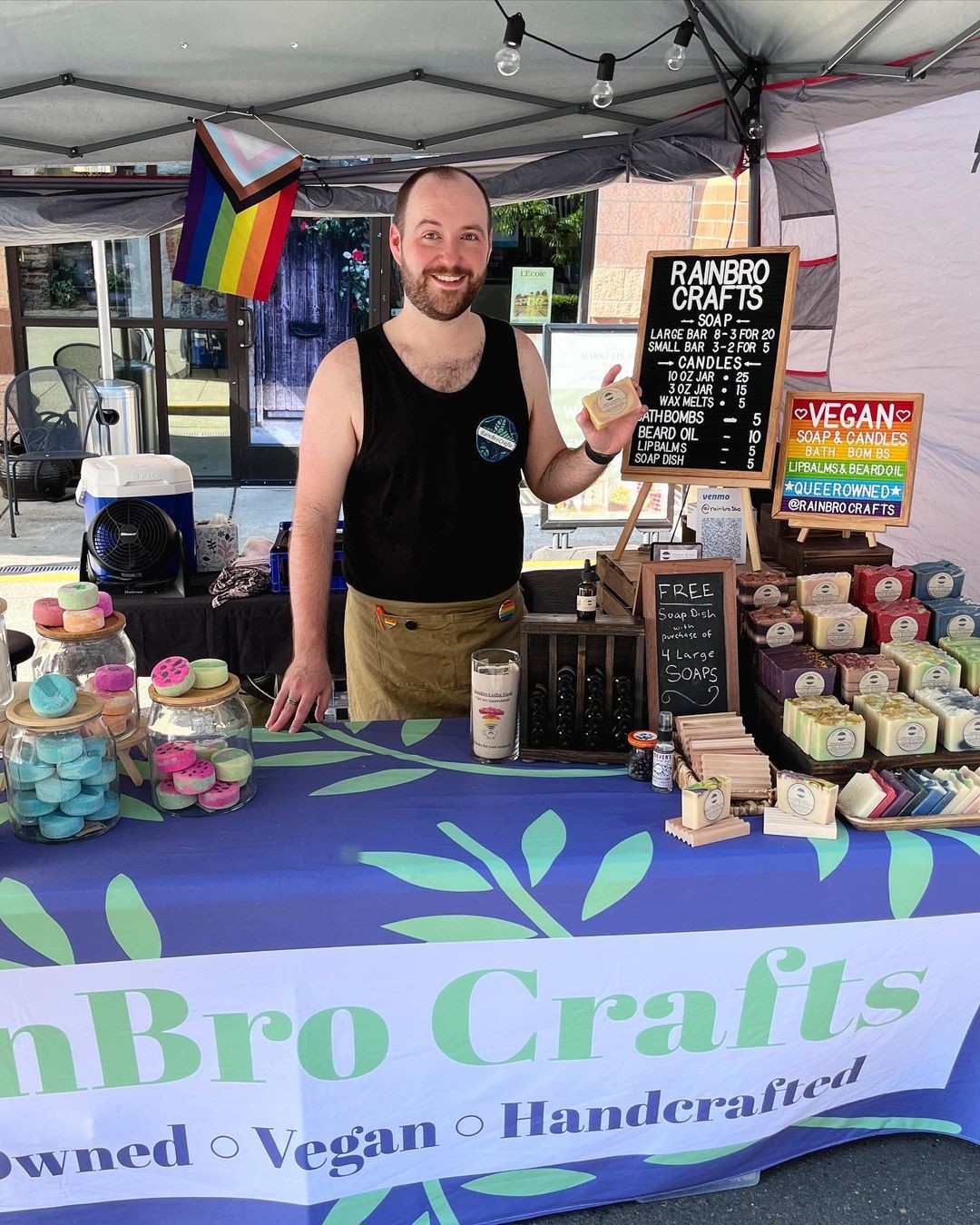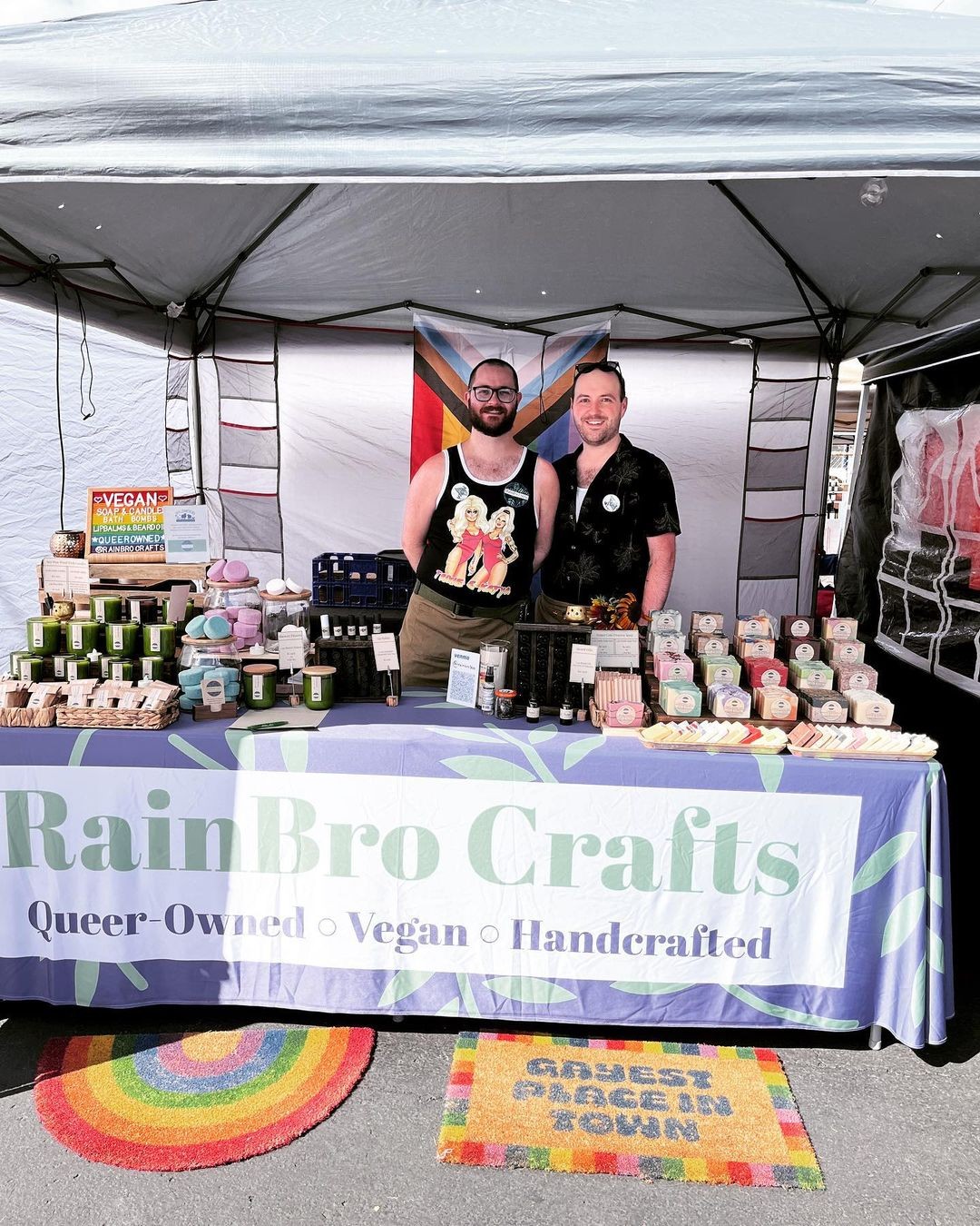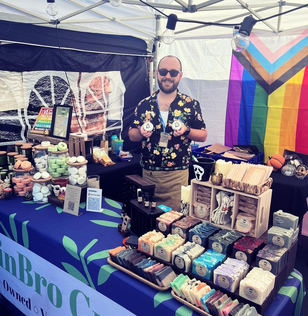 As many of us did in the early days of the pandemic, we spent a lot of time on YouTube. Down the rabbit hole went until we landed on soap making videos. One of our favorite content creators, Katie Carson of Royalty Soaps, recommended a soap making kit for beginners. We ordered a kit and got to work! Our first batch was very successful and we couldn’t wait to make more. After several more batches we had an abundance of soaps and decided to open up an Etsy shop and sell them. We sold out in the first week and knew we were onto something. We knew we wanted to highlight our products as handcrafted, vegan and from a queer-owned business. Over the next year we began attending flea markets and farmers markets and the reception from our customers was phenomenal. During that time we added several more products, scented candles, bath bombs, beard oils and lip balms. We now have a dedicated customer base that visit us at our markets as well as our online store www.rainbrocrafts.com.