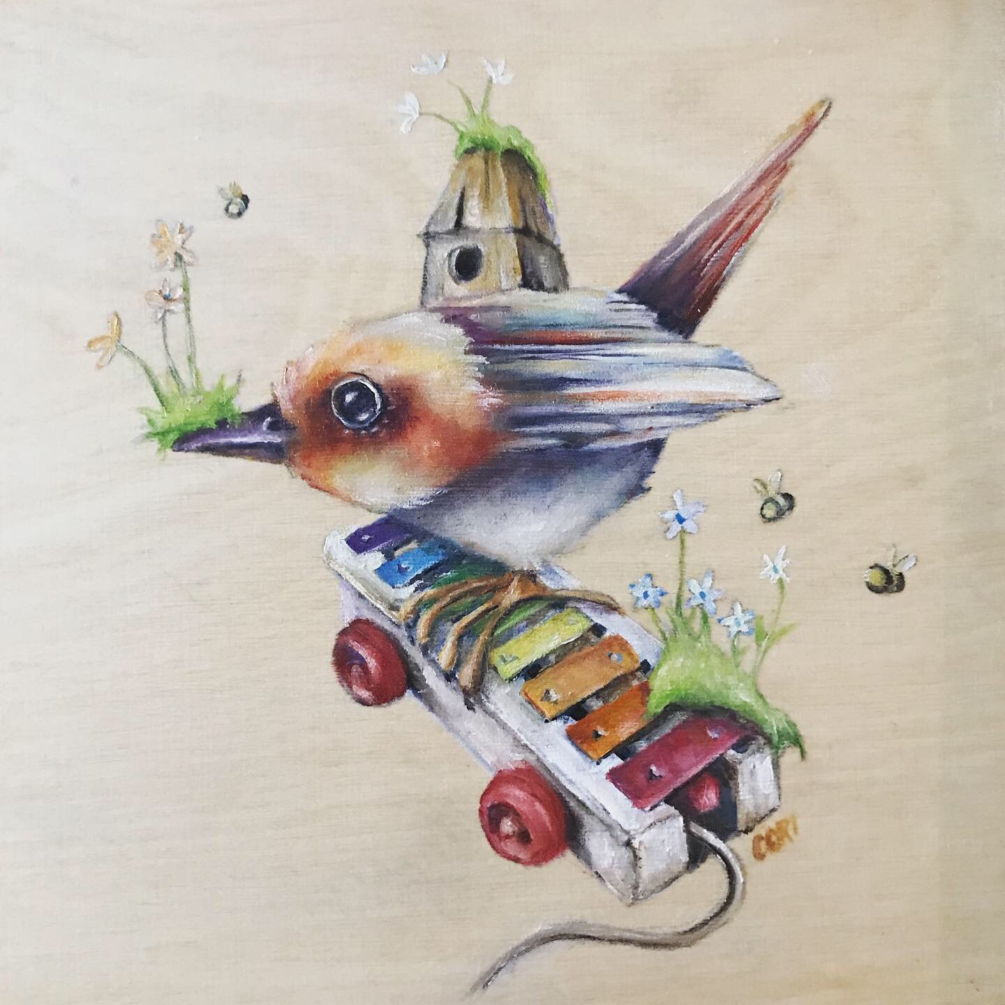 My work tends to be narrative or have a touch of surrealism. I love animals and nature, and use these images in my artwork alongside exploring the relationship humans have with one another and the world we live in. I also share process videos, teach classes on technique and take commissions. Most recently I’ve begun to make my own paints and will soon be offering these to others interested in using handmade, high-quality paints. My first paints use locally sourced pigments from the Pacific Northwest. I recently took a trip that allowed me to see the areas the pigments came from and I’m looking forward to sharing new paintings with the paints made from these pigments. When I began painting, so many of the materials were toxic and the air filtration systems were not very good. As I’ve continued in my practice, it’s become very important to me to find healthier and non-toxic materials, both for personal health and for the health of the earth.