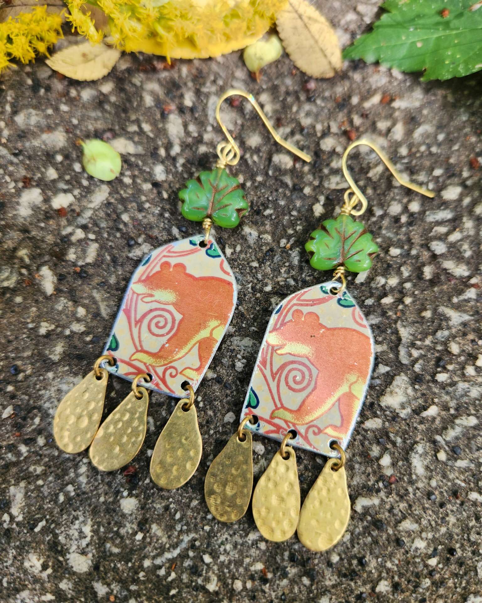I create unique, handcrafted jewelry with a boho flair! My grandmother (Meme) loved to use the term “wearable art” and it is definitely a goal of mine for everything I make to be a piece of wearable art rather than just jewelry. I never exactly replicate anything I make–each piece is a true one of a kind! Although I’m always trying new ideas, I would say that I have a few signature collections, including my beaded fringe earrings, feather earrings, hammered brass and gemstone earrings, my Boho Bangle bracelets, and jewelry cut from vintage tins. I love to combine interesting textures and unexpected color combinations. I also love using textiles in my jewelry. I have a lot of people tell me that wearing my jewelry just makes them happy, and that is what I’m most proud of! To make something that makes someone else feel happy and beautiful is an amazing feeling!